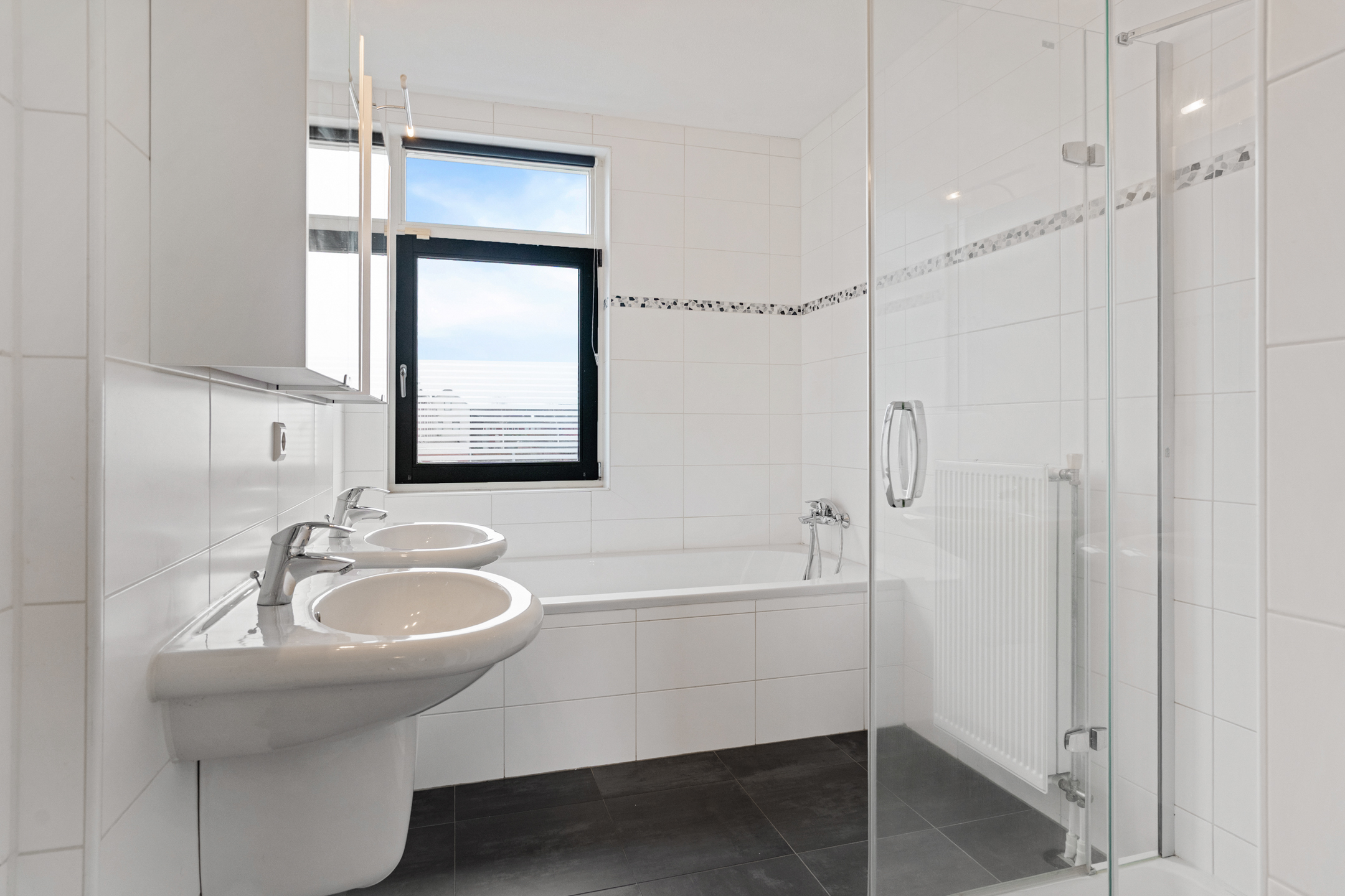 De badkamer is compleet uitgevoerd met een ligbad, douchecabine en dubbele wastafel. Daarnaast is er een vernieuwd separaat toilet (2025) op deze verdieping, wat zorgt voor extra comfort.