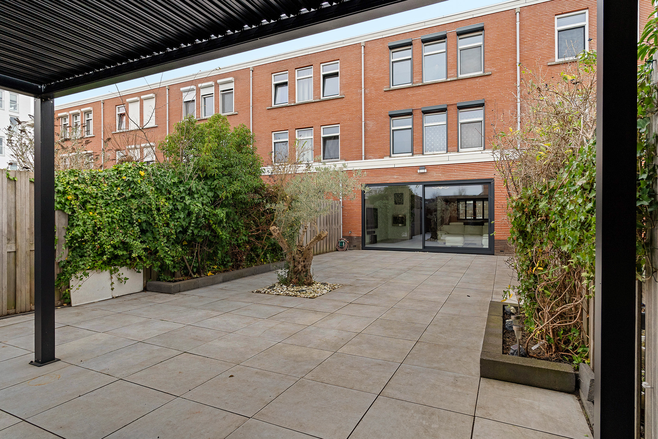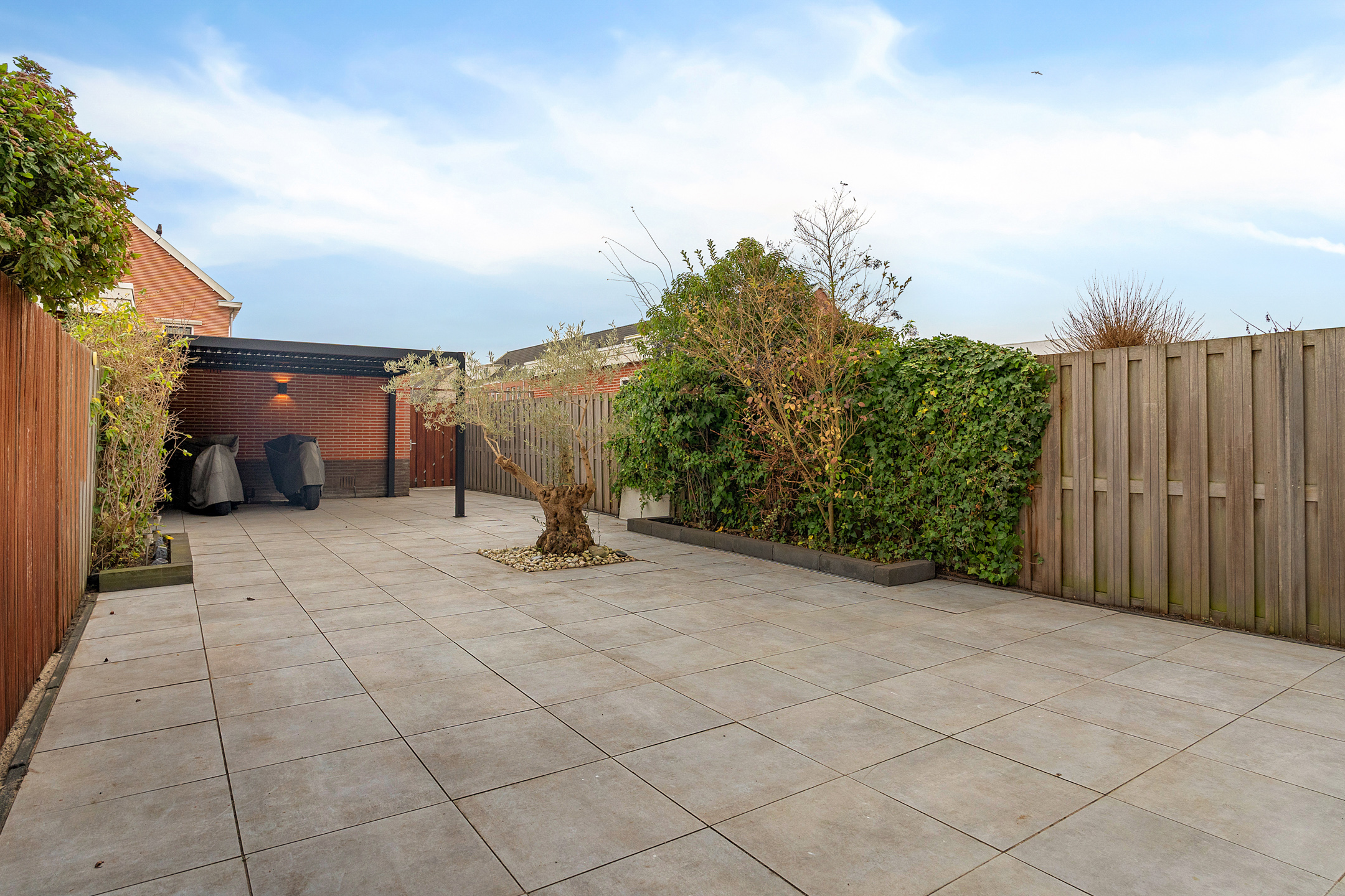De voortuin biedt vrij uitzicht over het Heempark en het Heemkanaal. De achtertuin is gelegen op het zuidoosten, bijna 18 meter diep en onderhoudsvriendelijk aangelegd met bestrating en een karakteristieke olijfboom.