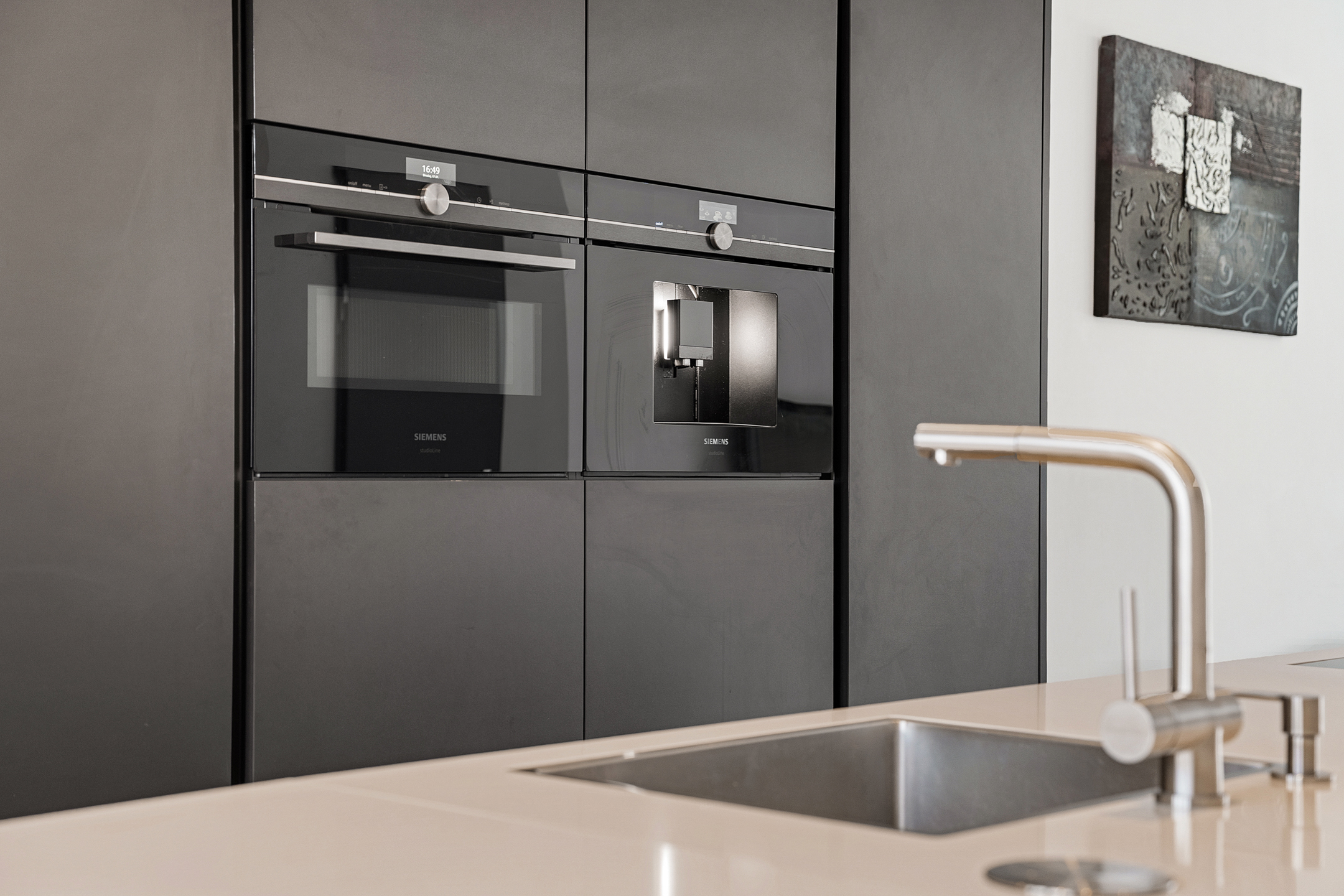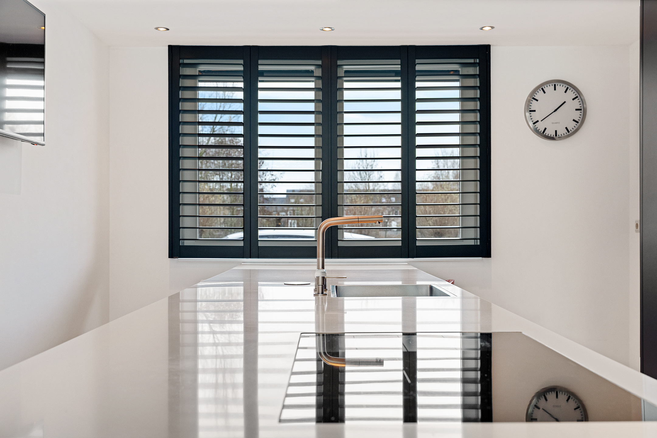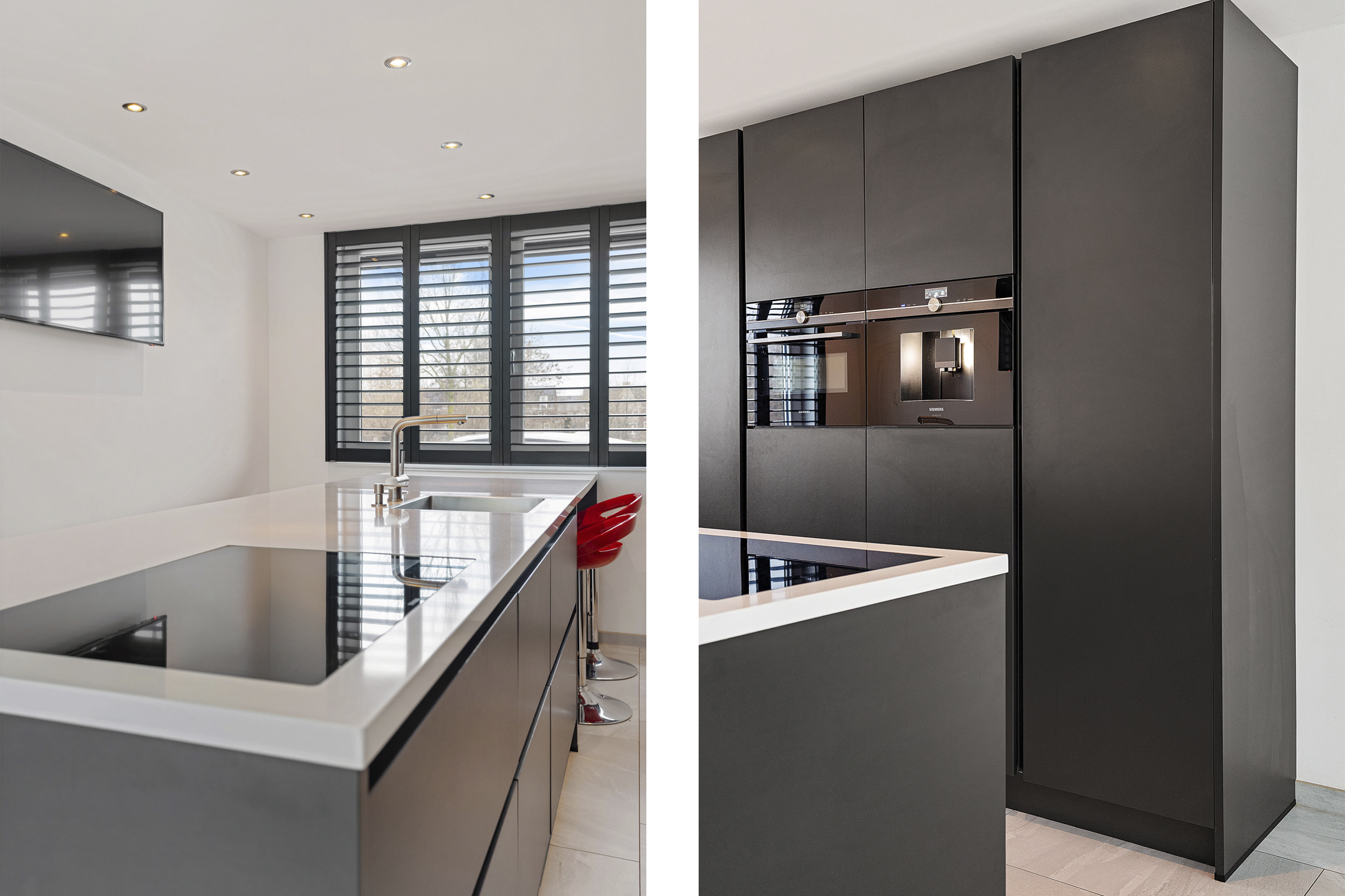 Aan de voorzijde bevindt zich de smaakvolle woonkeuken (2020) met barretje en kook-/spoeleiland. De keuken is uitgevoerd in een moderne, donkere kleurstelling en voorzien van luxe inbouwapparatuur zoals een flex-inductiekookplaat, vaatwasser, koelkast, vriezer, combi-oven en een ingebouwd koffiezetapparaat. Vanuit de keuken is er vrij uitzicht over het Heempark.