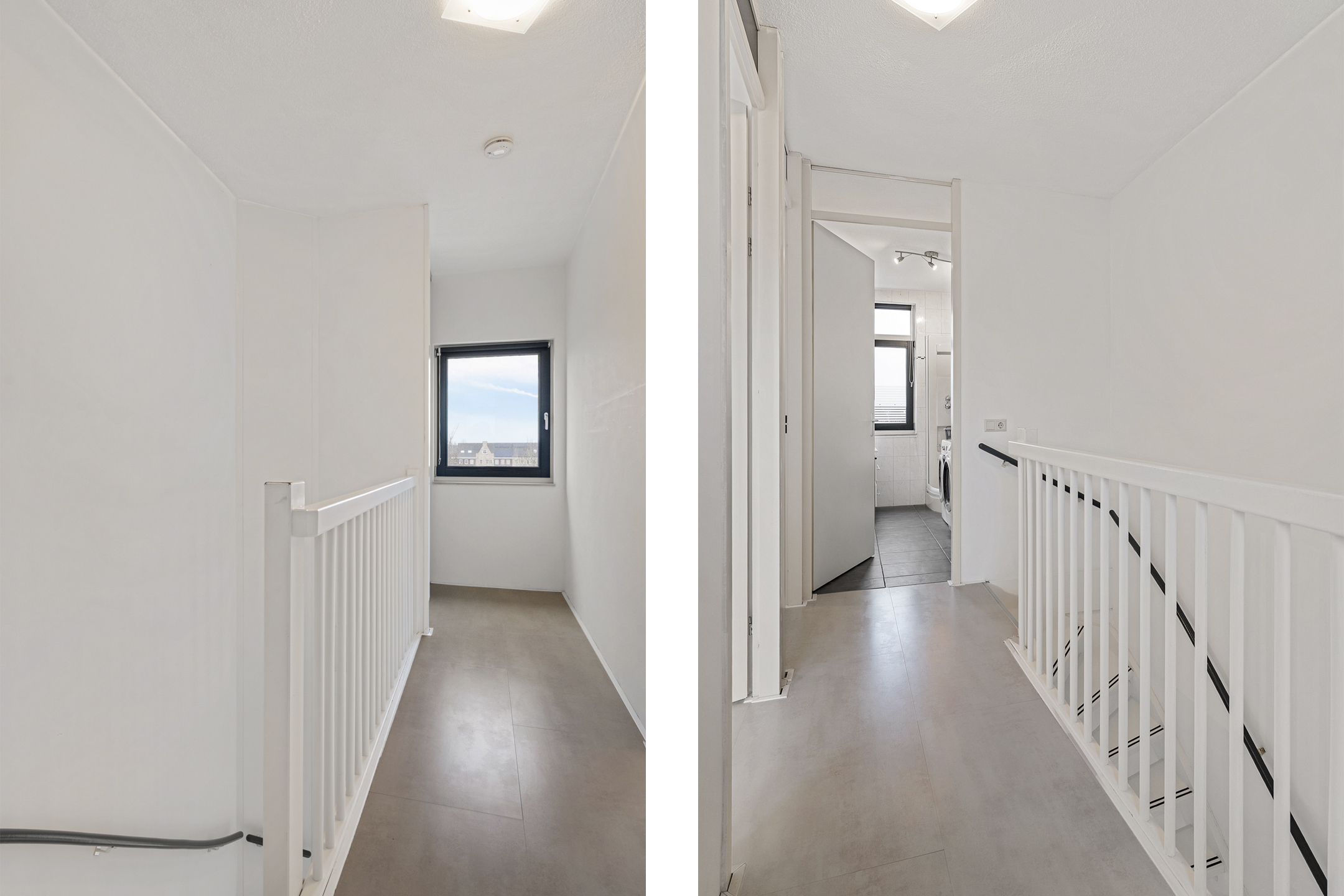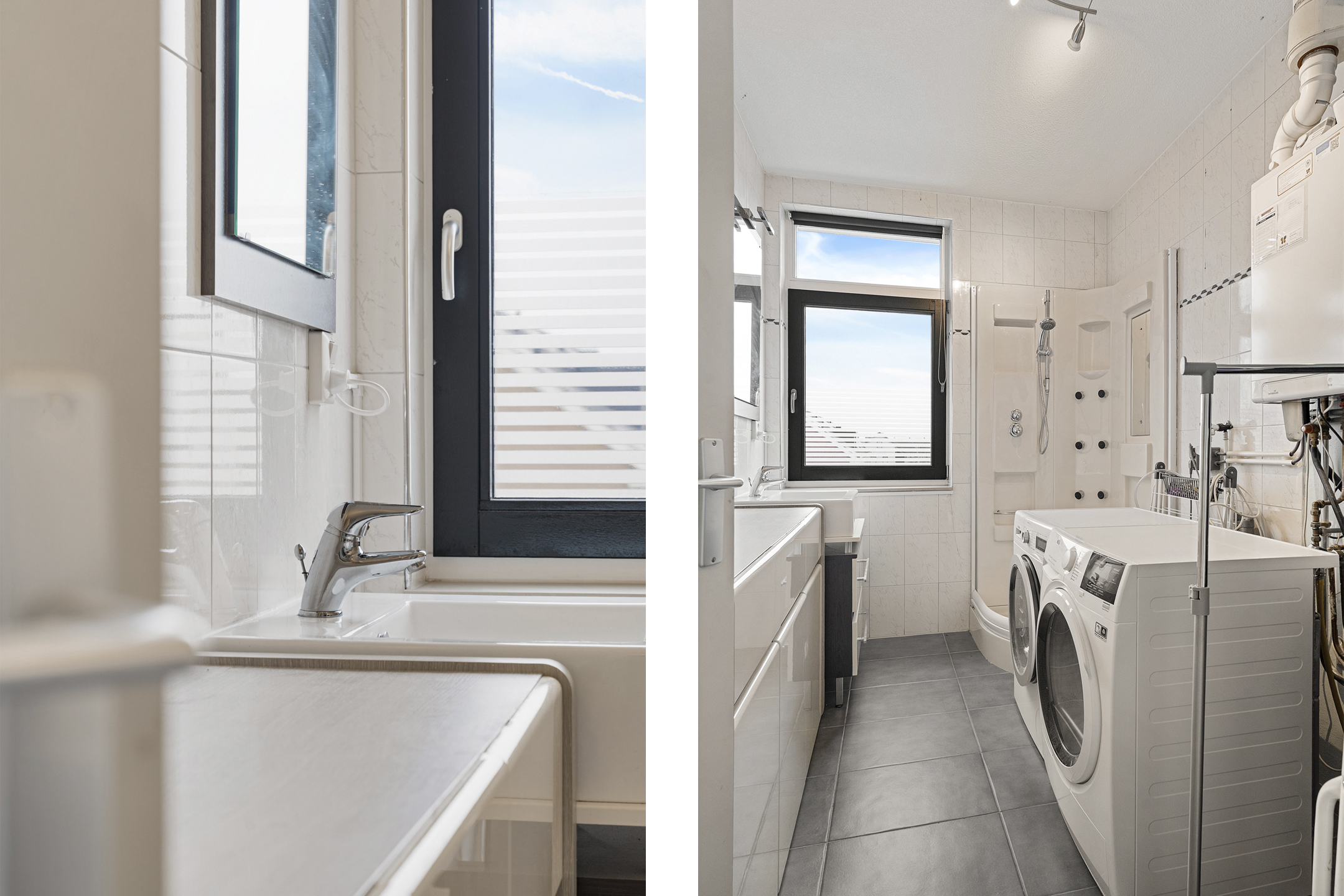Daarnaast is er extra bergruimte op de overloop en een tweede badkamer die tevens dienstdoet als was- en stookruimte, voorzien van een douchecabine, wastafelmeubel en opstelplaatsen voor wasmachine, droger en installaties.