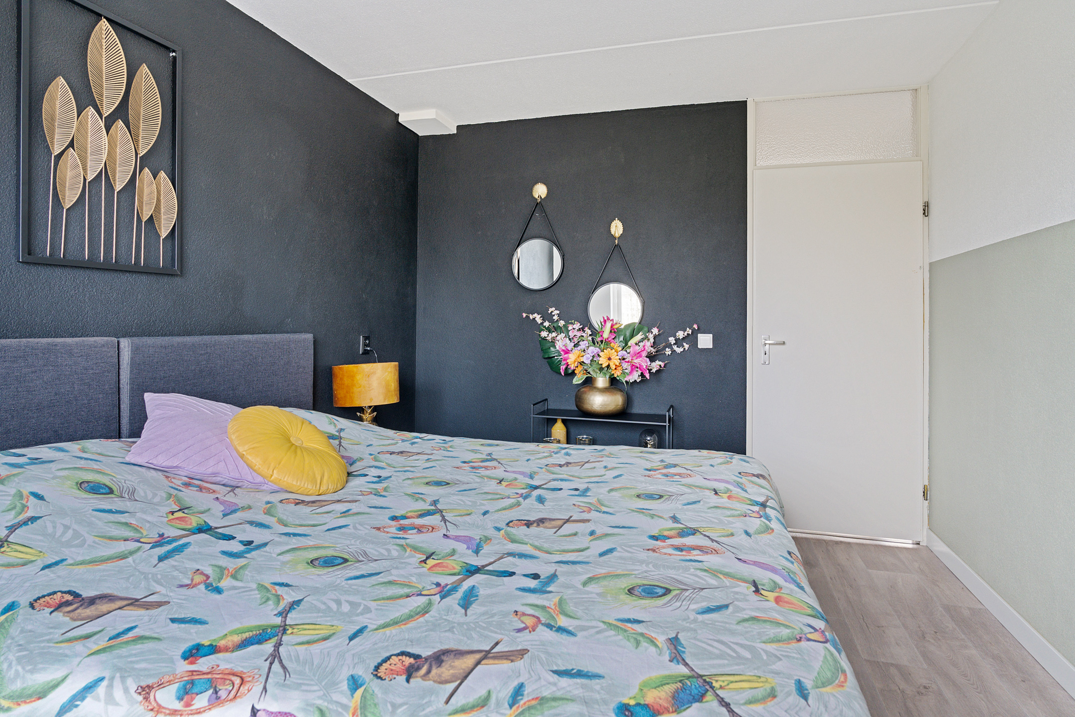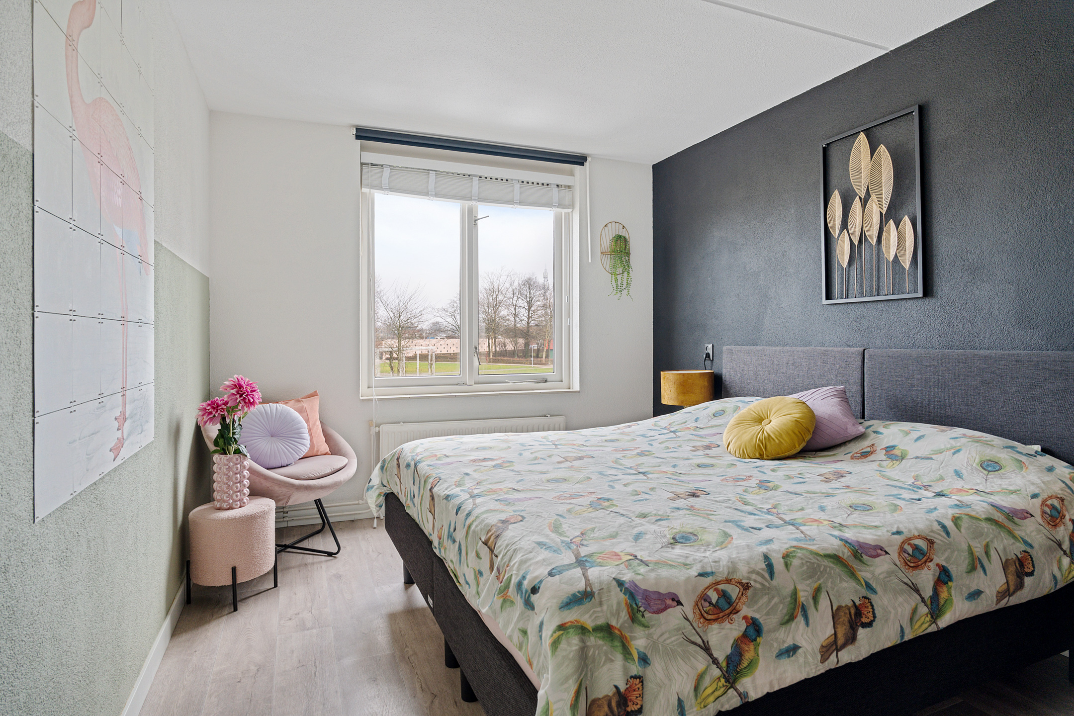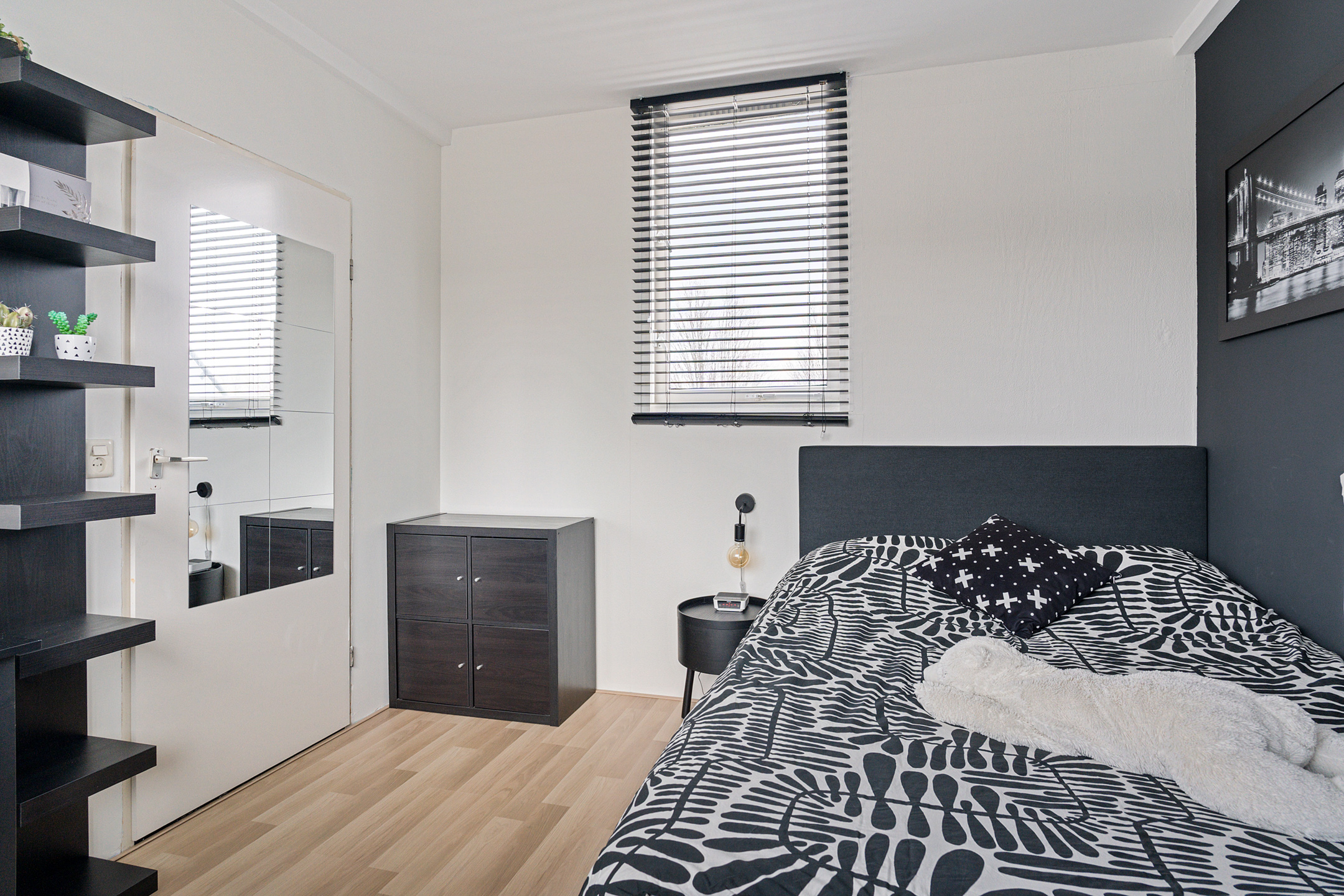 Vanaf de overloop heb je toegang tot drie slaapkamers en de badkamer. Aan de achterzijde bevinden zich twee slaapkamers van circa 10 m² en 7 m². De ruime slaapkamer aan de voorzijde is ongeveer 12 m² groot. De gehele verdieping is afgewerkt met een nette vloer, wat zorgt voor een verzorgde en rustige uitstraling.