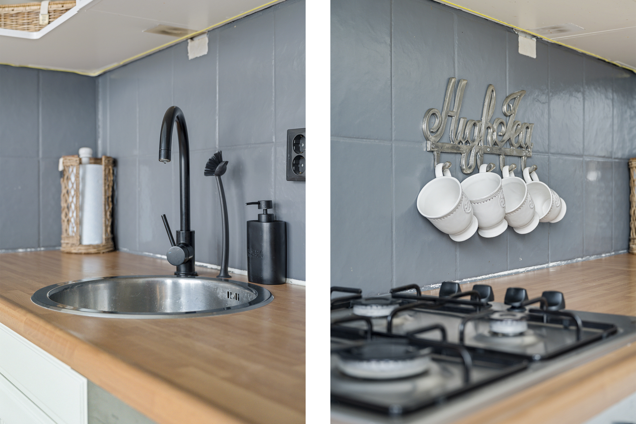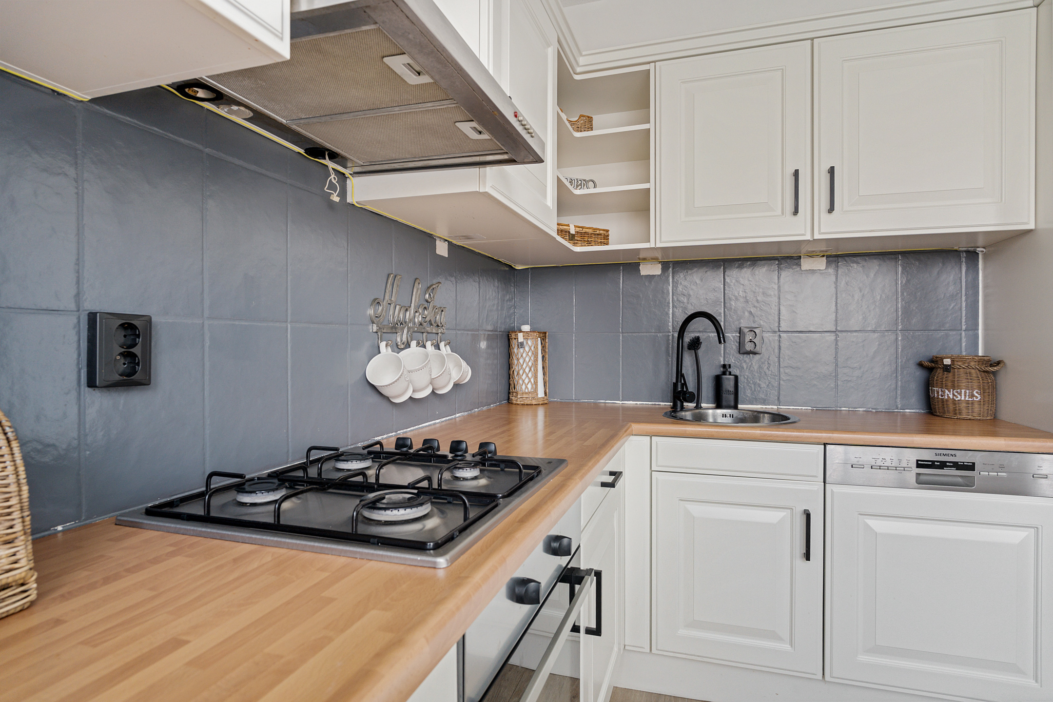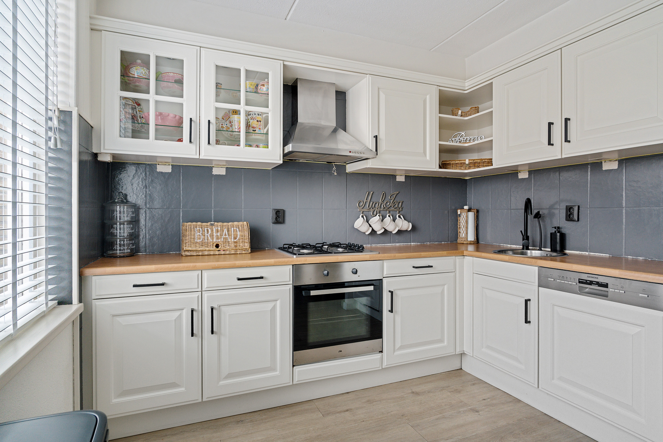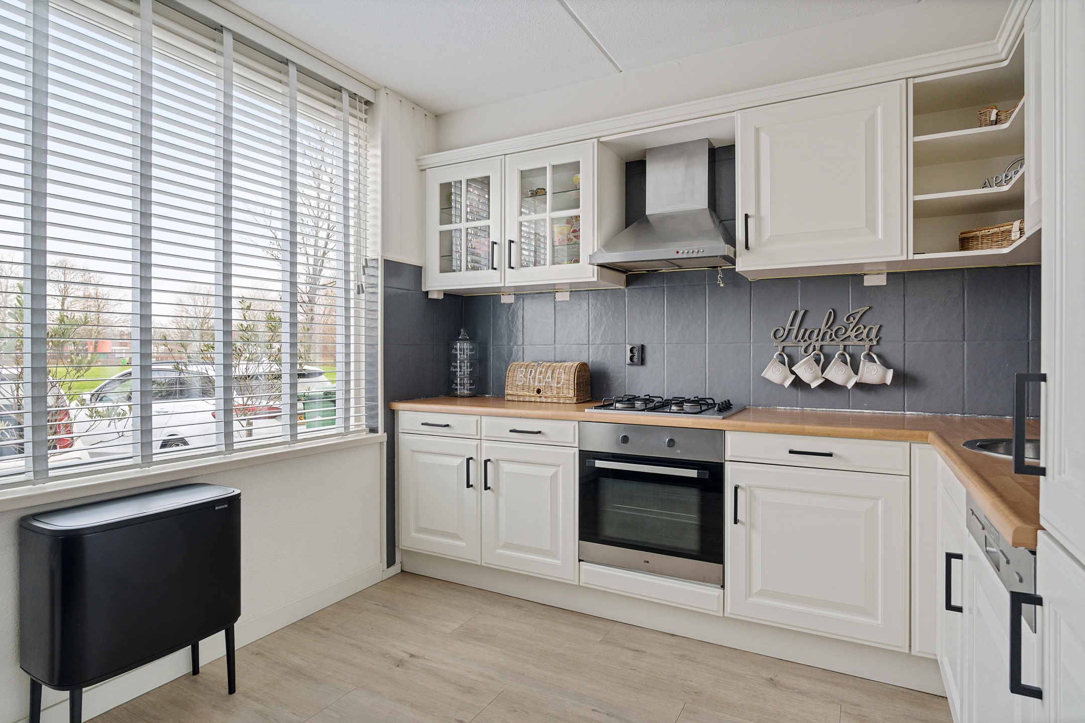 De keuken is uitgevoerd in een lichte kleurstelling en heeft een praktische opstelling. Uiteraard is deze voorzien van diverse inbouwapparatuur, waaronder een koelkast, vriezer, oven, vaatwasser en een gaskookplaat.
