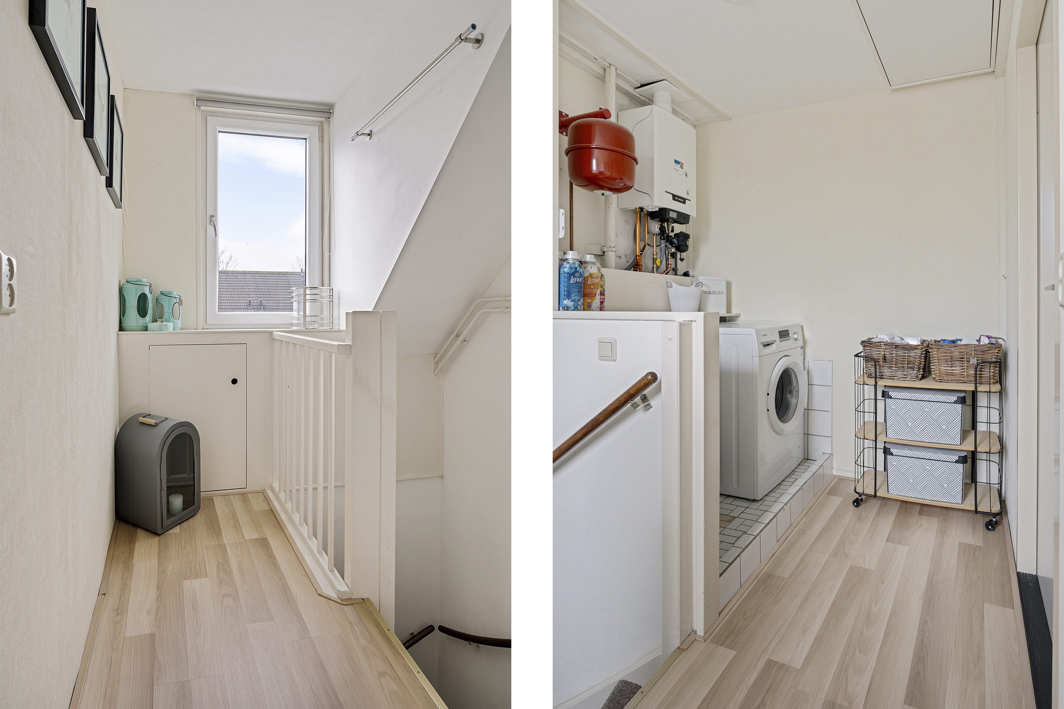 Via een vaste trap bereik je de zolderverdieping. Op de overloop vind je de opstelling voor de wasmachine en droger, evenals de cv-installatie.