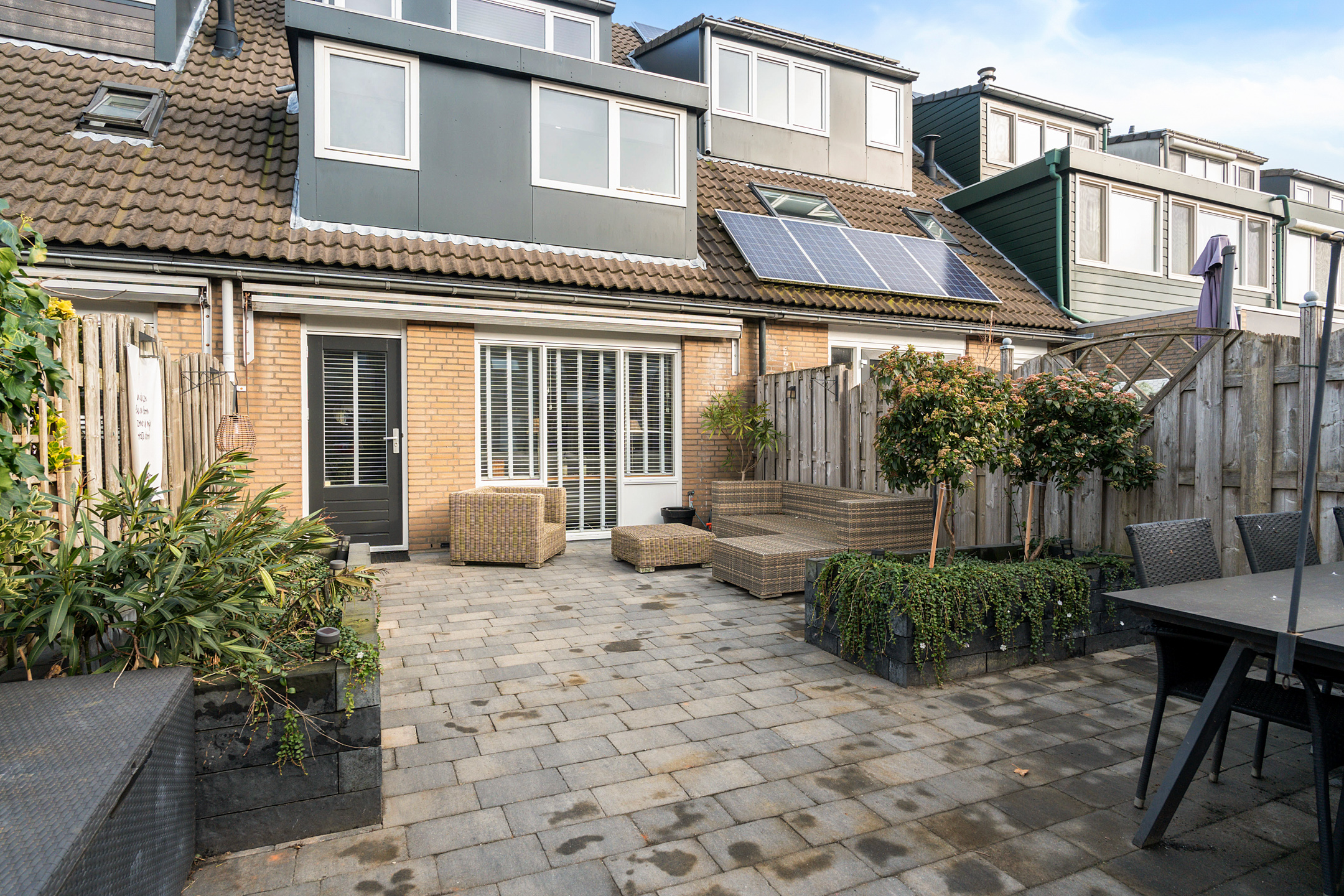 De fraai aangelegde achtertuin ligt op het zuiden, waardoor je hier de hele dag door volop van de zon kunt genieten. Het is een heerlijke plek om te ontspannen, gezellig buiten te eten of lange zomeravonden door te brengen.