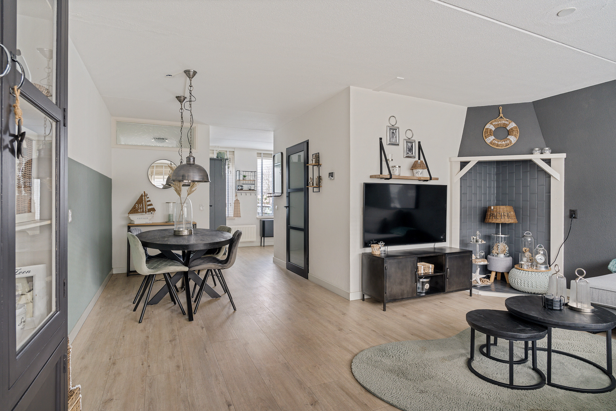 Via de entree kom je in de hal met de meterkast, het toilet en de trap naar de eerste verdieping. Vanuit de hal loop je door naar de ruime en lichte woonkamer. Dankzij de grote raampartijen aan zowel de voor- als achterzijde profiteer je hier van een prettige, natuurlijke lichtinval. De woonkamer is keurig afgewerkt met een nette PVC-vloer, comfortabele vloerverwarming en strak verzorgde wanden. Daarnaast is er een voorbereide aansluiting voor een open haard, waardoor je eenvoudig extra sfeer kunt toevoegen.