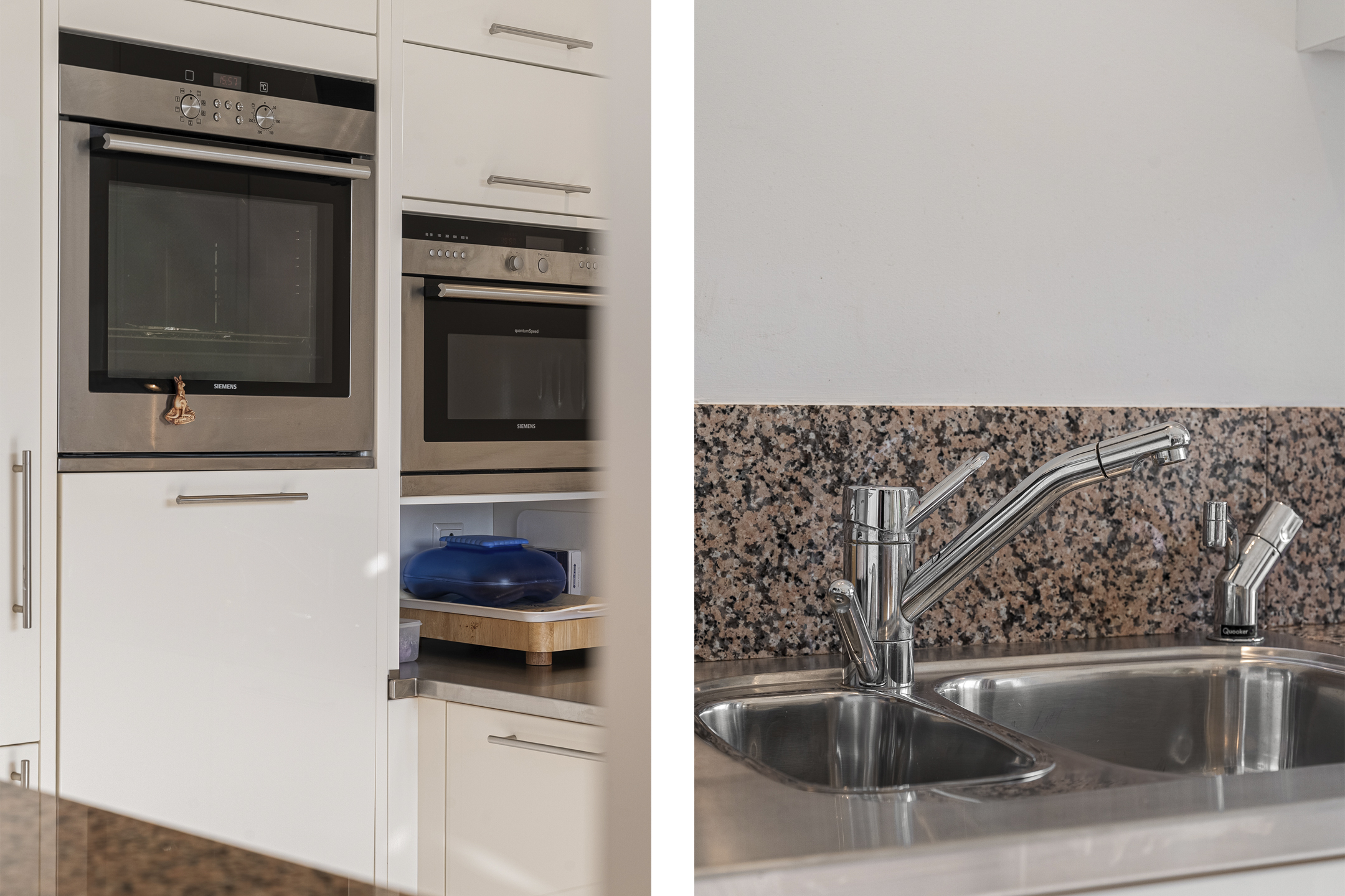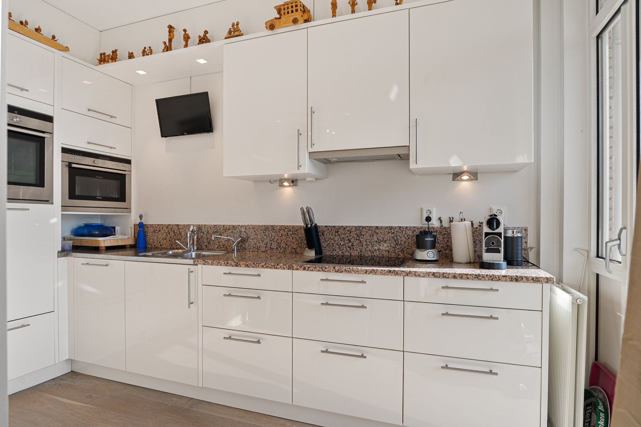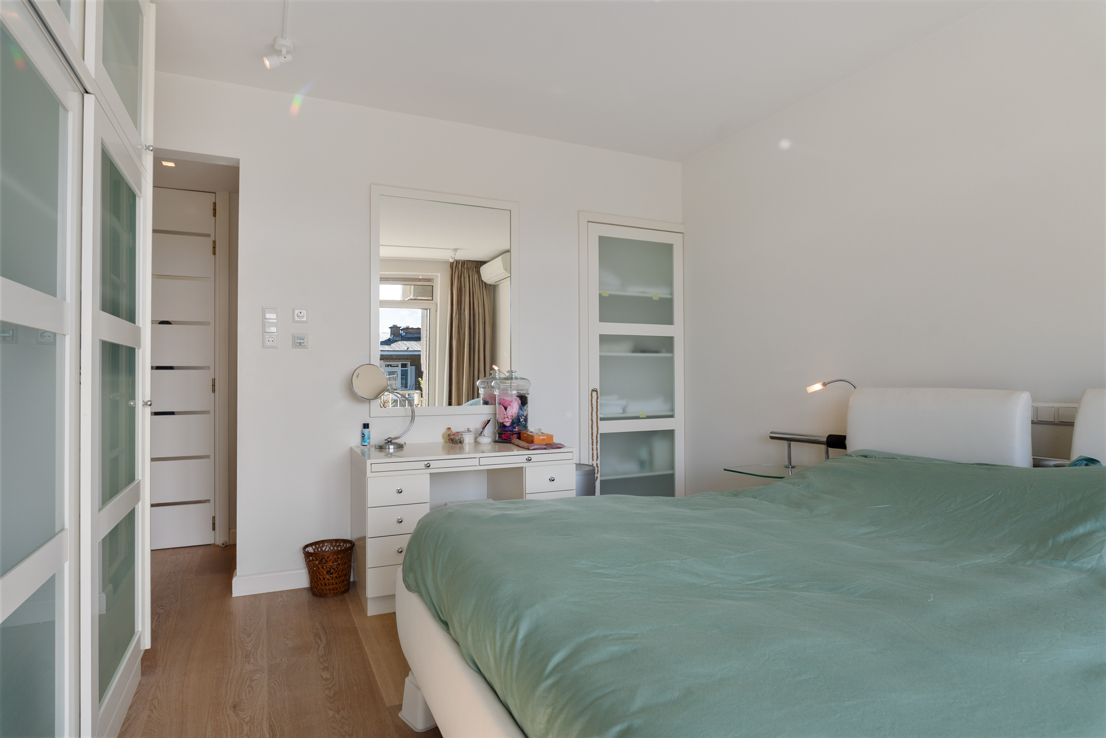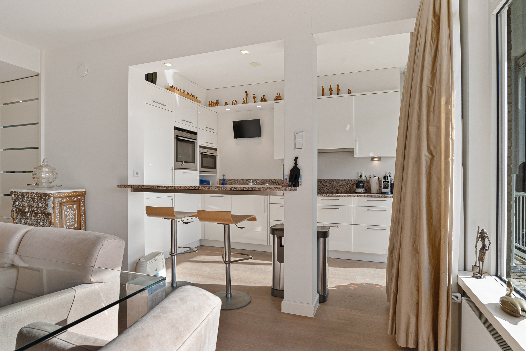 De hoofdslaapkamer beschikt over een maatwerk kastenwand met ingebouwde TV en biedt directe toegang tot het balkon. Voor extra comfort is deze kamer voorzien van een airco-unit. De open keuken is uitgevoerd met Siemens inbouwapparatuur, een vaatwasser op heuphoogte en een gezellige bar. Zowel de hoofdslaapkamer als de leefkeuken en woonkamer hebben toegang tot het royale balkon op het zuidwesten.