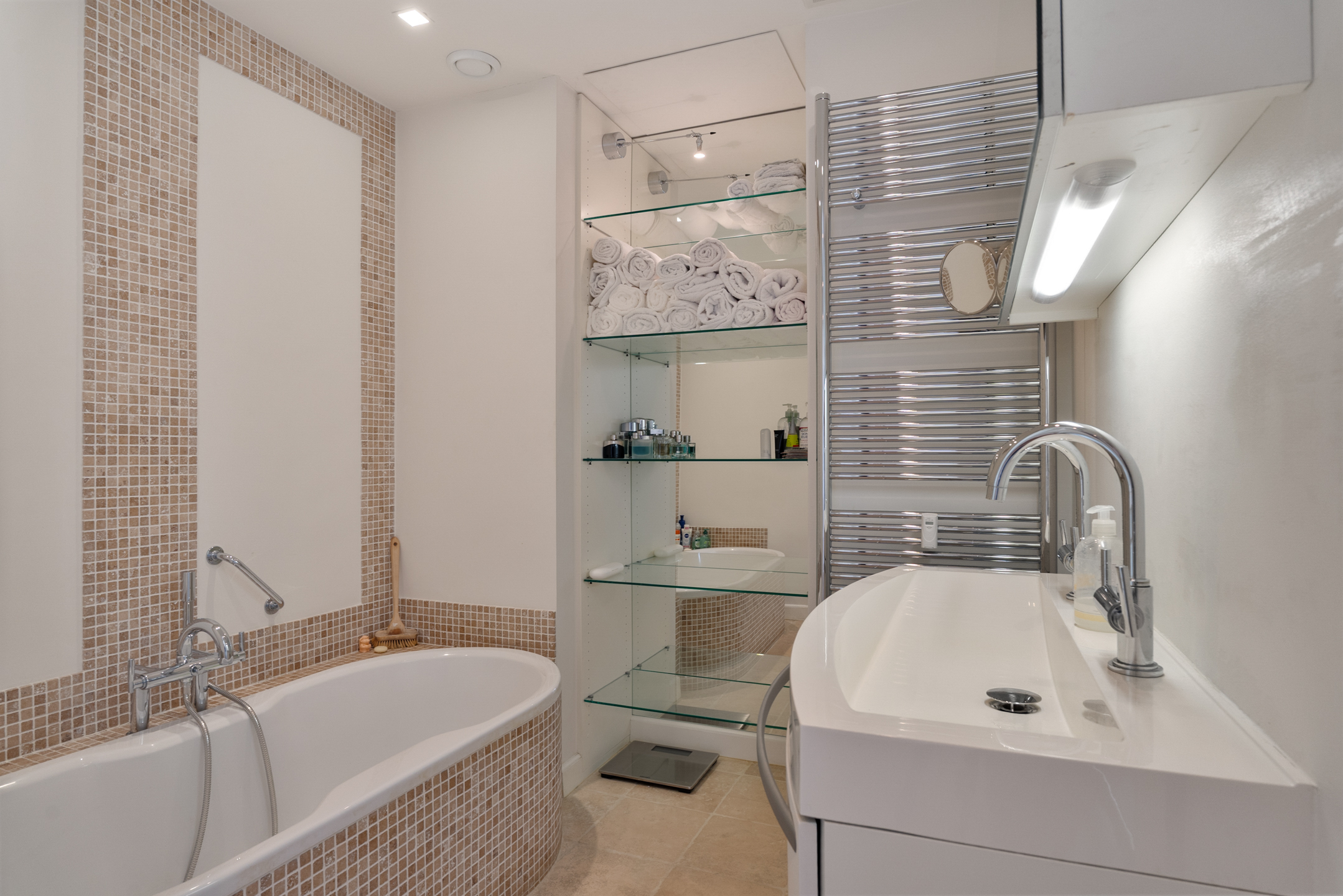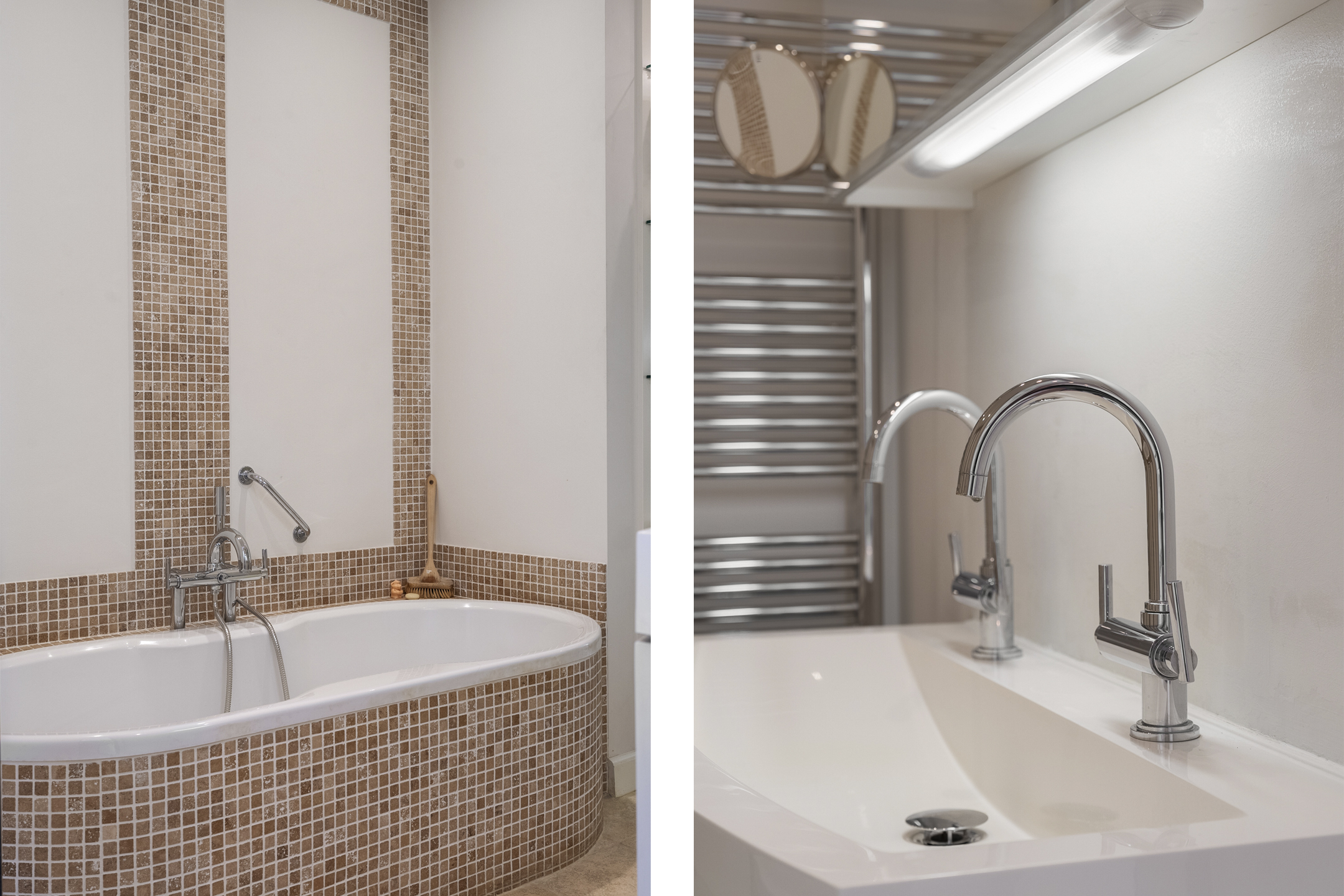 + Badkamer met ligbad, vloerverwarming en royale wastafelmeubel