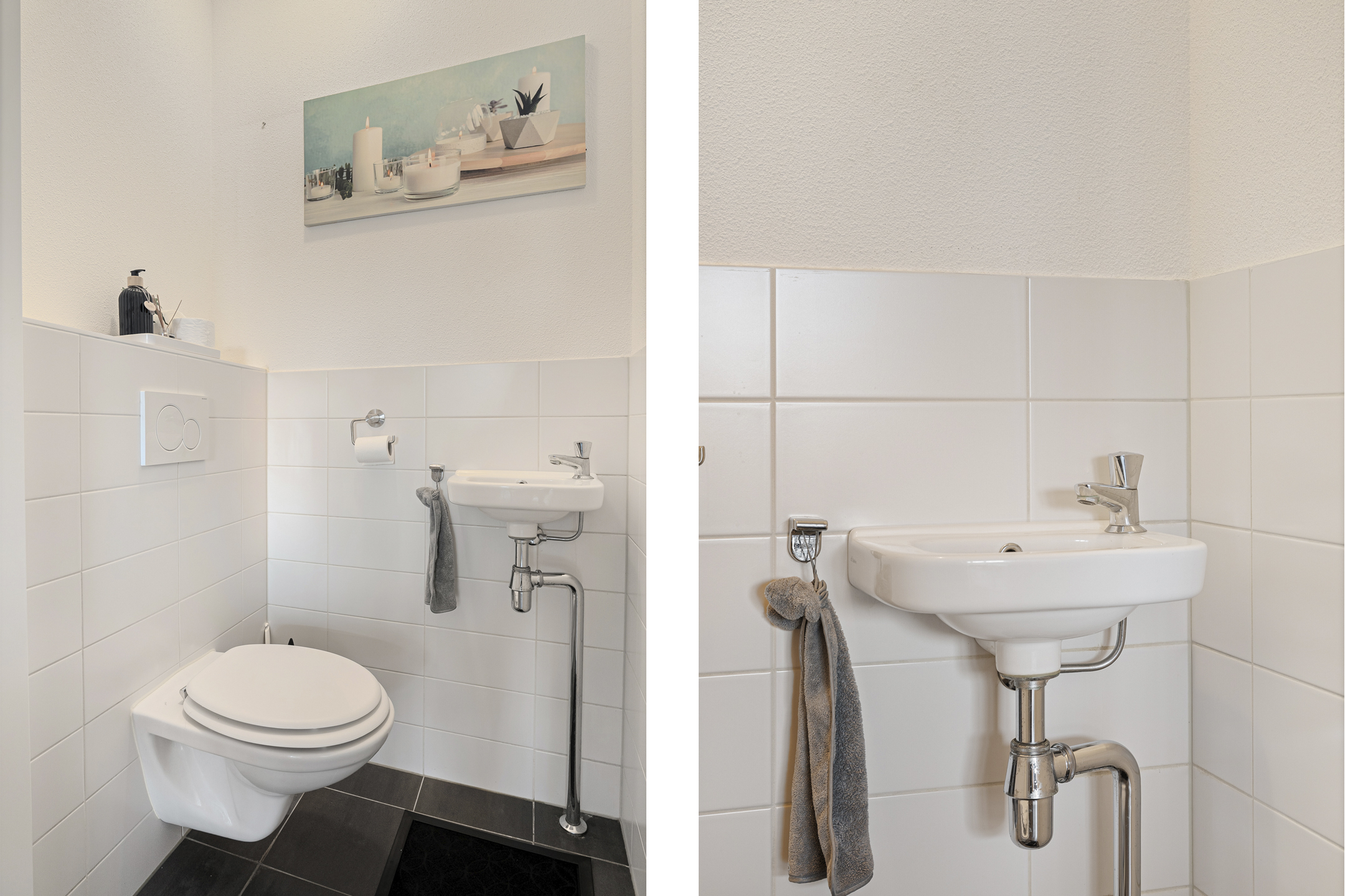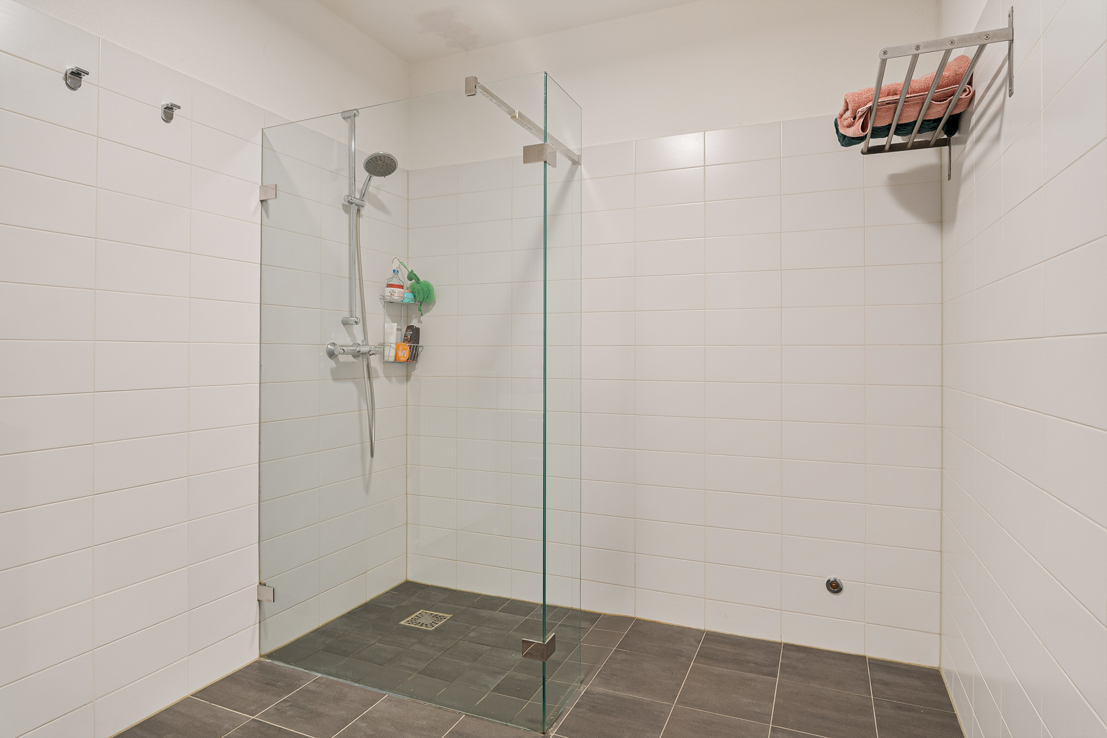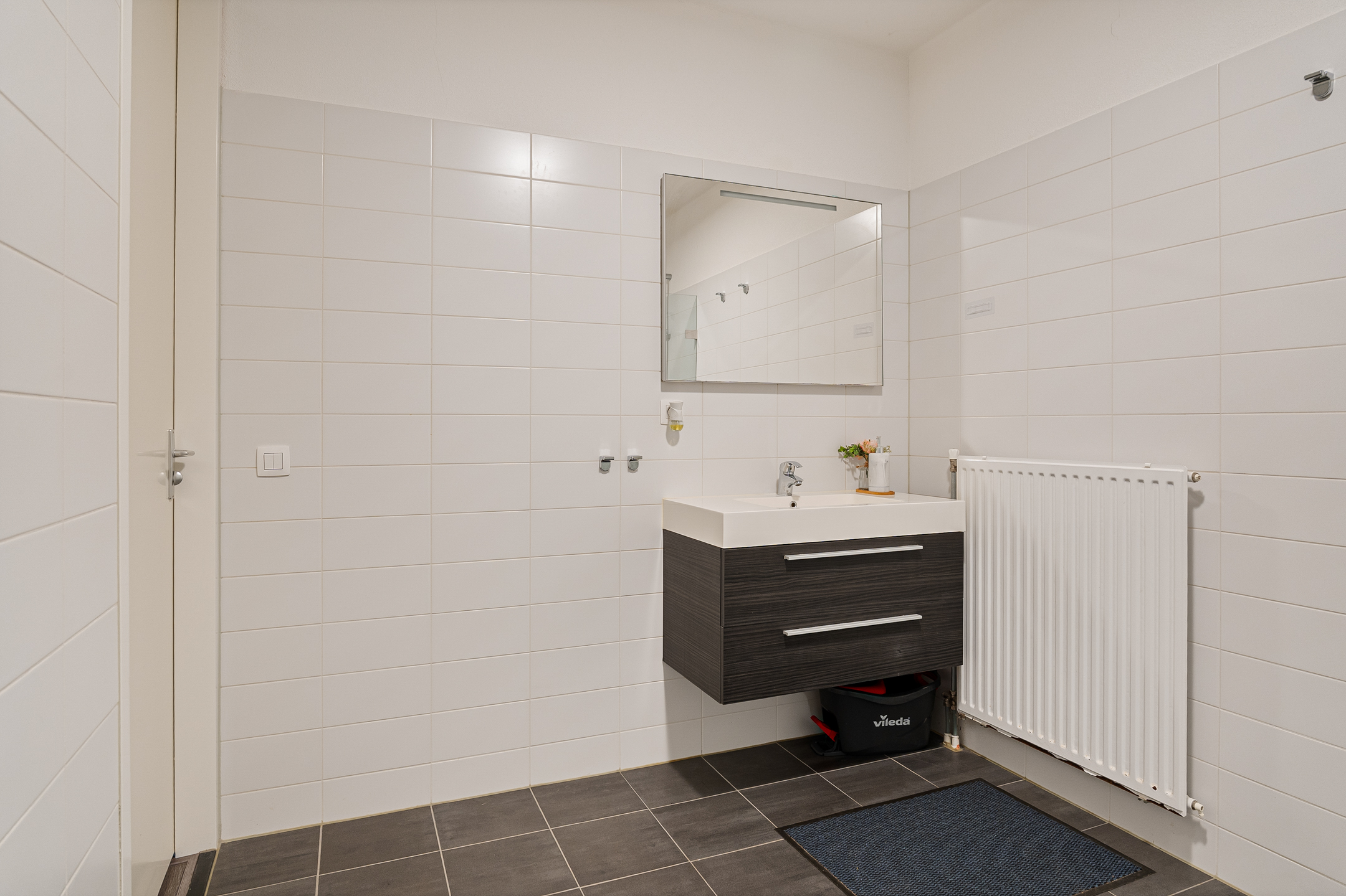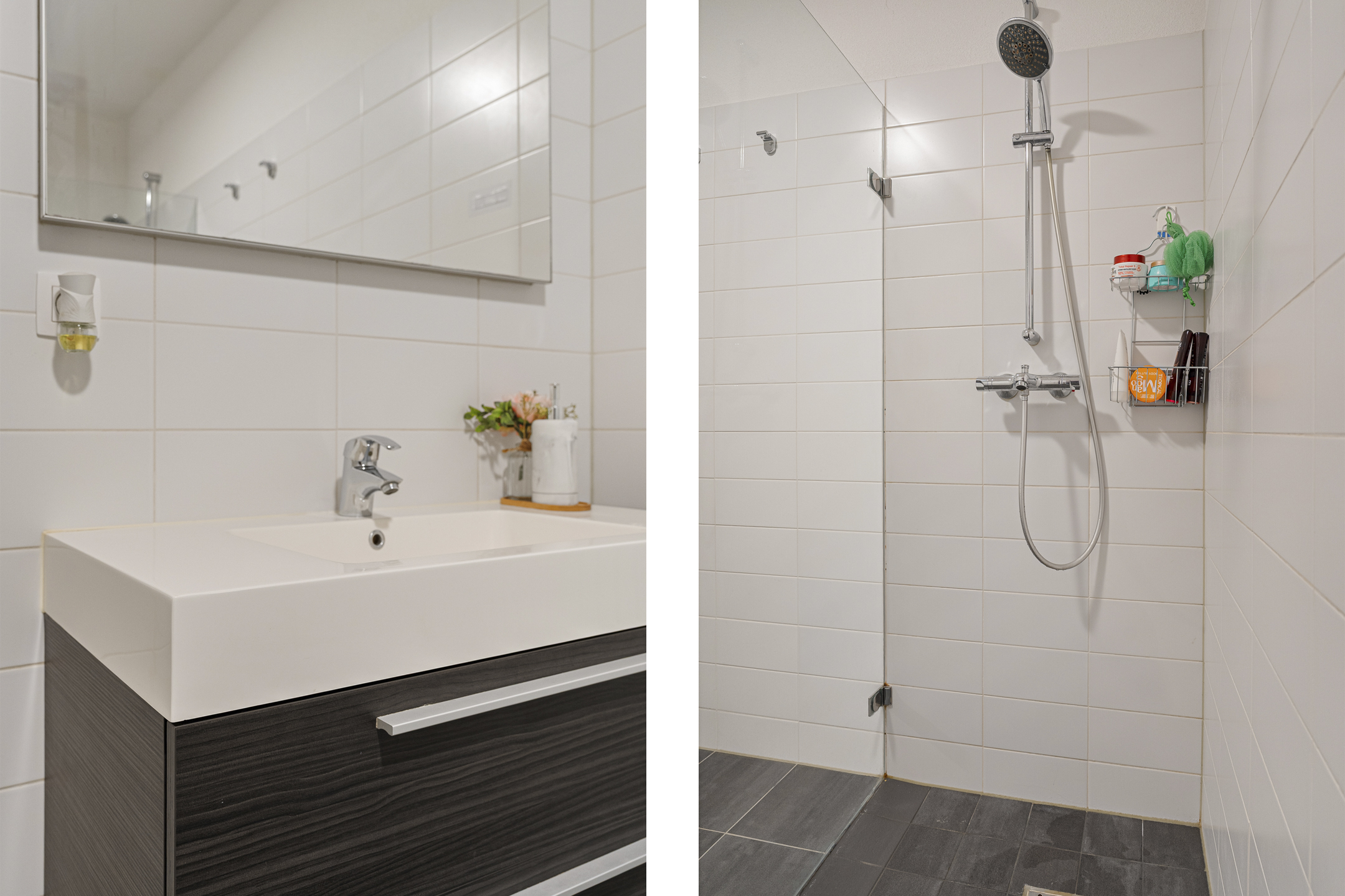 Aan de rechterzijde ligt het separate toilet, voorzien van een wandcloset, handwasbakje en halfhoog betegelde wanden. Direct daarnaast bevindt zich de ruime badkamer, eveneens halfhoog betegeld en uitgerust met een wastafelmeubel, radiator en een separate inloopdouche met hardglazen douchescherm.