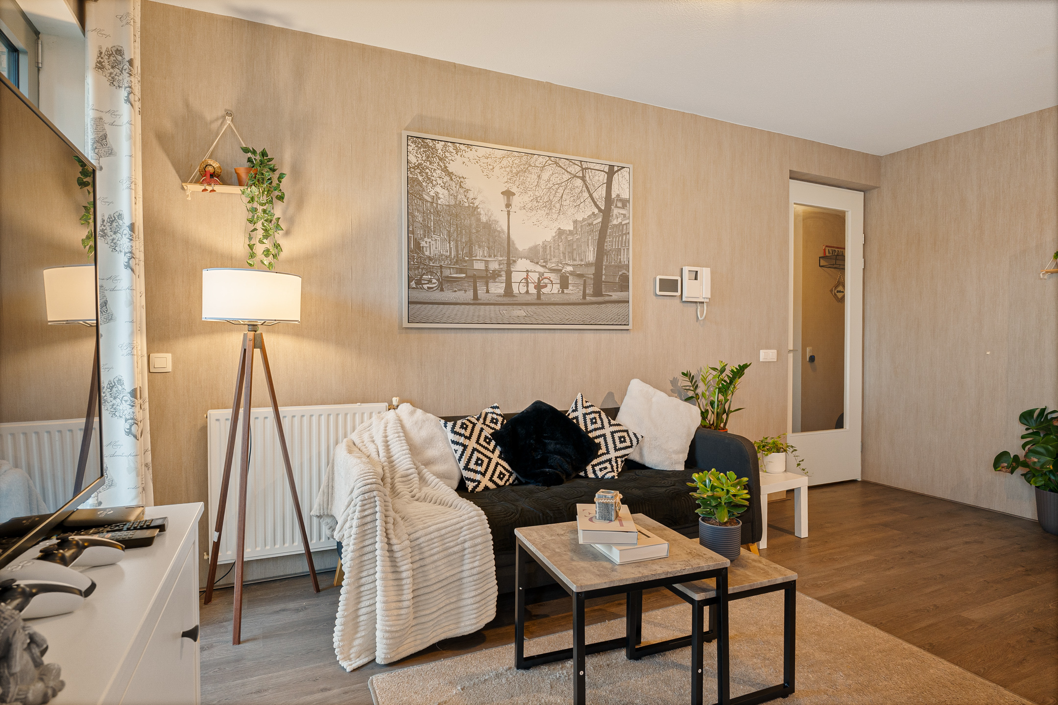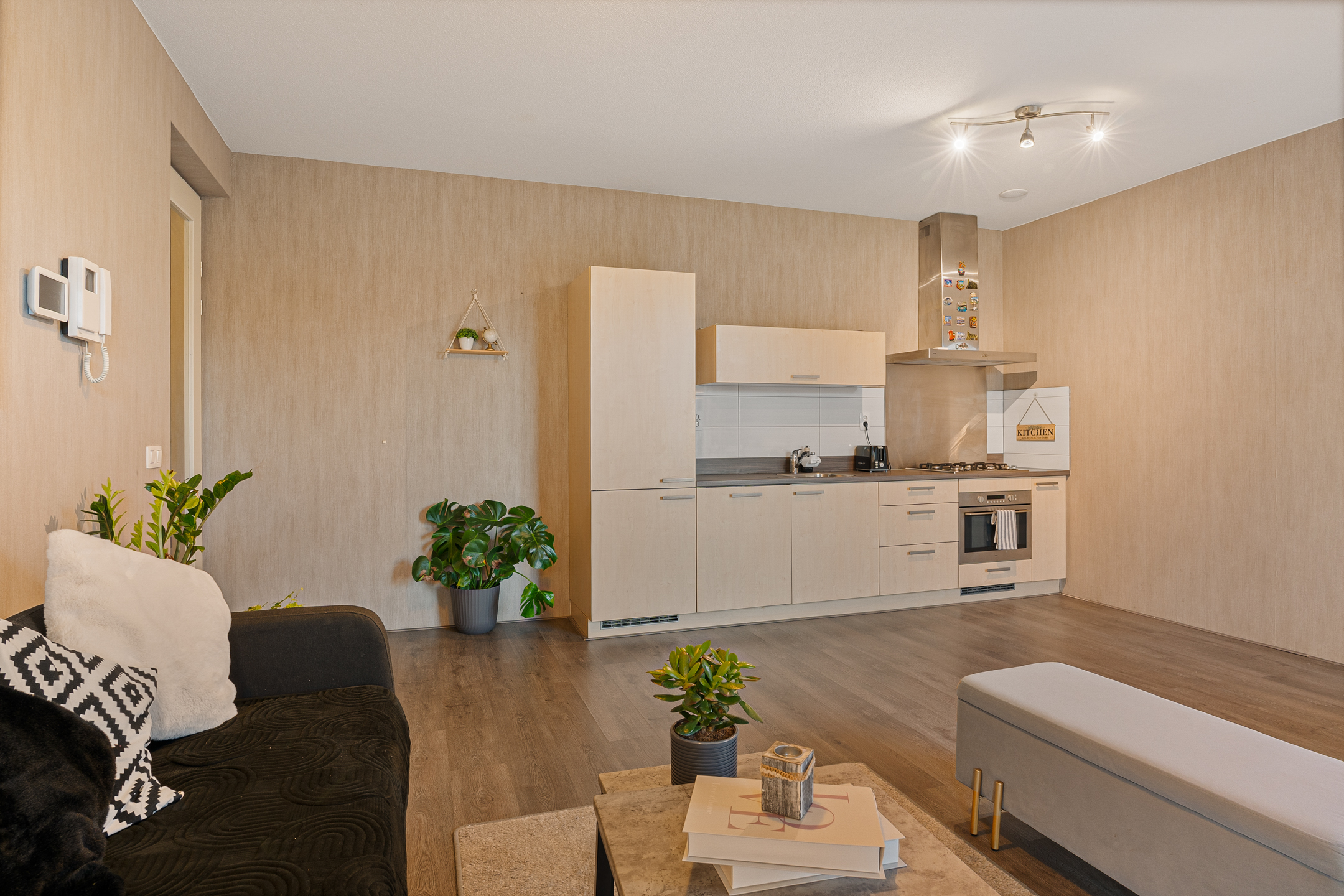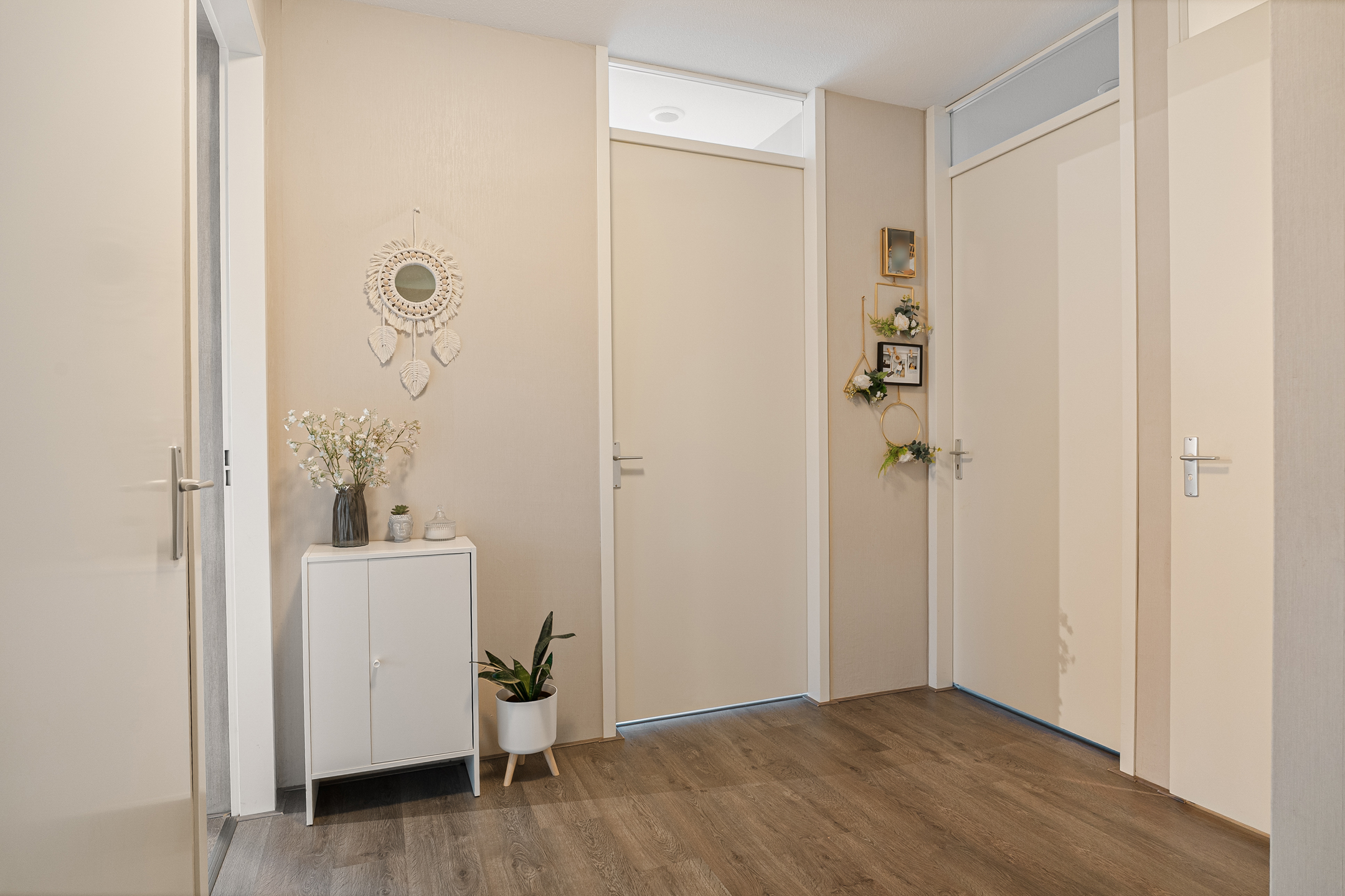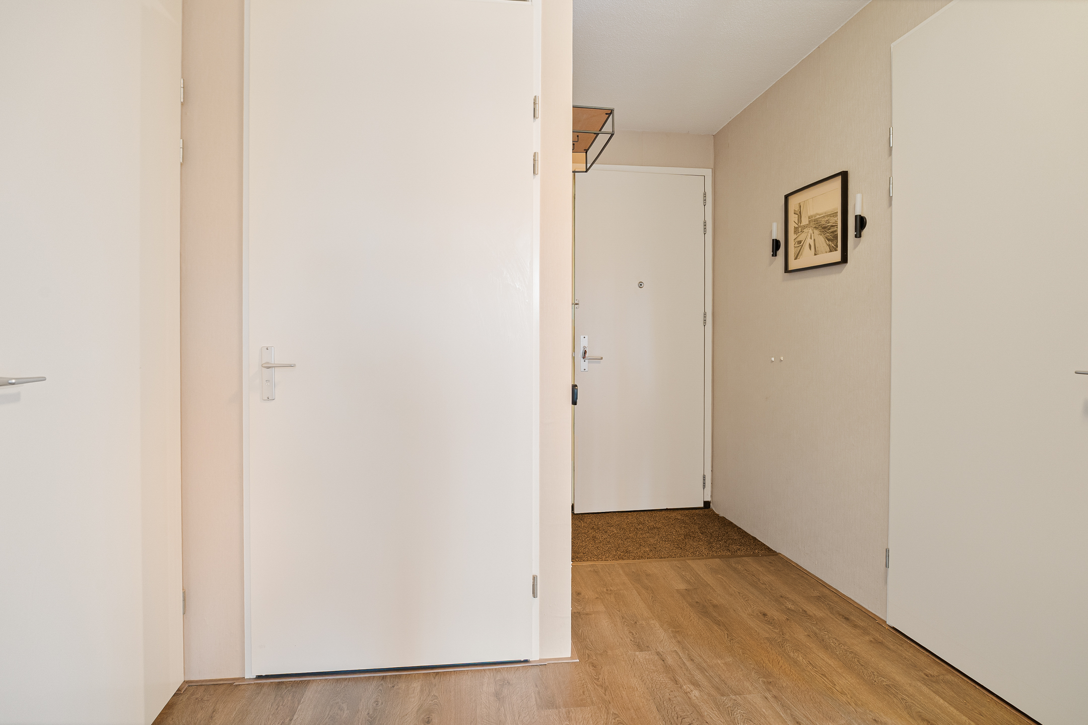 Via de algemene hal bereik je de nette voordeur van het appartement. Je komt binnen in een centraal gelegen hal die toegang biedt tot alle vertrekken. Aan de linkerzijde bevindt zich de praktische interne berging met de cv-ketel (2015) en wasmachineaansluiting, ideaal voor extra opslag en provisie.