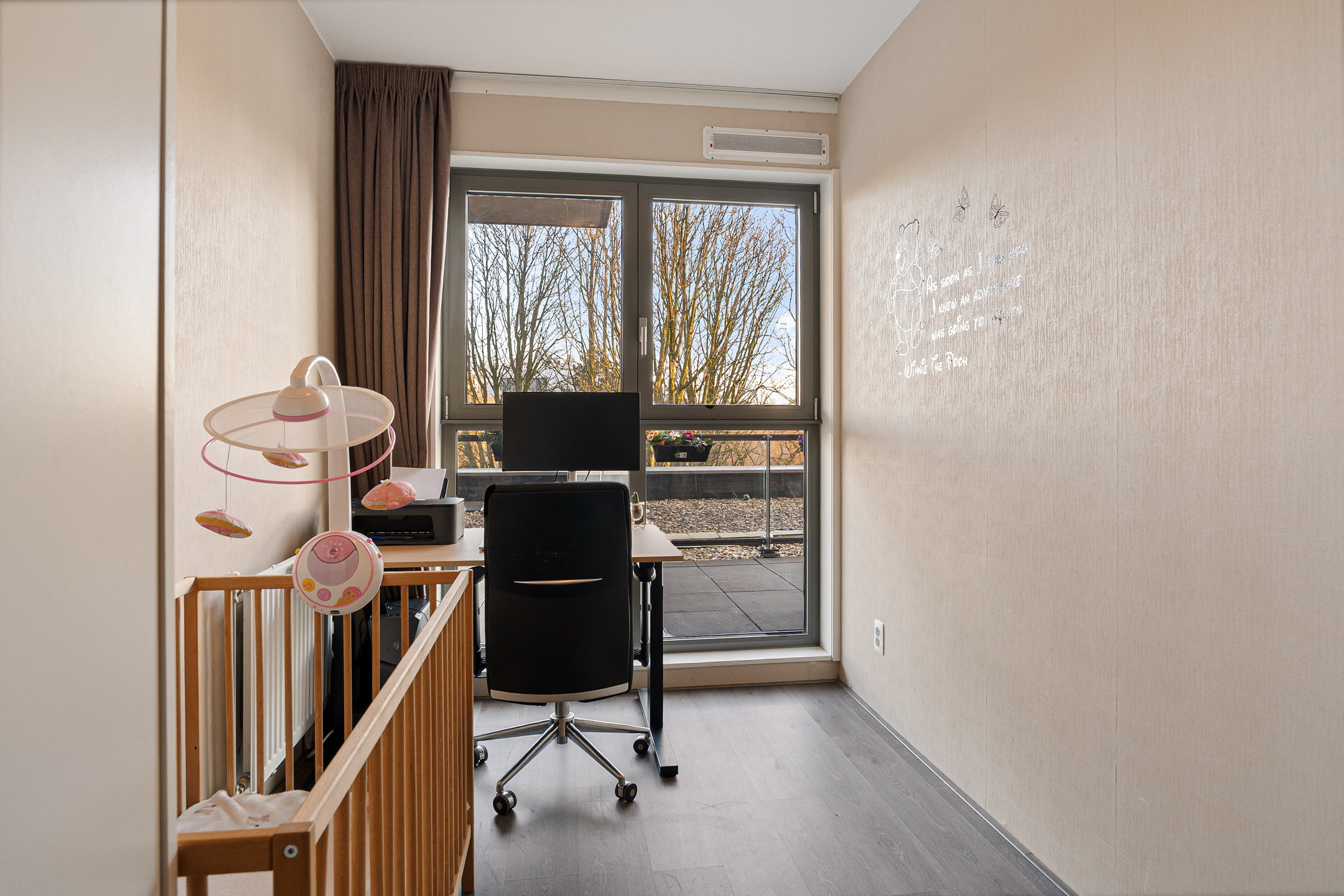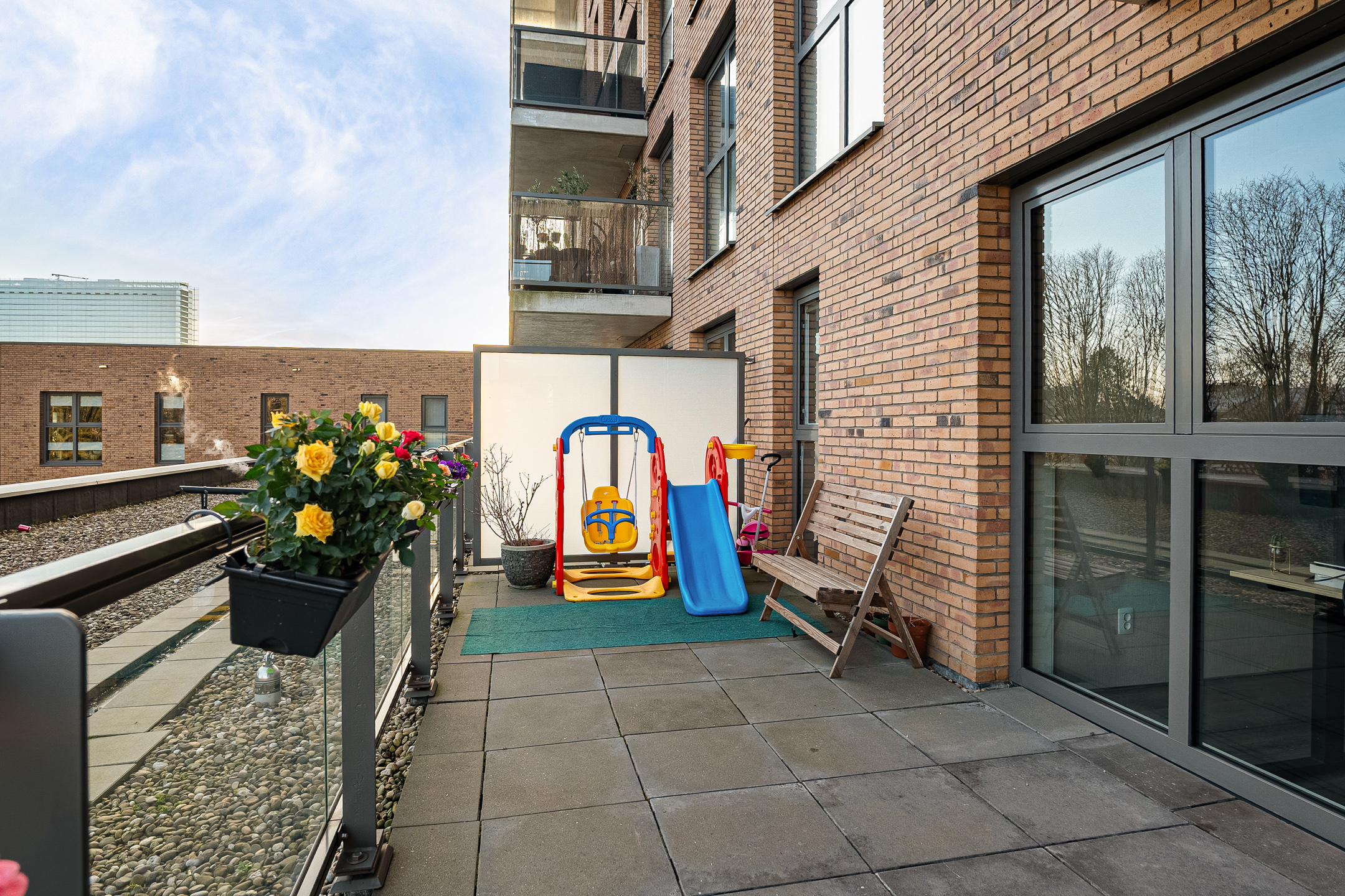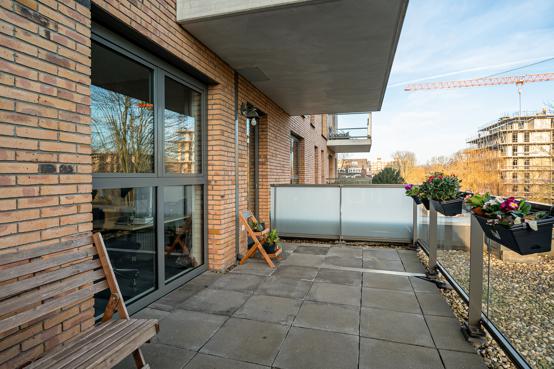 Het appartement beschikt over een uitzonderlijk groot terras van circa 19 m². Hier heb je alle ruimte voor een royale loungeset, een grote eettafel of groenaccenten. Het terras is betegeld en afgewerkt met een hekwerk voorzien van transparante glazen panelen, wat zorgt voor een open en lichte uitstraling en een mooi zicht op de groene omgeving.