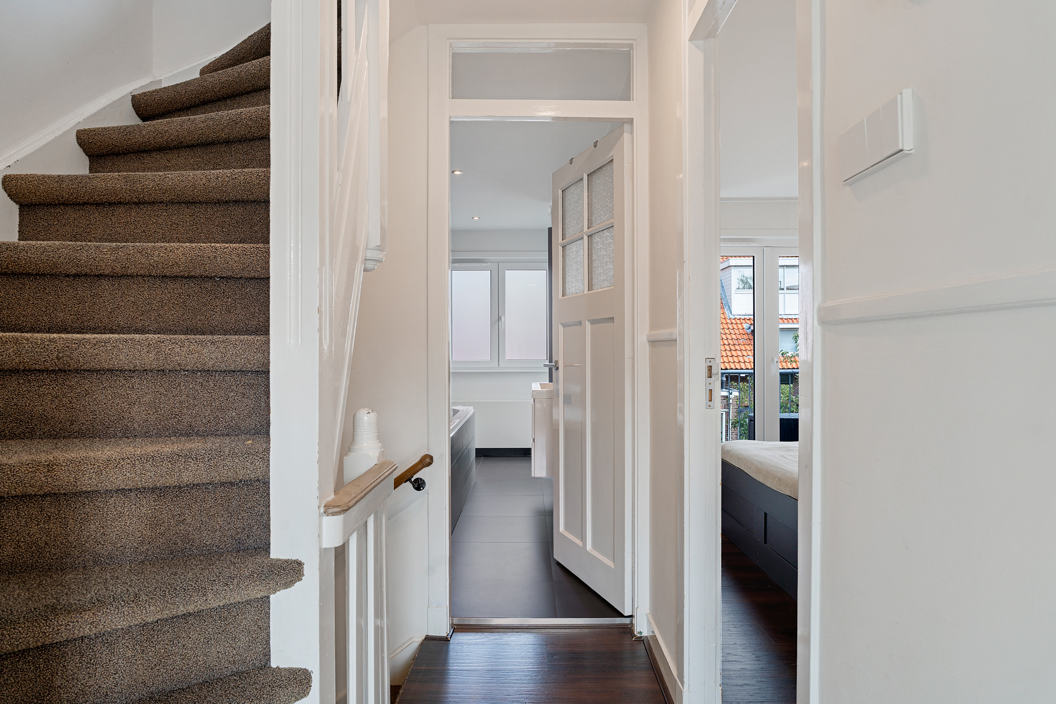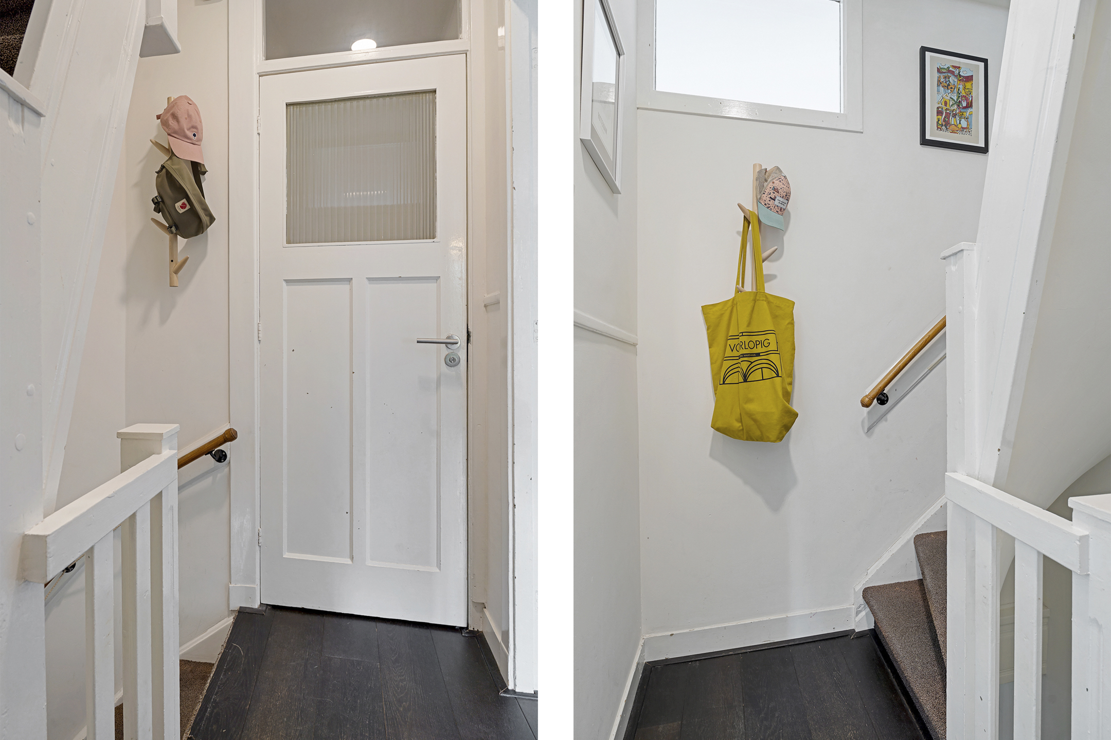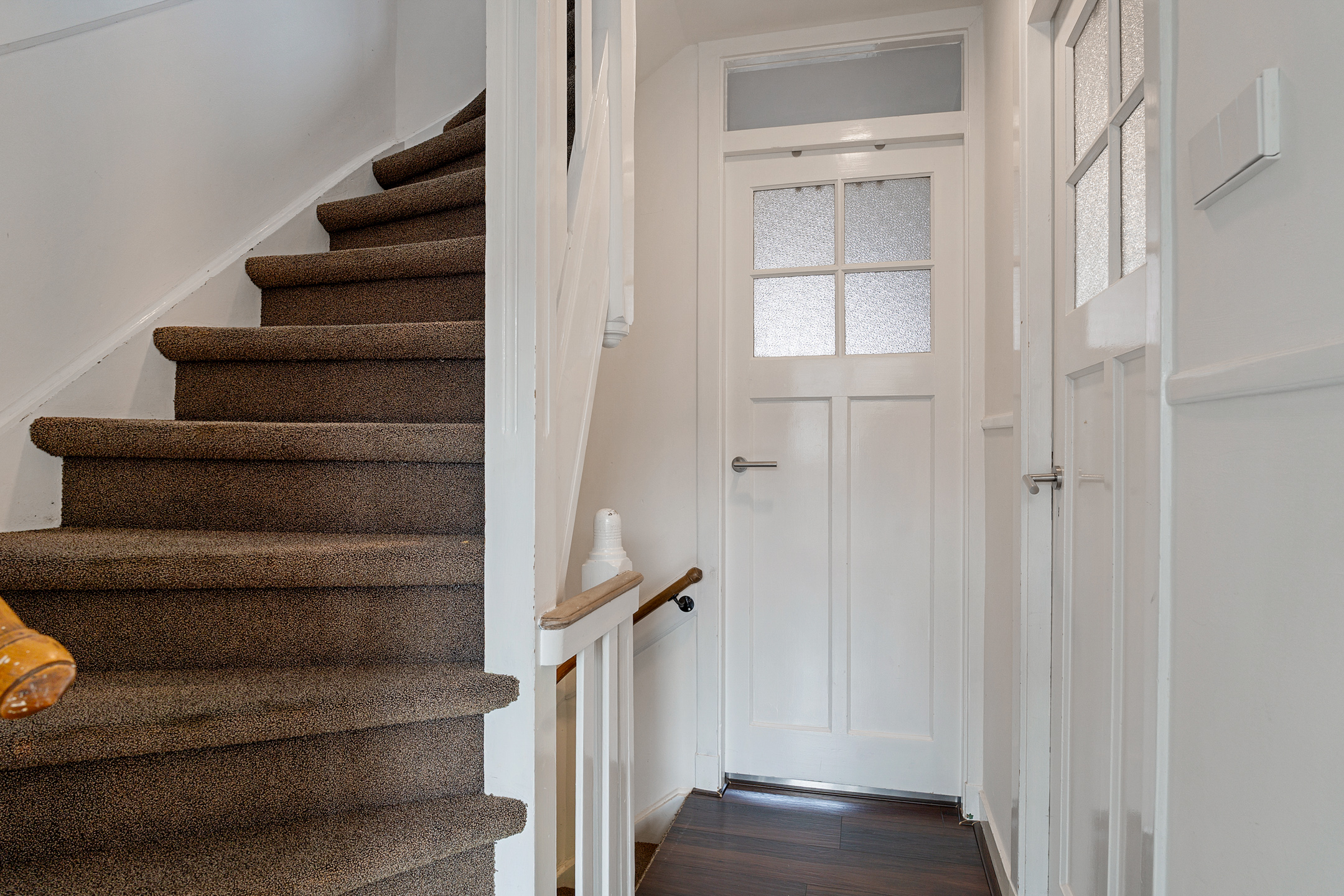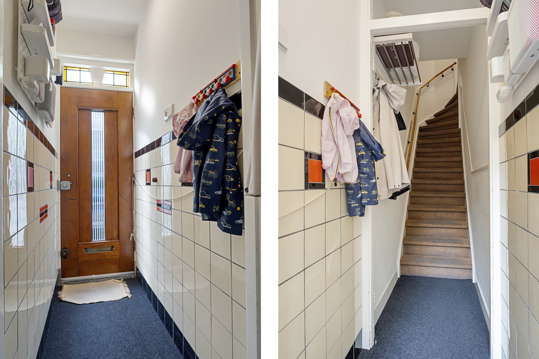 Entree vanaf straatniveau met originele lambrisering en trapopgang naar de eerste verdieping.