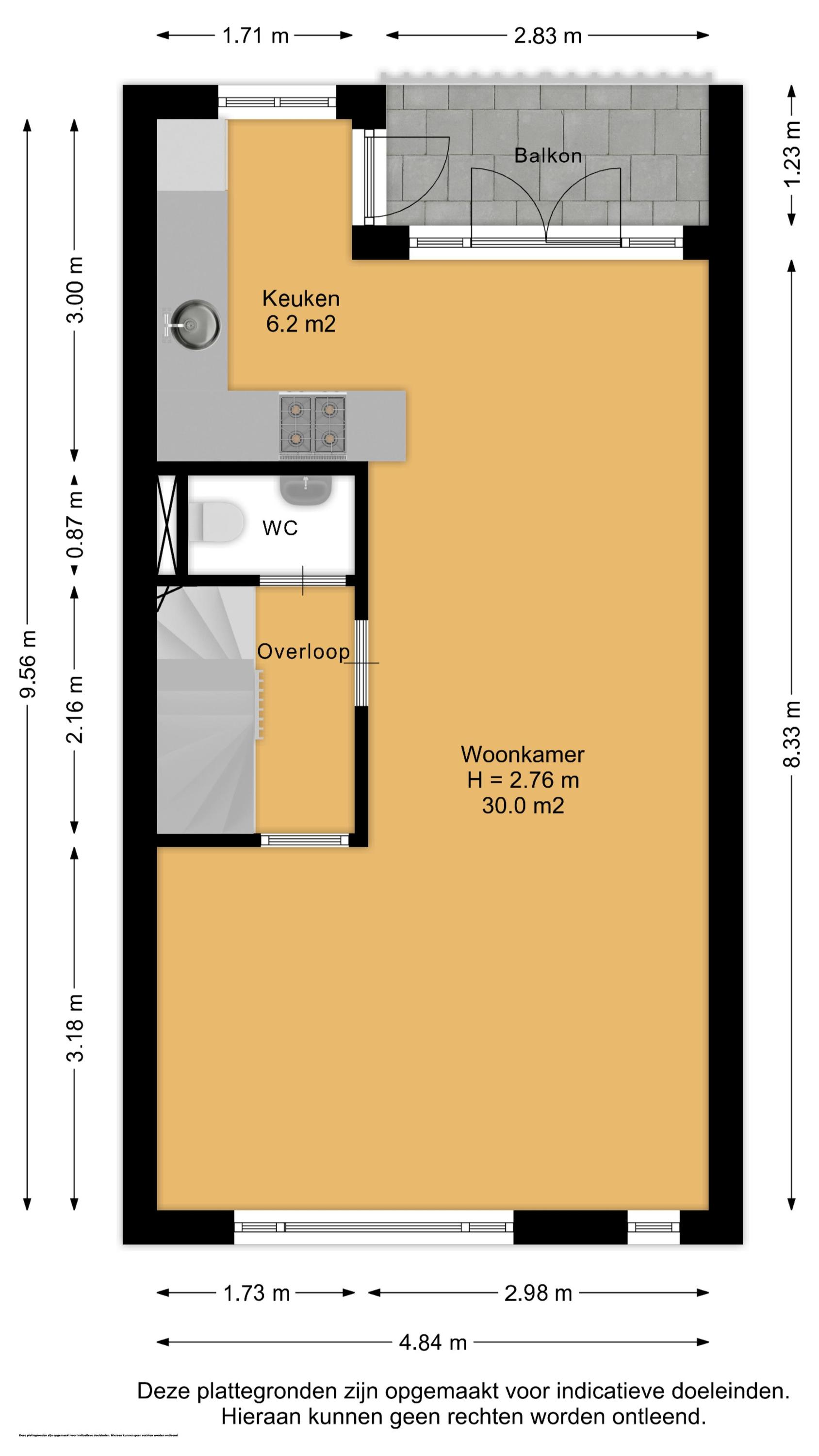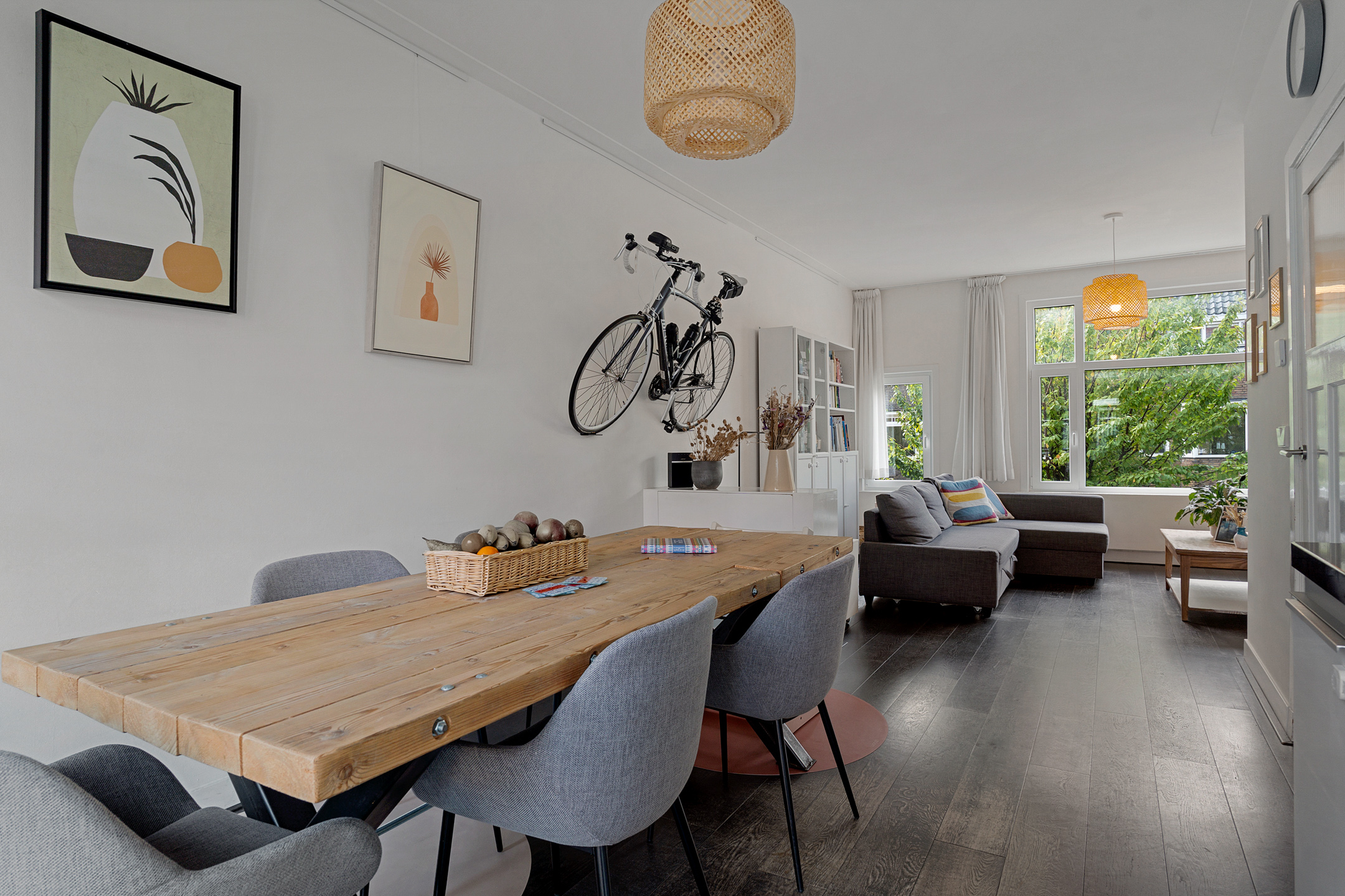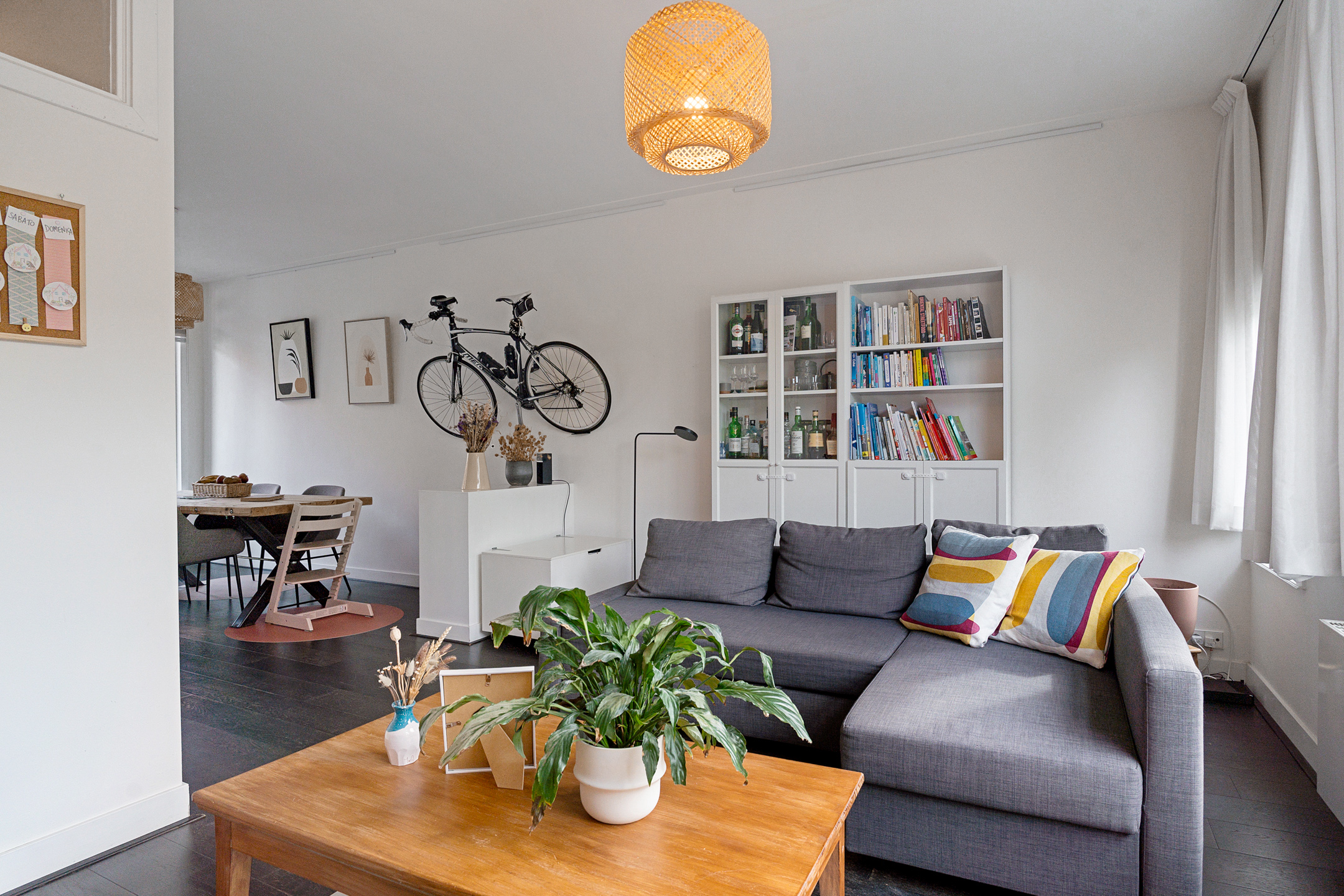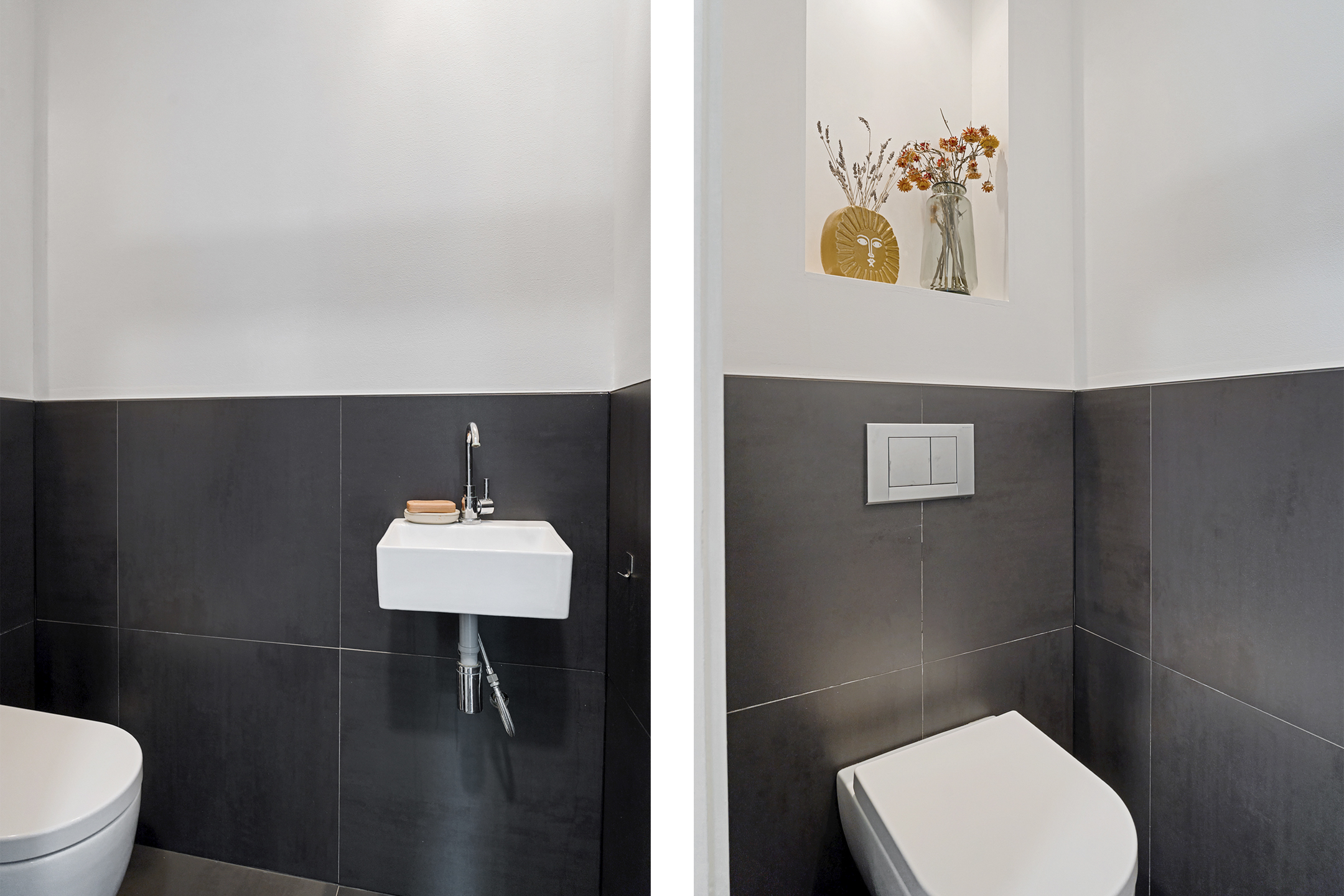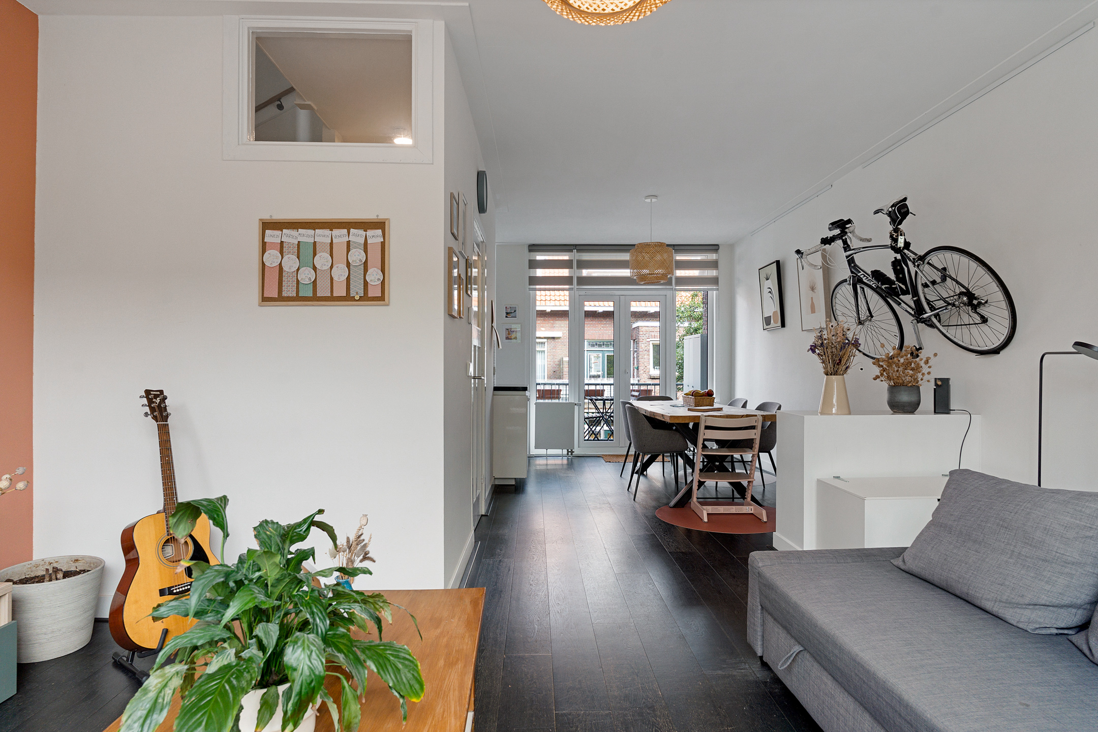 Overloop met toilet en fonteintje. De royale woonkamer strekt zich uit over de gehele lengte van de woning en heeft aan de voorzijde een sfeervol uitzicht over de straat en aan de achterzijde toegang tot het balkon. Dankzij de grote raampartijen is de ruimte heerlijk licht.