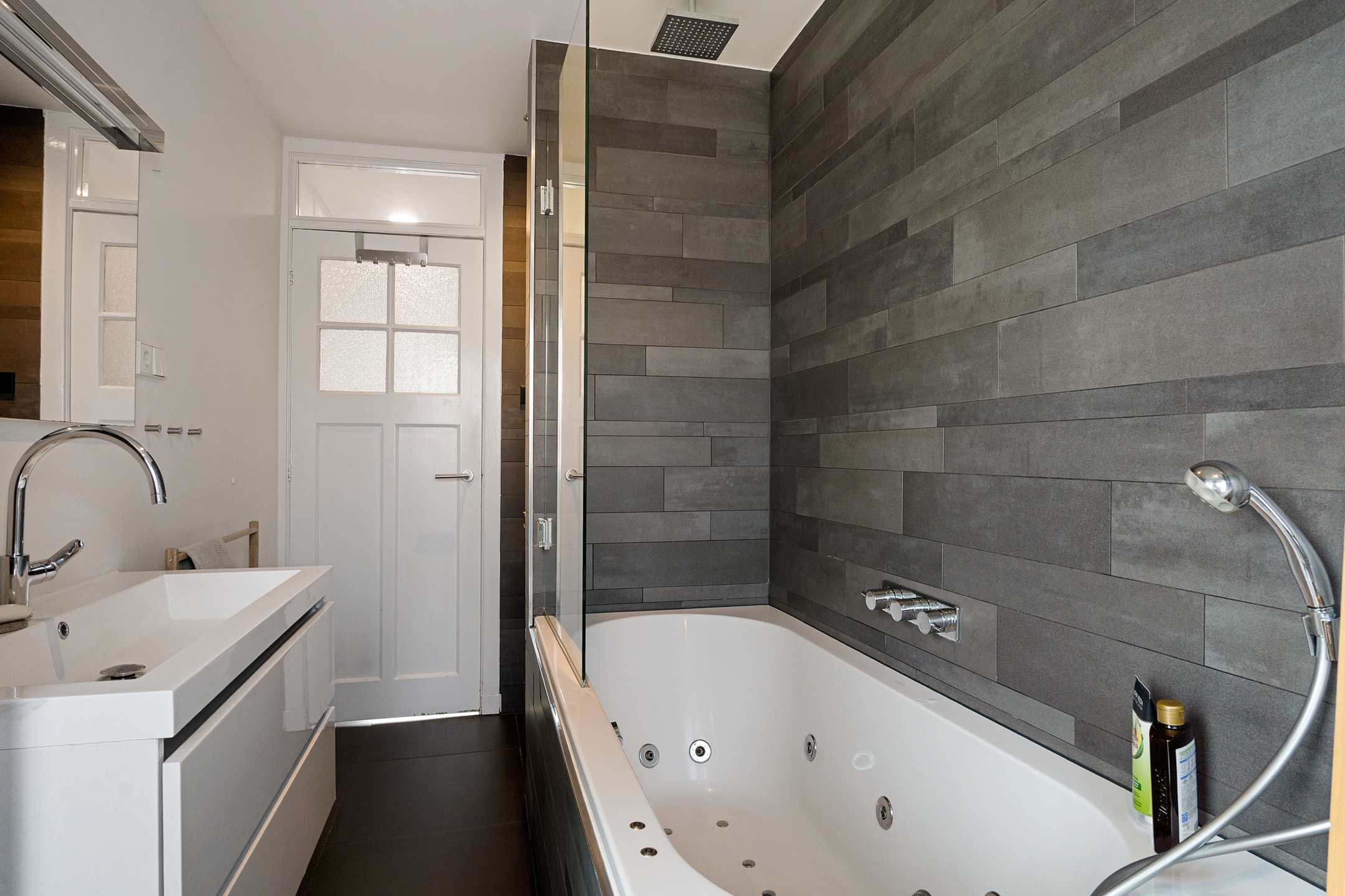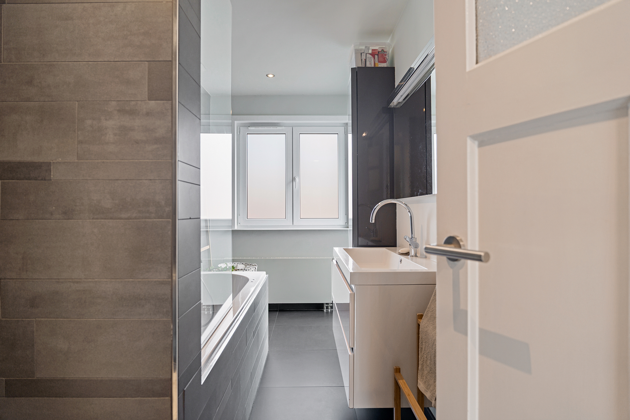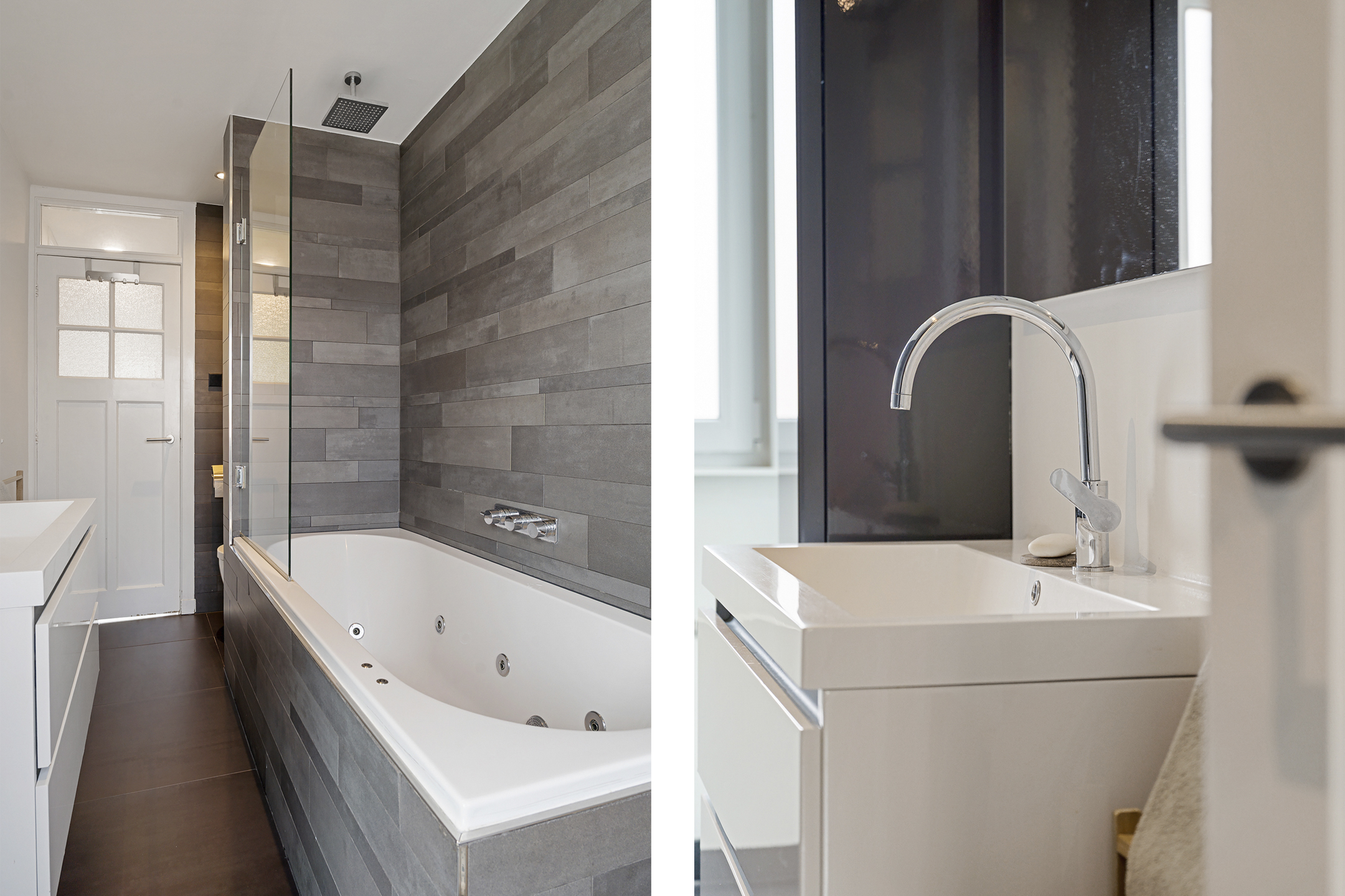 Overloop met toegang tot twee slaapkamers en de badkamer. De slaapkamer aan de voorzijde beschikt over een dakkapel, wat zorgt voor extra ruimte en licht. De slaapkamer aan de achterzijde heeft toegang tot het tweede balkon. De luxe badkamer is compleet ingericht met een ligbad, wastafel en tweede toilet, afgewerkt in een moderne stijl.