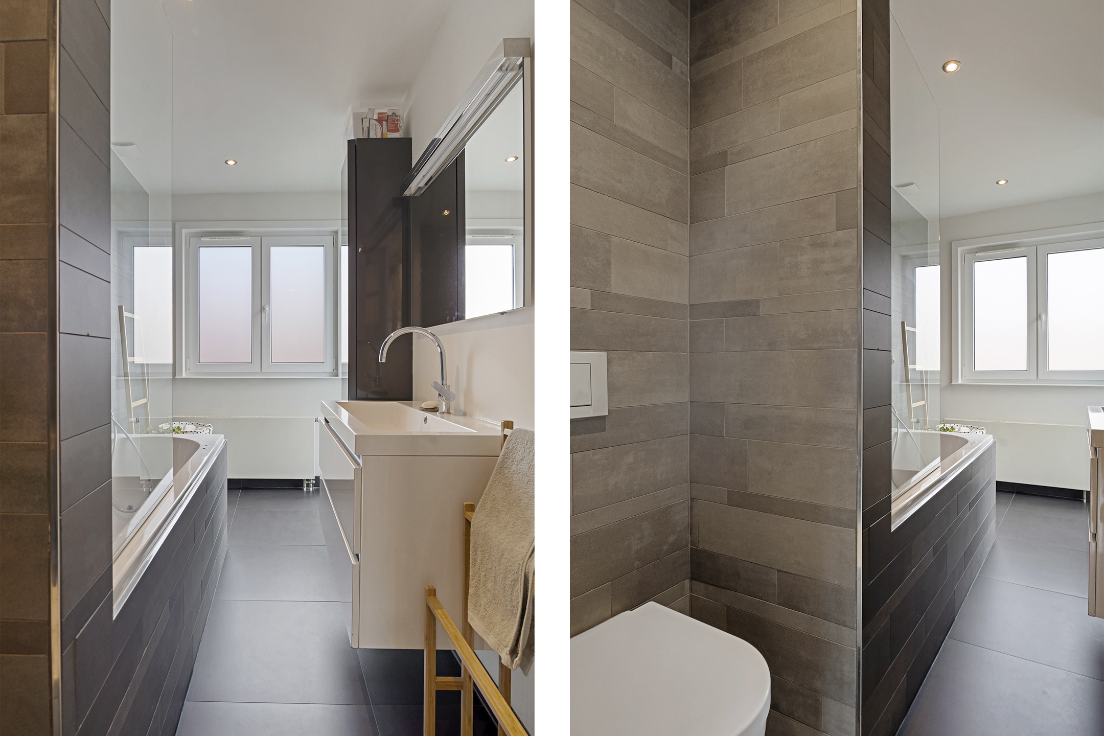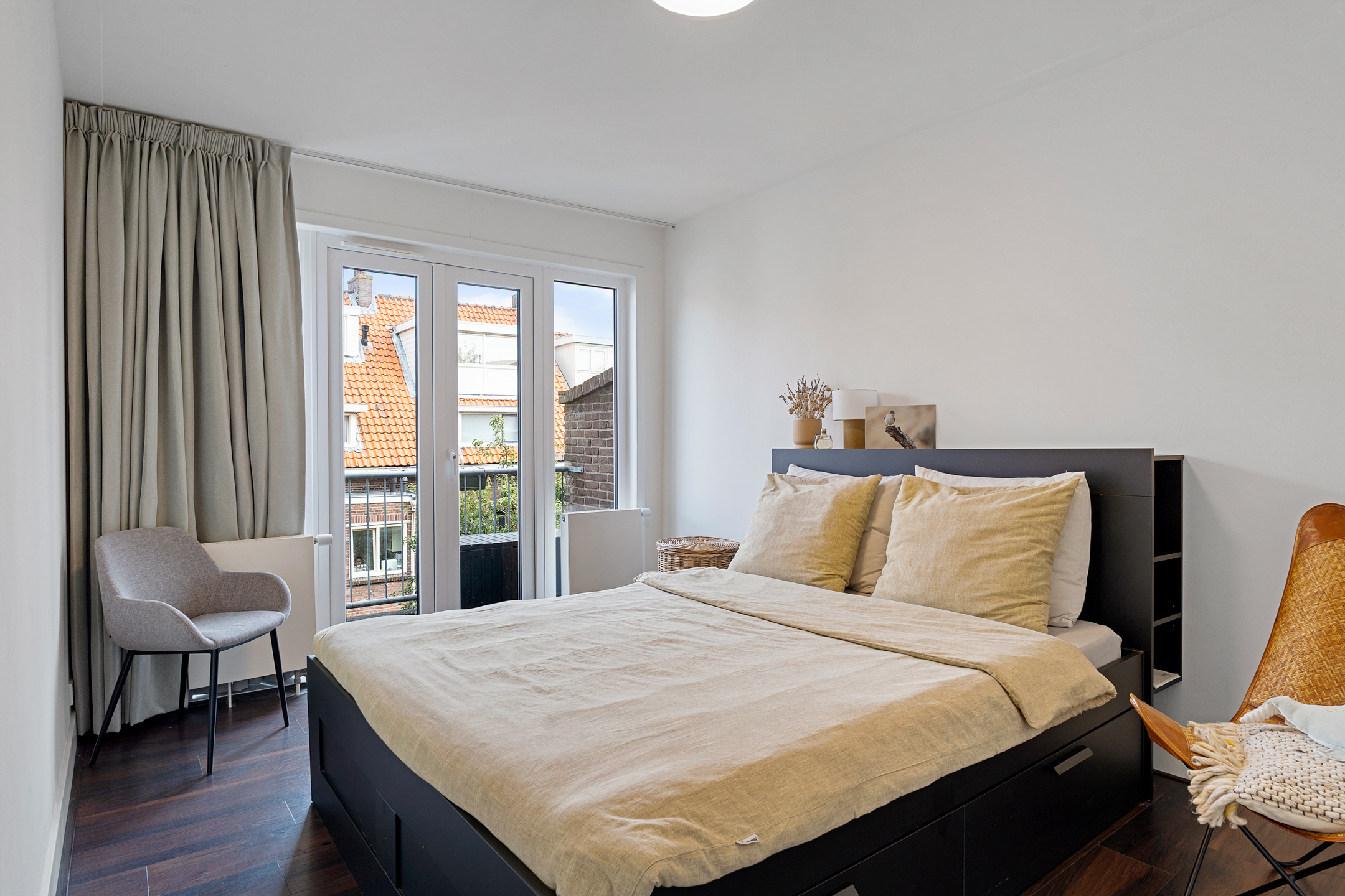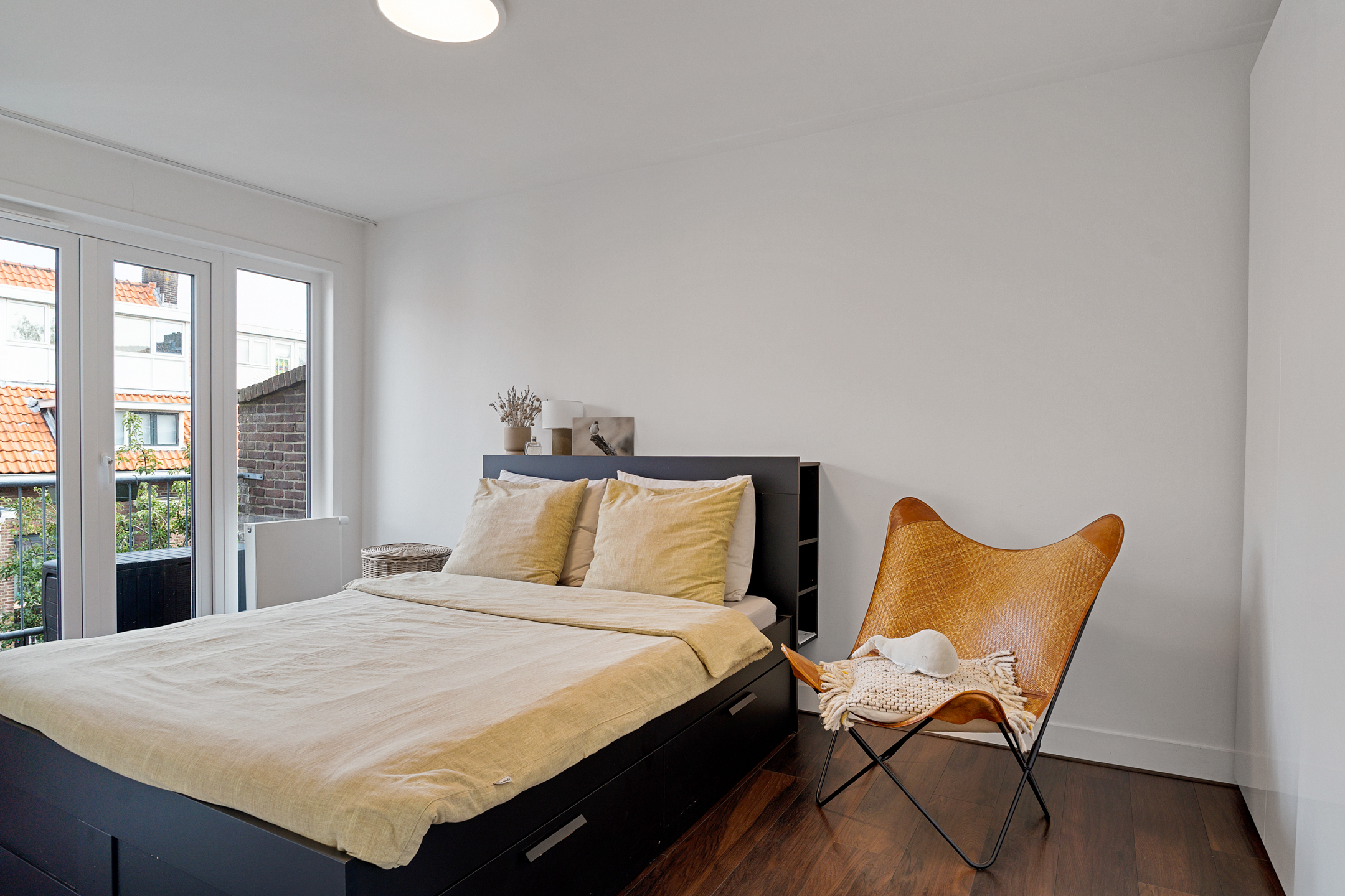 Overloop met toegang tot twee slaapkamers en de badkamer. De slaapkamer aan de voorzijde beschikt over een dakkapel, wat zorgt voor extra ruimte en licht. De slaapkamer aan de achterzijde heeft toegang tot het tweede balkon. De luxe badkamer is compleet ingericht met een ligbad, wastafel en tweede toilet, afgewerkt in een moderne stijl.