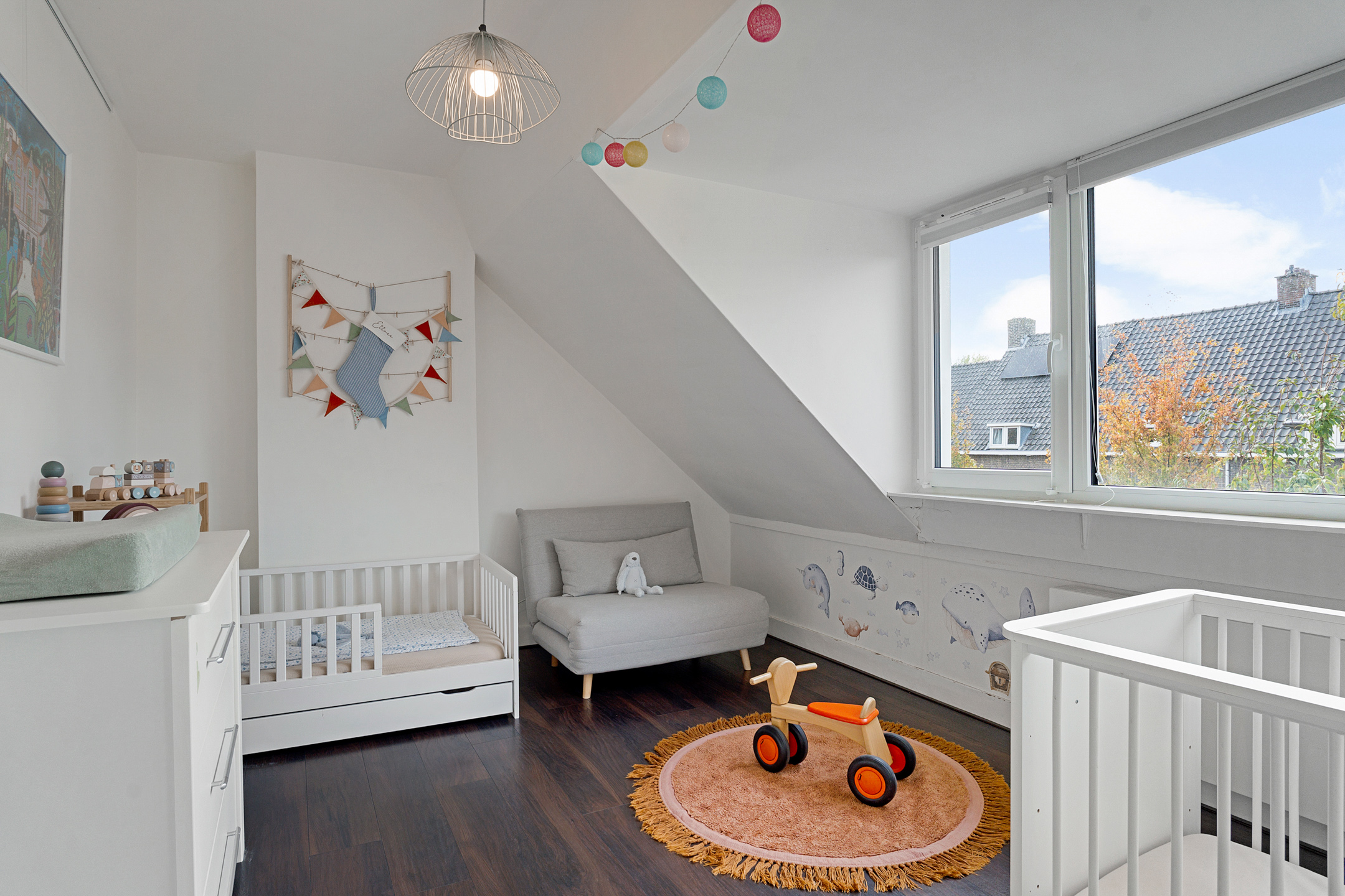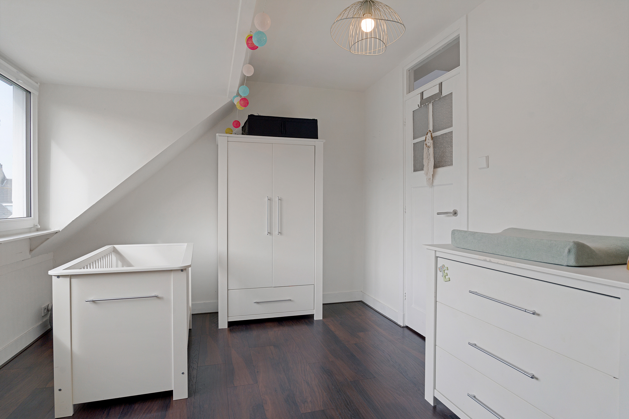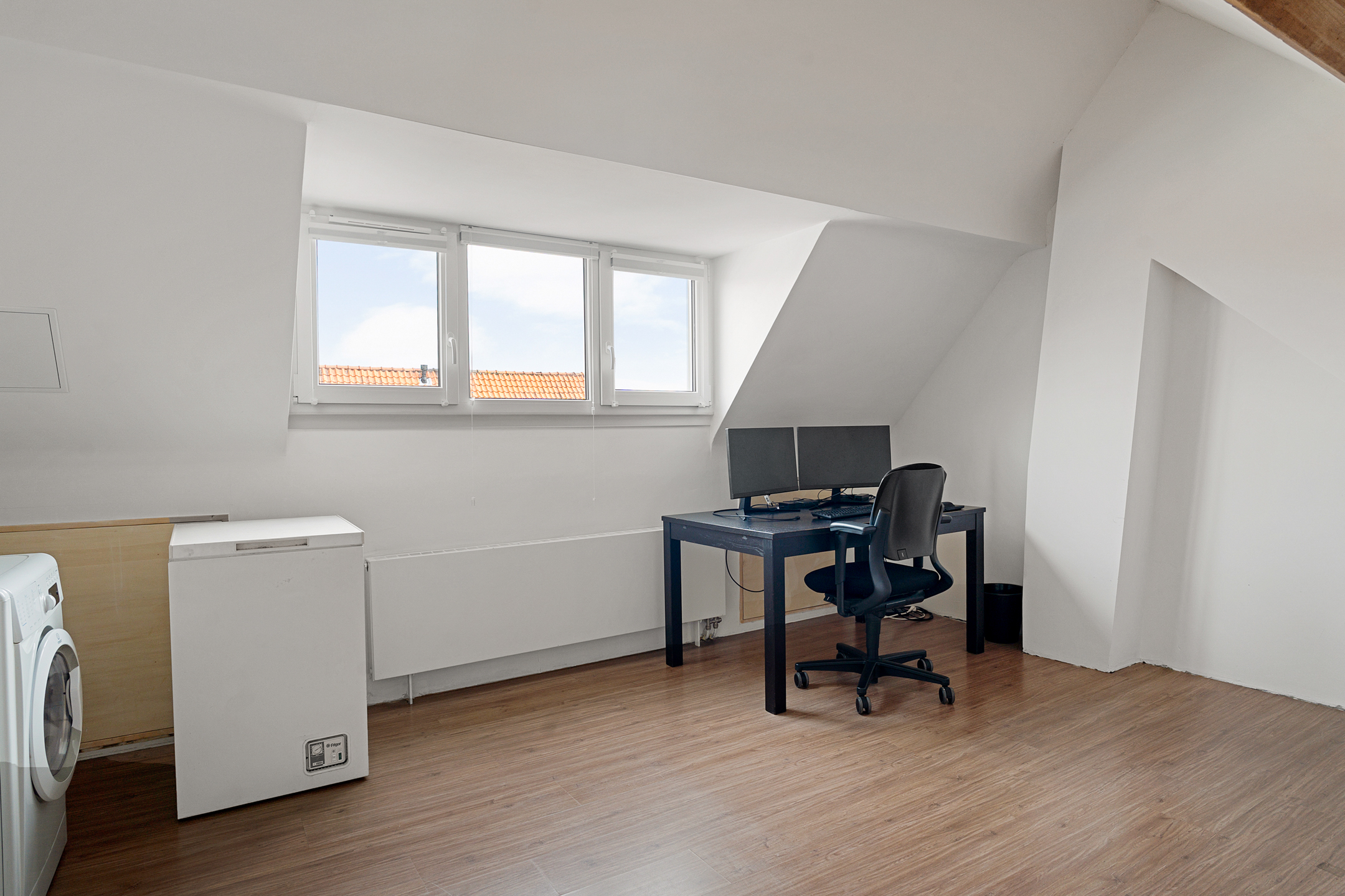 De bovenste etage is een open ruimte die momenteel in gebruik is als kantoor, maar ook uitstekend geschikt is als logeer- of hobbykamer. Hier bevinden zich tevens de aansluitingen voor de wasmachine en droger, evenals de cv-installatie (2013). Aan de achterzijde zorgt een dakkapel voor extra daglicht.