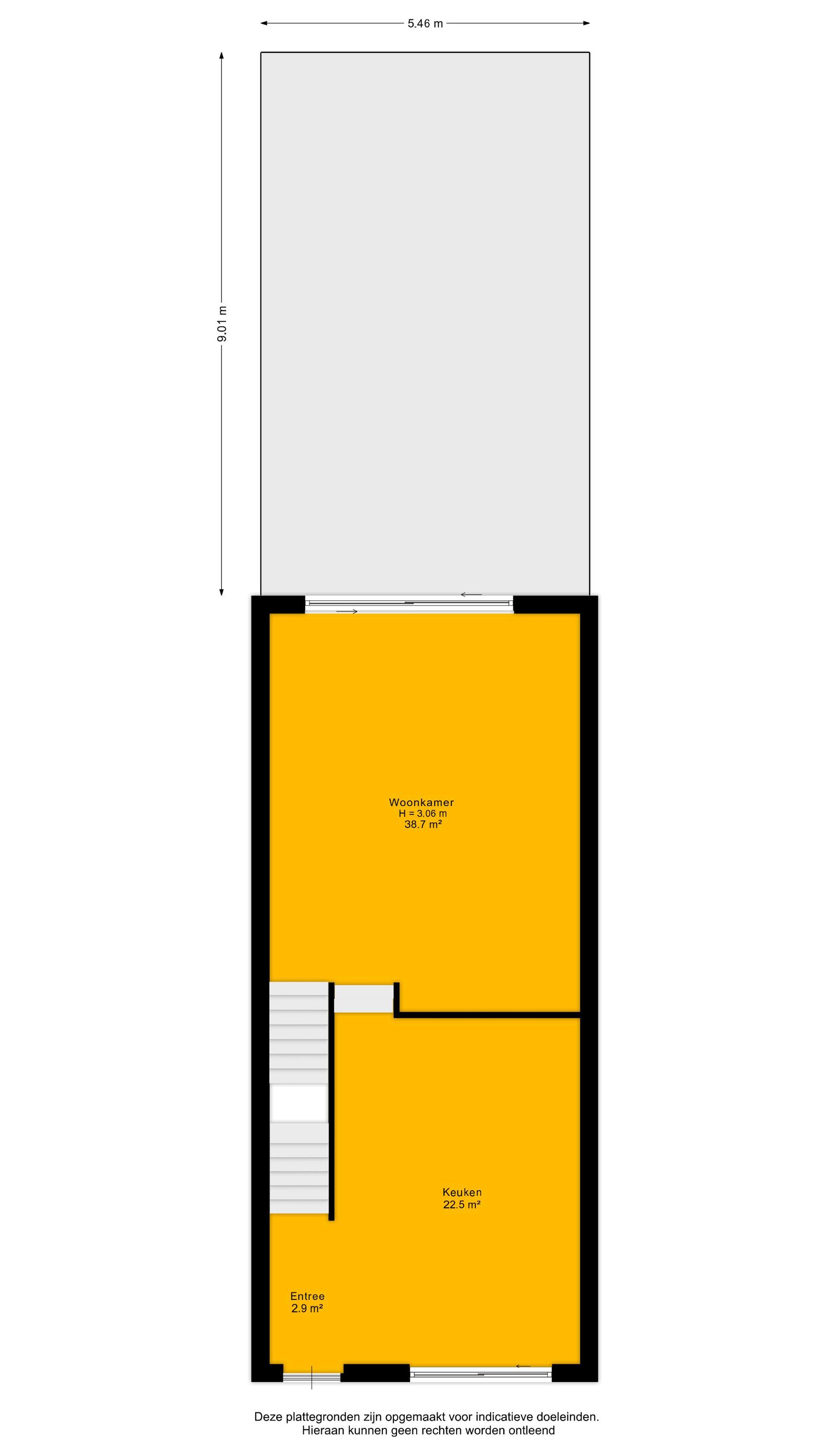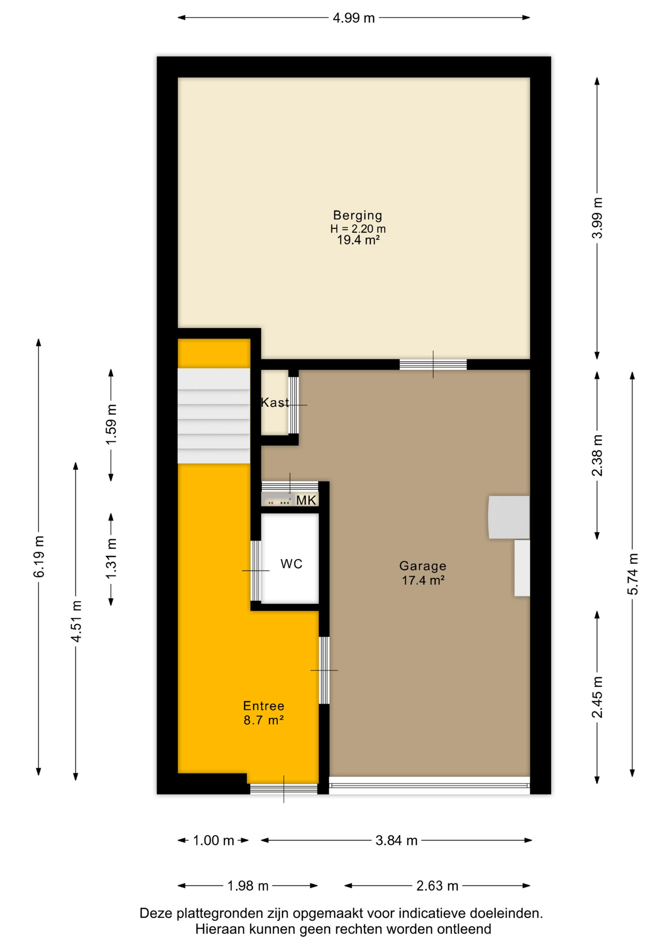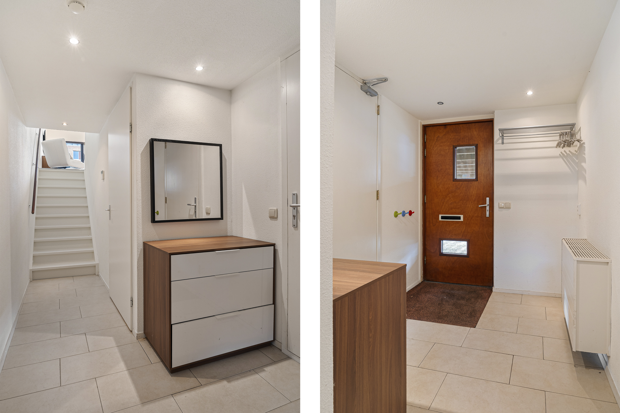 Via de entree kom je in de hal met toilet en toegang tot de garage. Vanuit de hal leidt een trap naar de woonkamer.