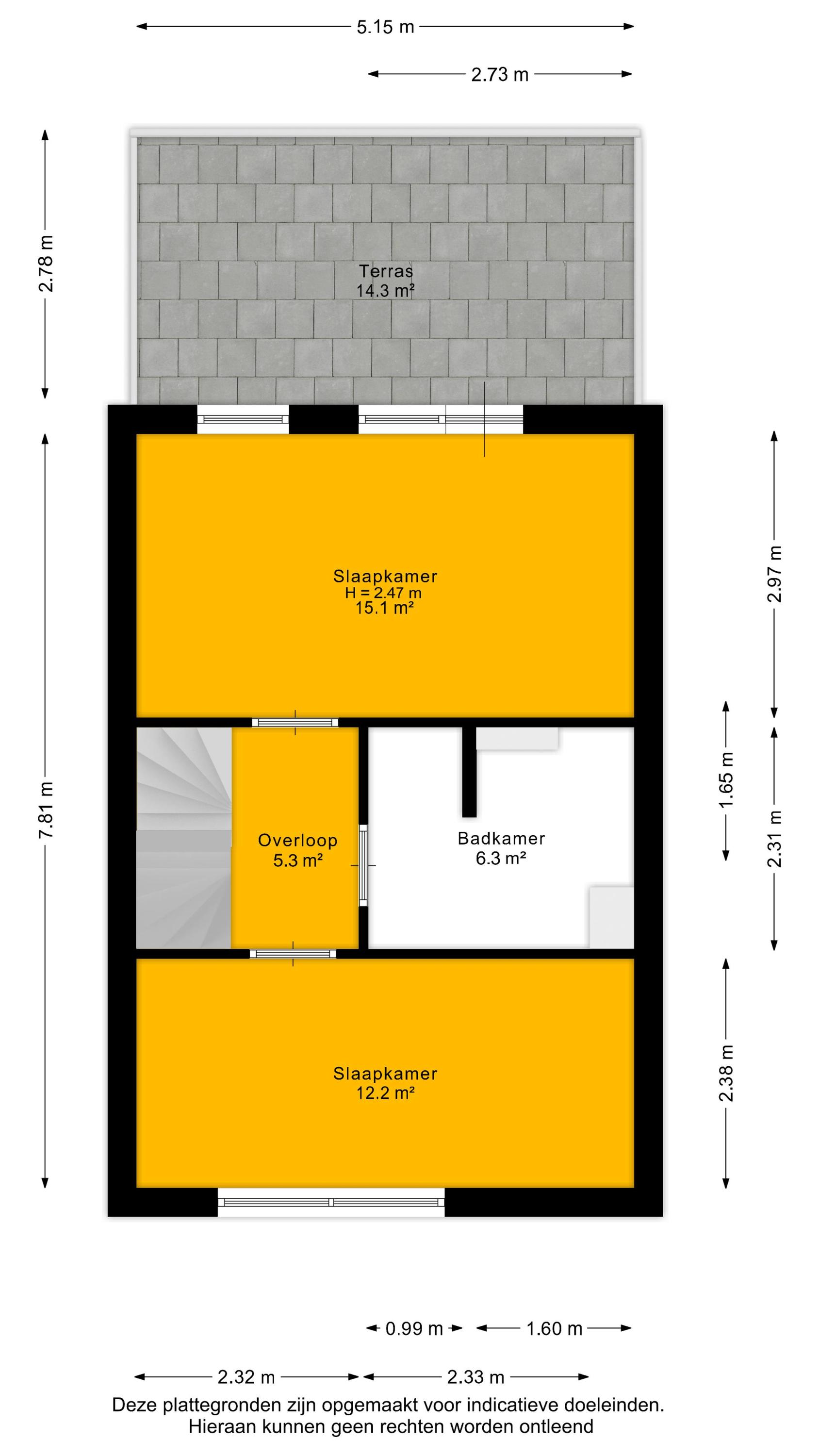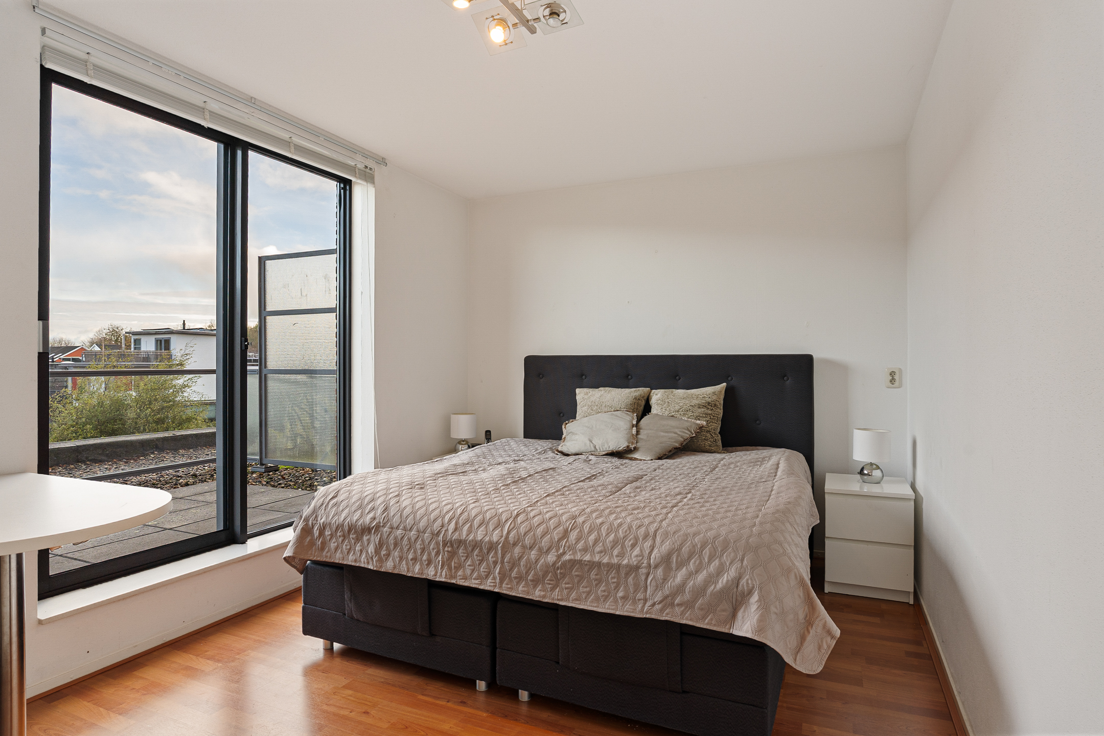 Een vaste trap met geluidsdichte deur leidt naar de overloop die toegang geeft tot twee ruime slaapkamers en de eerste badkamer. Slaapkamer I (ca. 2.41 x 5.15 m) ligt aan de voorzijde. Slaapkamer II (ca. 2.96 x 5.15 m) ligt aan de achterzijde en heeft via een schuifpui toegang tot het zonneterras
