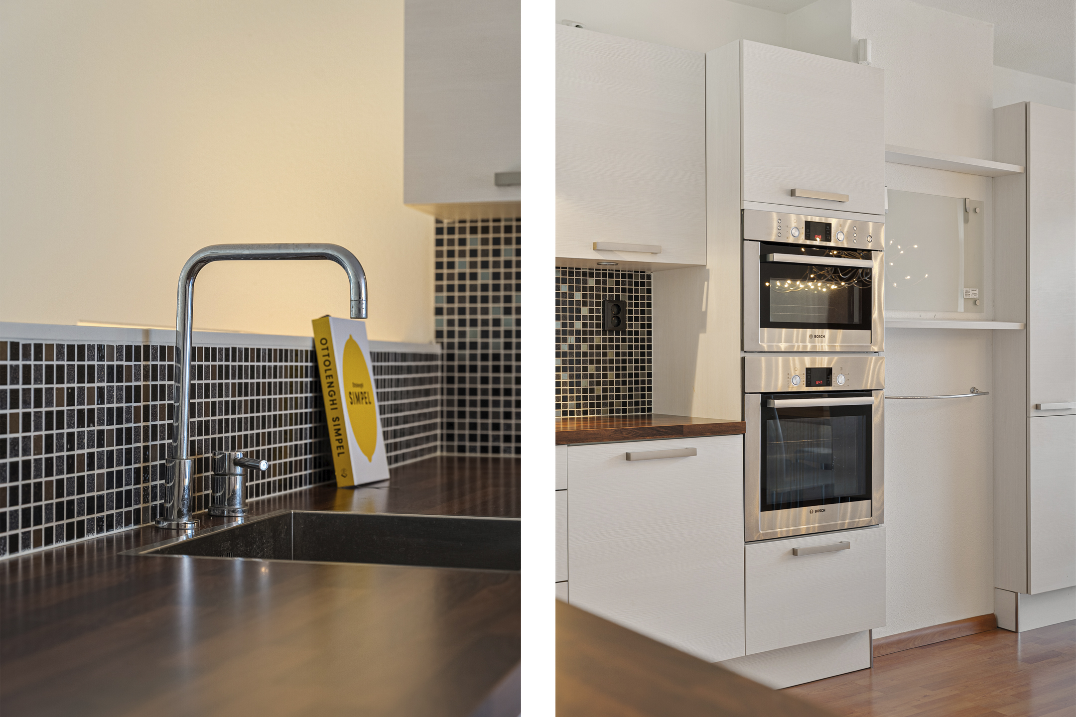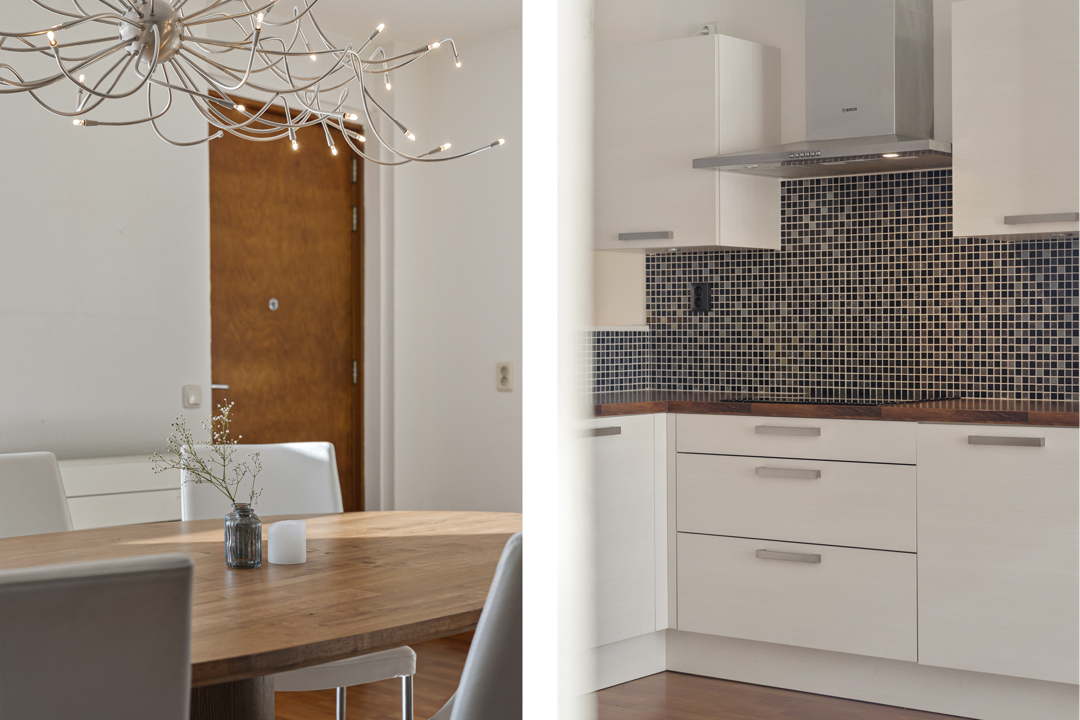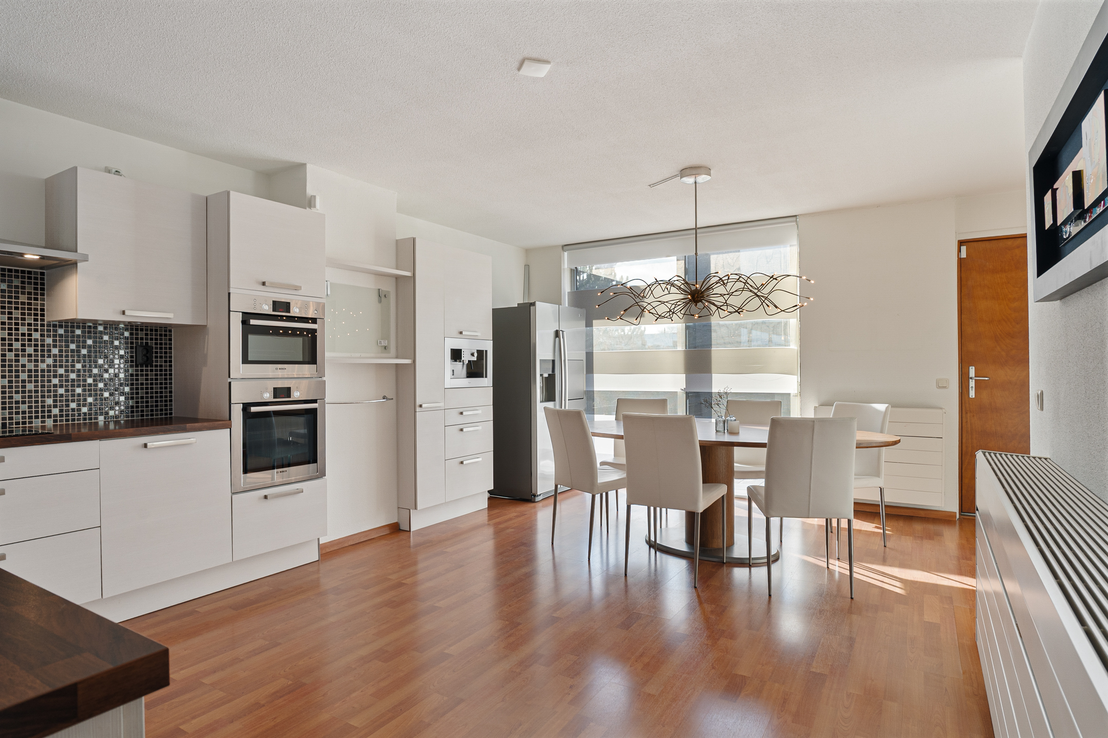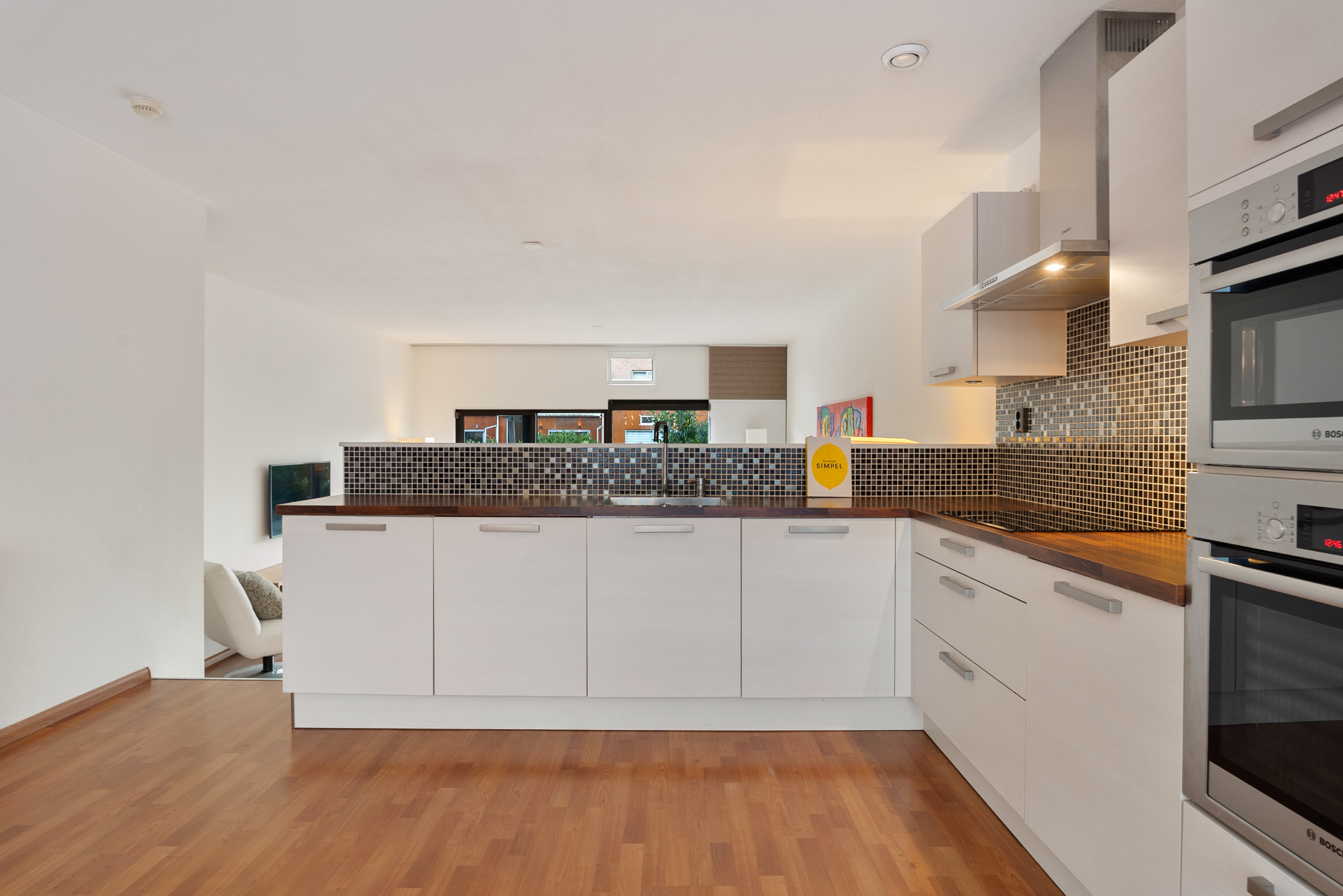Via twee traptreden loop je door naar de royale woonkeuken. De keuken is uitgerust met een ruim werkblad, inductiekookplaat met afzuigkap, vaatwasser, combimagnetron, XL-heteluchtoven en koffiemachine. Via een aluminium schuifpui en een tweede voordeur bereik je het gezamenlijke wandeldek: een zonnige plek waar kinderen veilig kunnen spelen op het afgesloten dek.