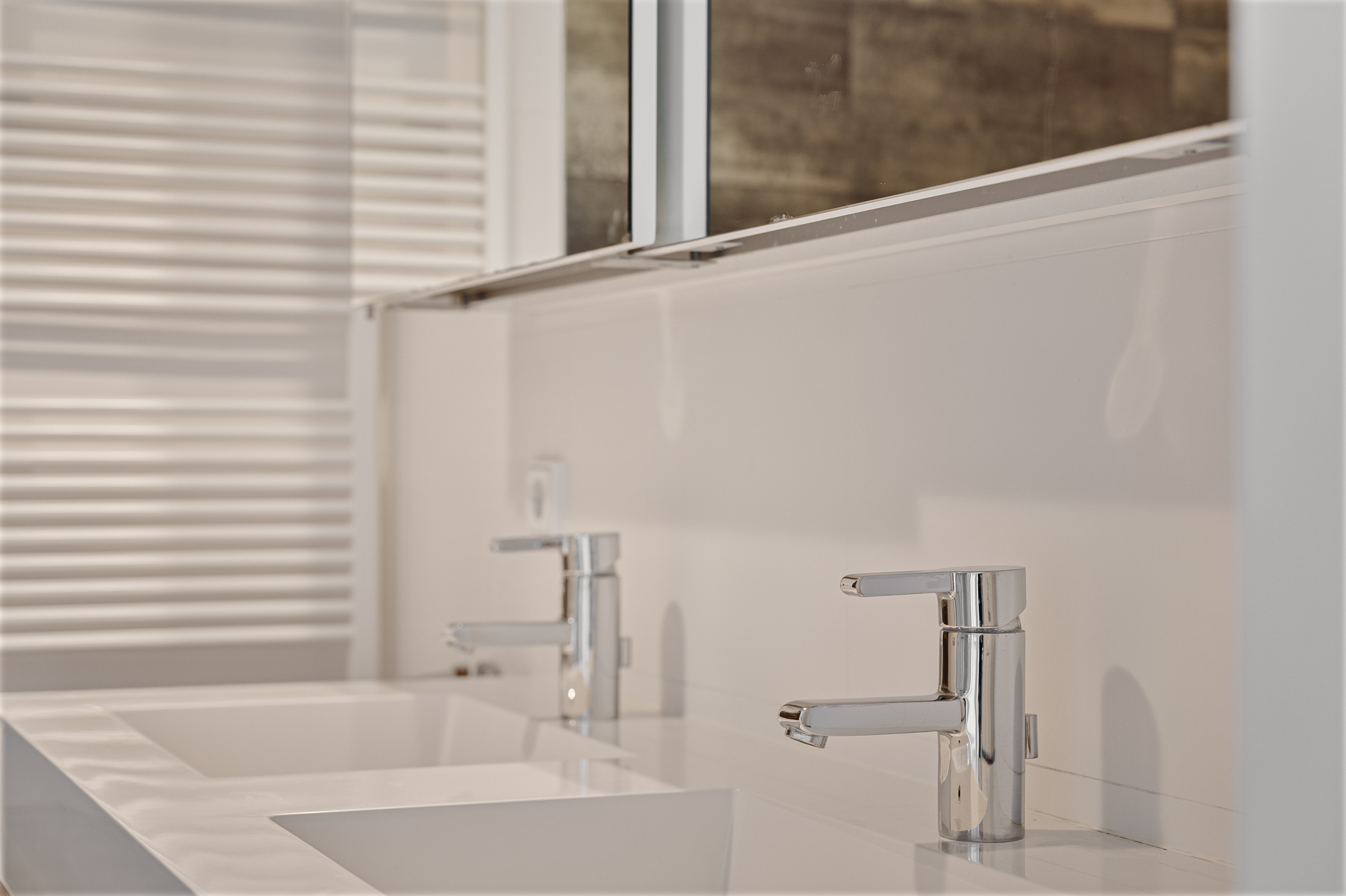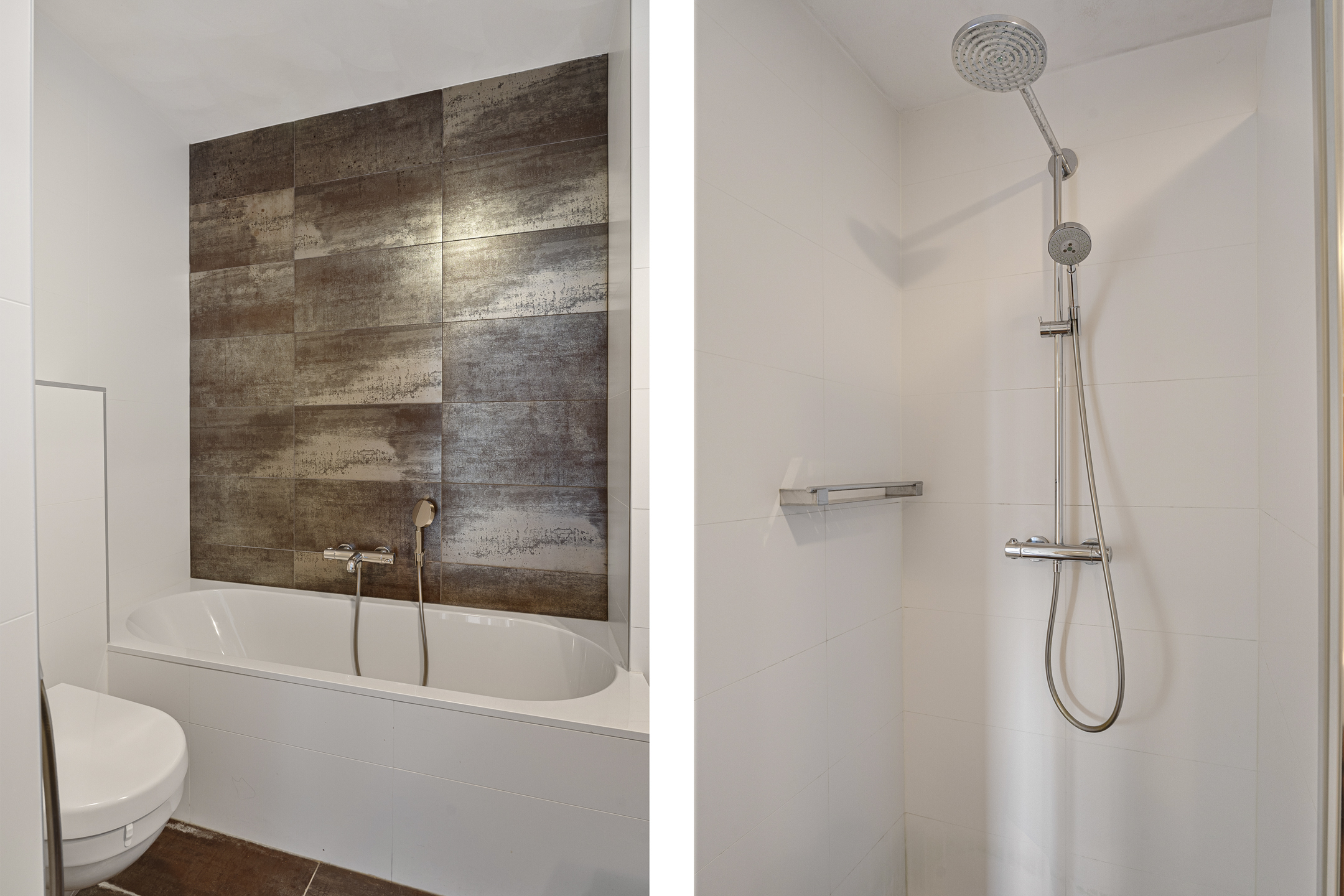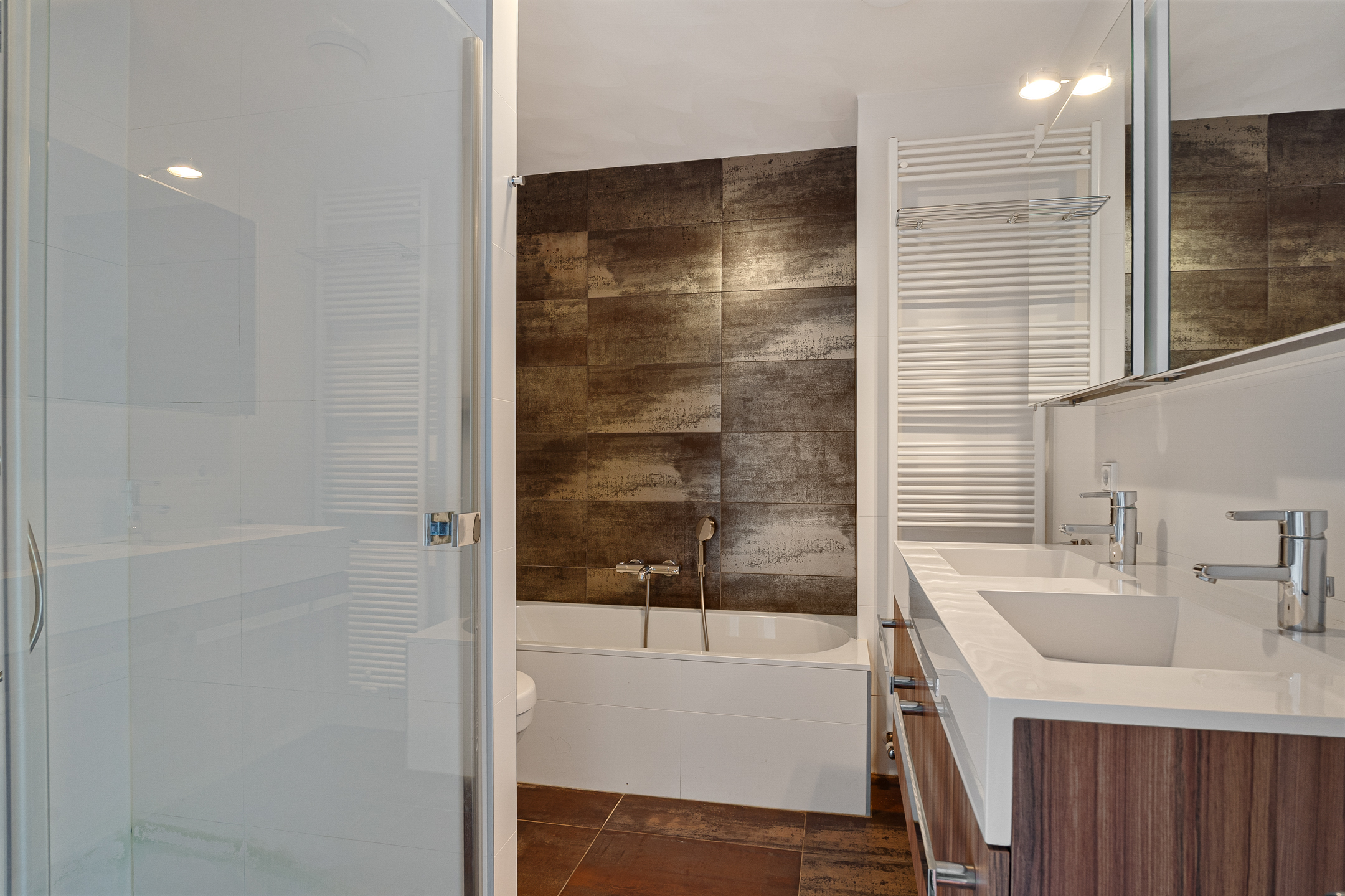 De badkamer (ca. 2.76 x 2.30 m) is ingericht met een tweede toilet, dubbele wastafel, badkamermeubel met spiegelkast, ligbad en aparte douchecabine.
