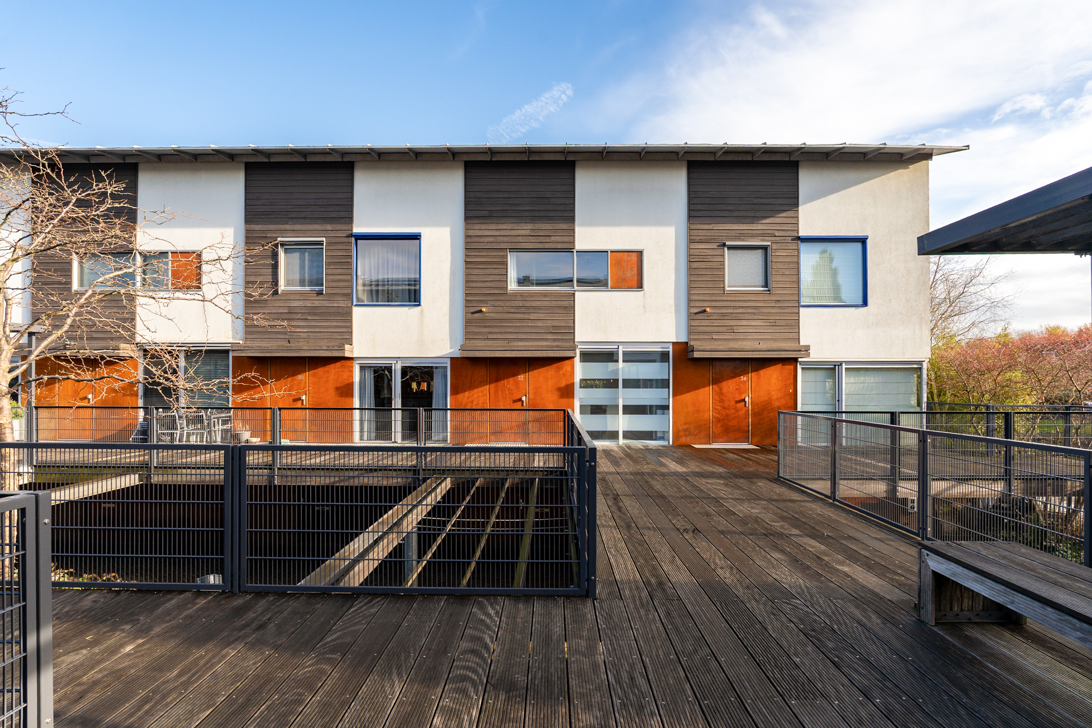 De achtertuin bestaat uit twee niveaus met houten terrassen en twee mooie bomen. Dankzij de ligging aan het water geniet je hier van rust, groen en een vrij uitzicht.