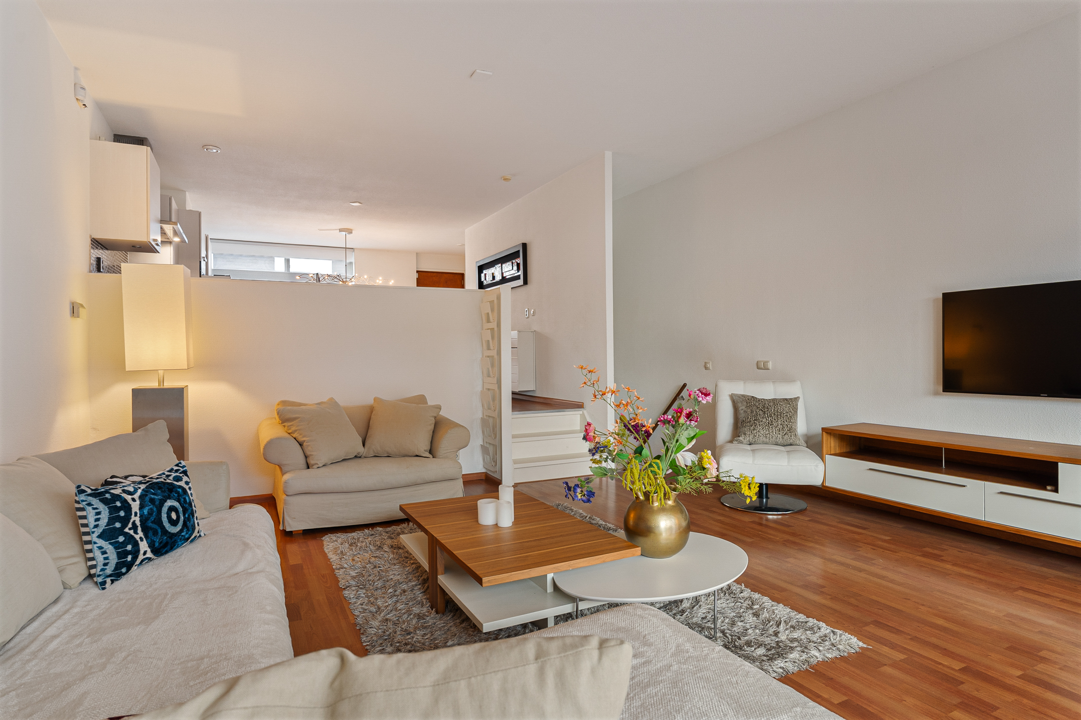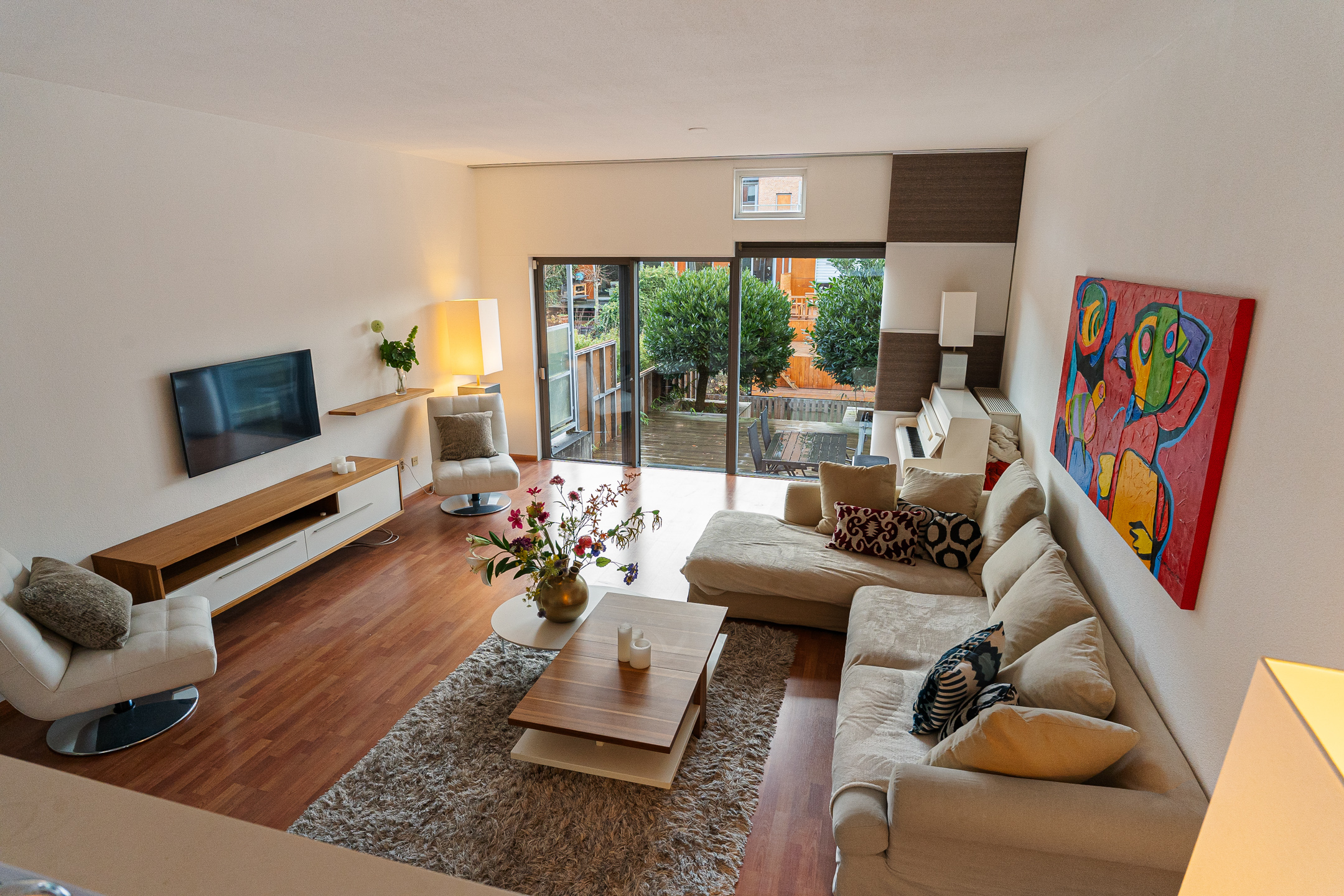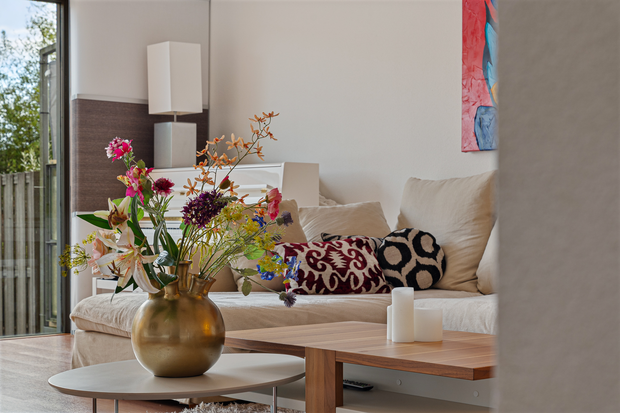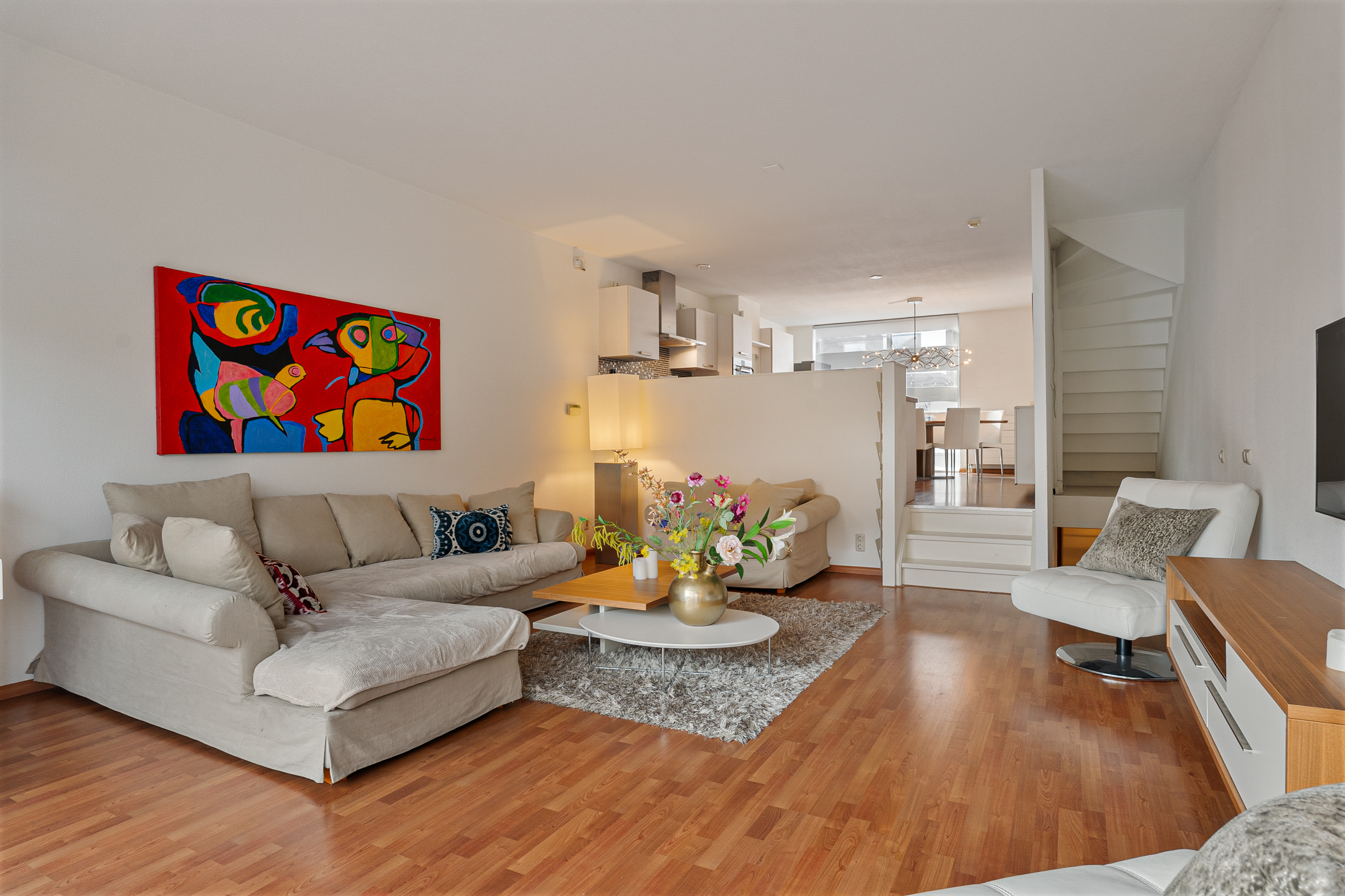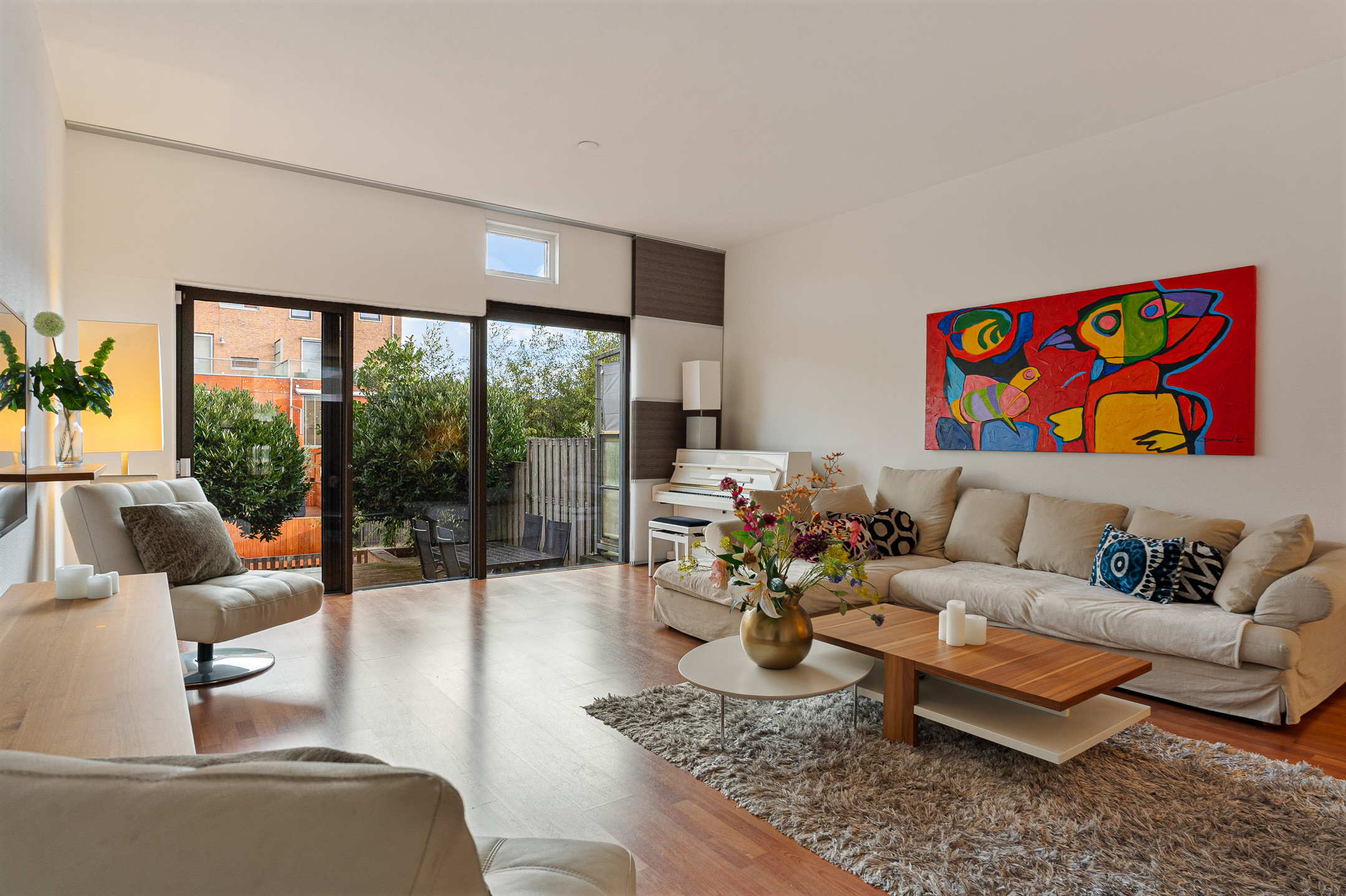 Hier bevindt zich de lichte, speelse woonkamer met hoog plafond en schuifpui naar de achtertuin. De neutrale laminaatvloer draagt bij aan de rustige uitstraling van de ruimte.
