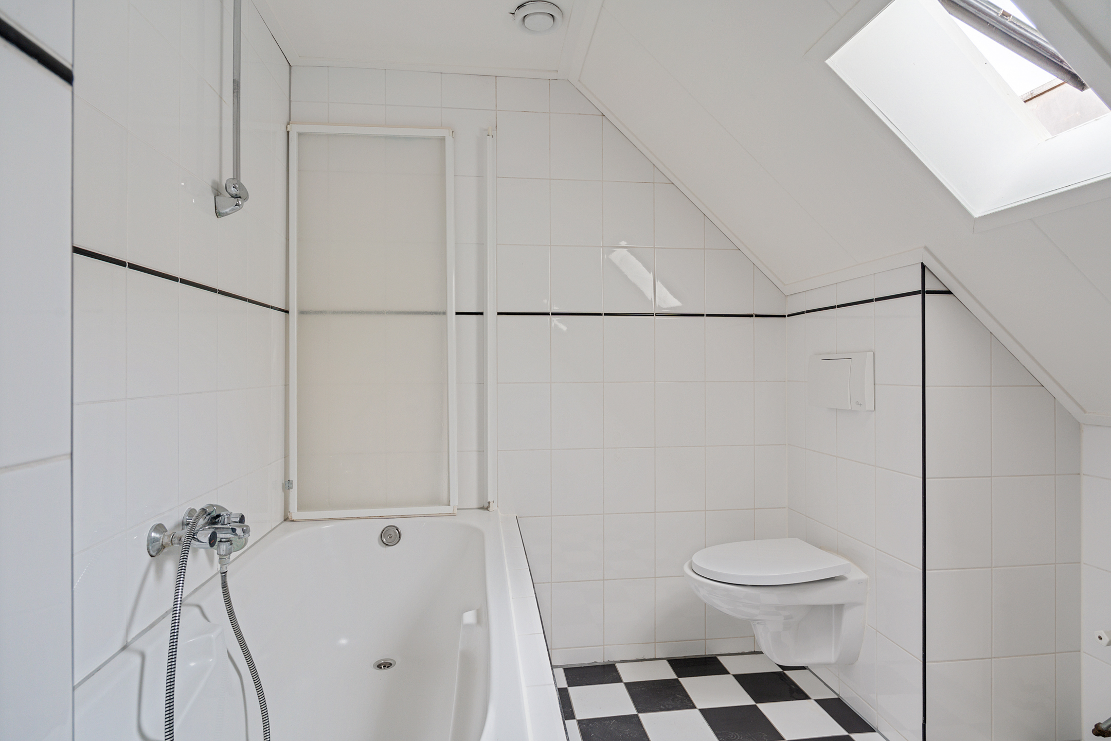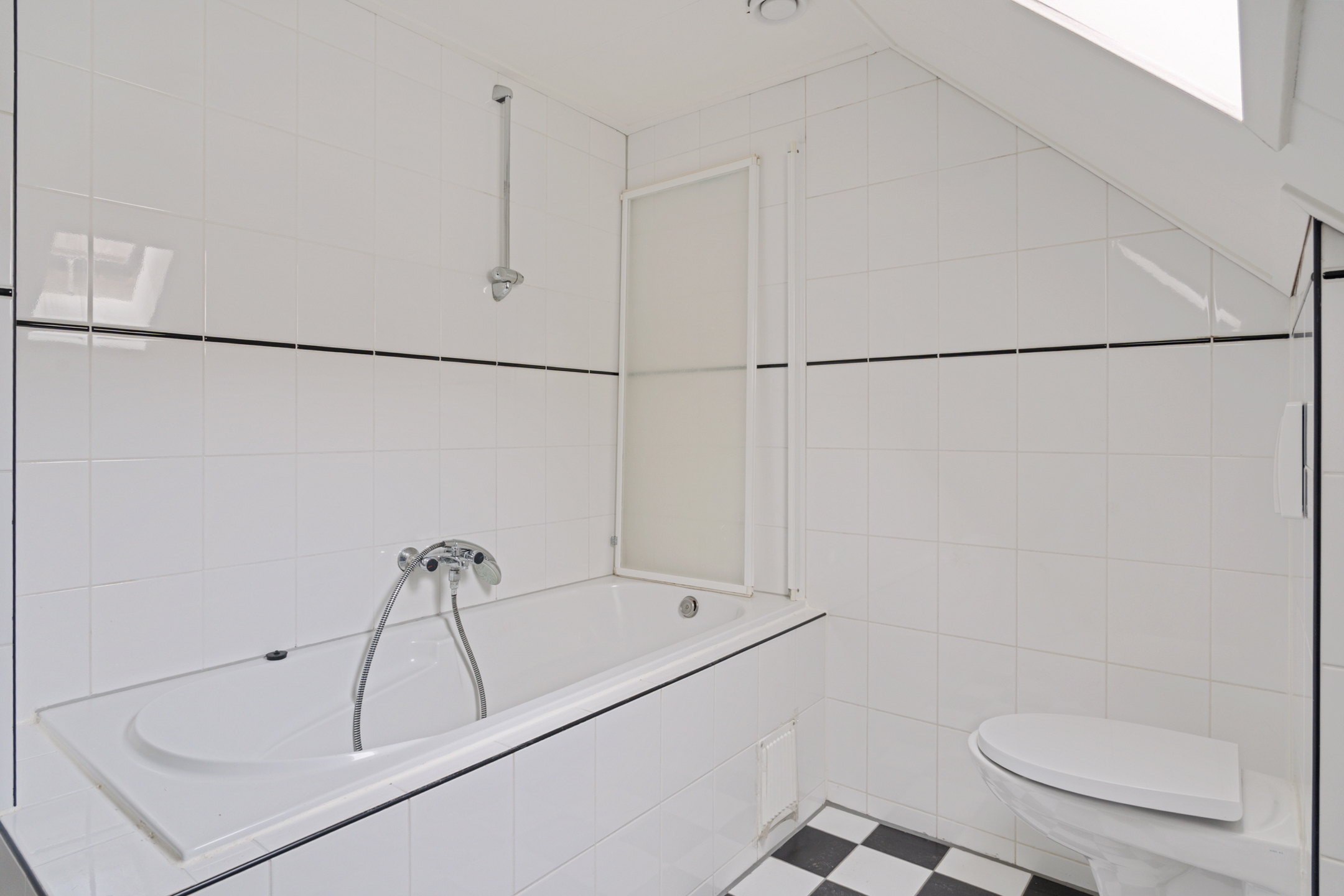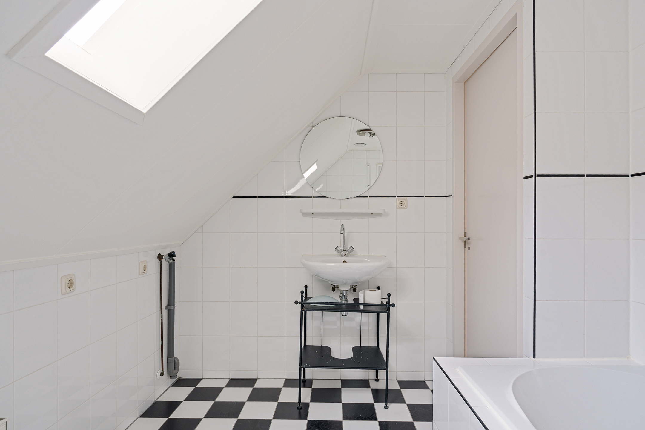 De royale badkamer is praktisch ingericht en voorzien van een ligbad met douchevoorziening, een wastafel en een extra toilet. Op de overloop is bovendien een vaste kast aanwezig met de opstelling van de recent vernieuwde combiketel.