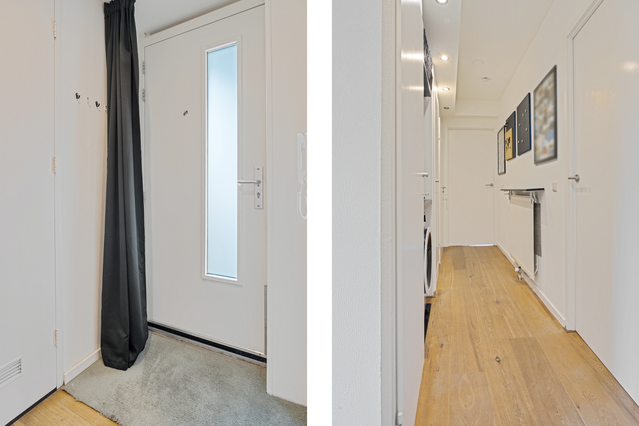Afgesloten entree met bellentableau en brievenbussen. Het appartement is gelegen op de eerste etage en bereikbaar via het trappenhuis of de lift, gevolgd door een loopbrug met enkele treden.