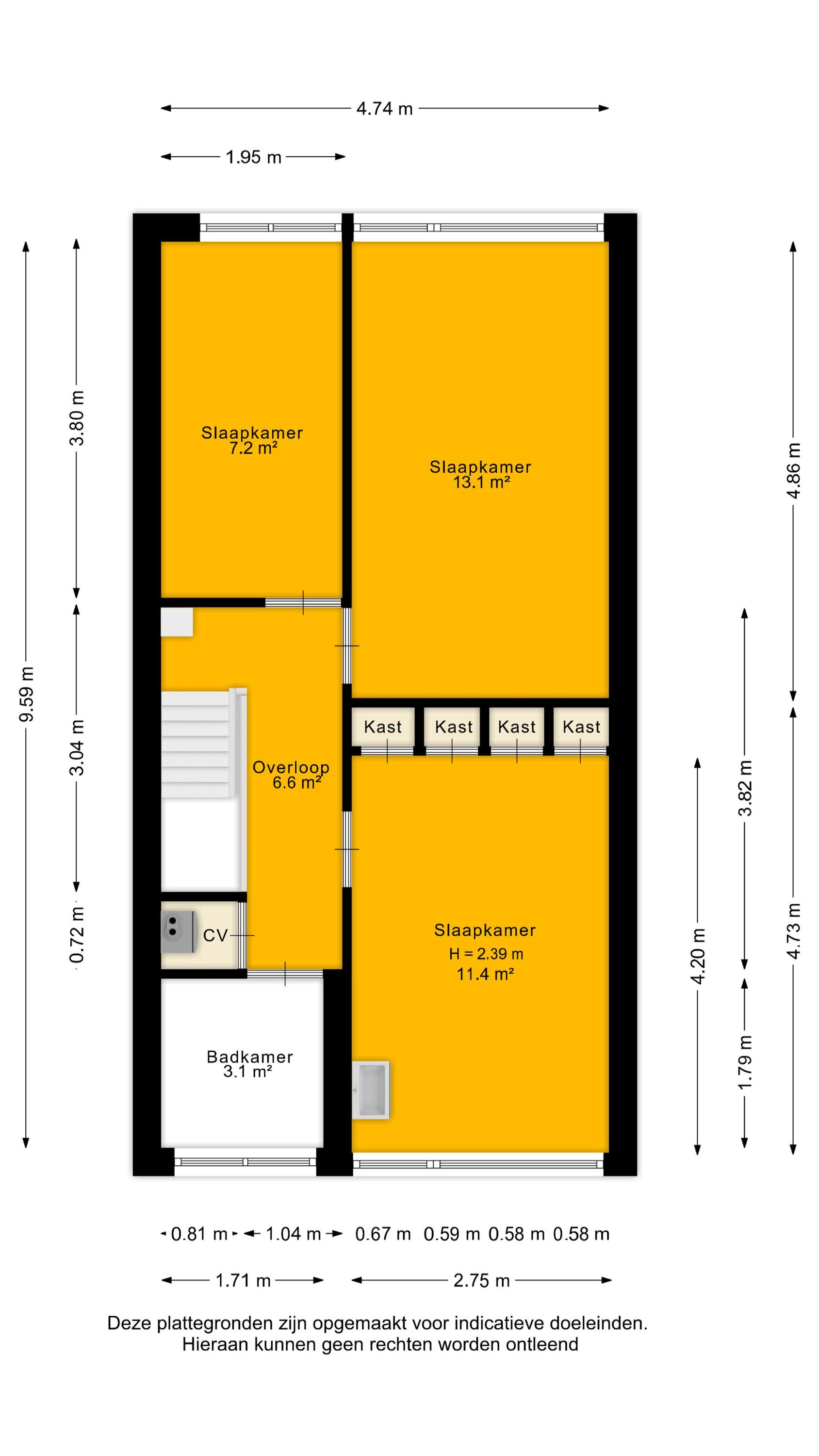 De opstelling van de cv-ketel bevindt zich op de overloop. Deze verdieping biedt veel mogelijkheden om de indeling naar eigen wens aan te passen of te optimaliseren.