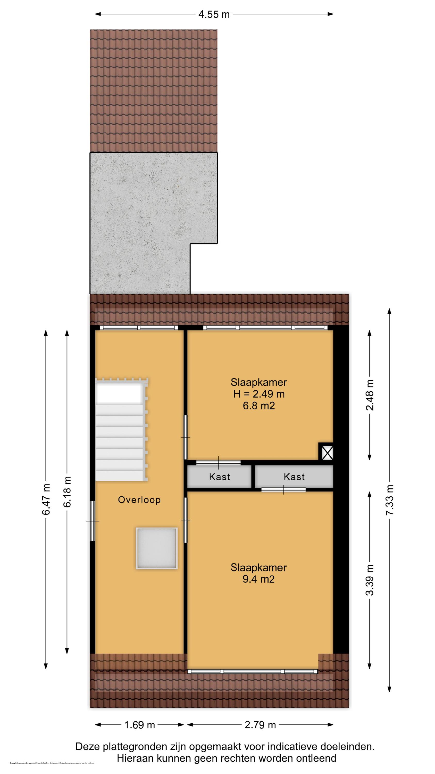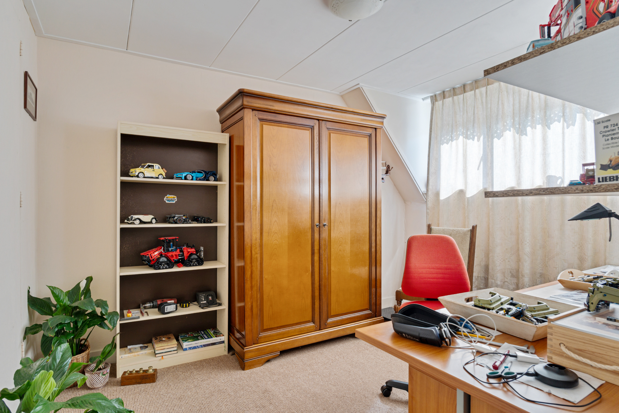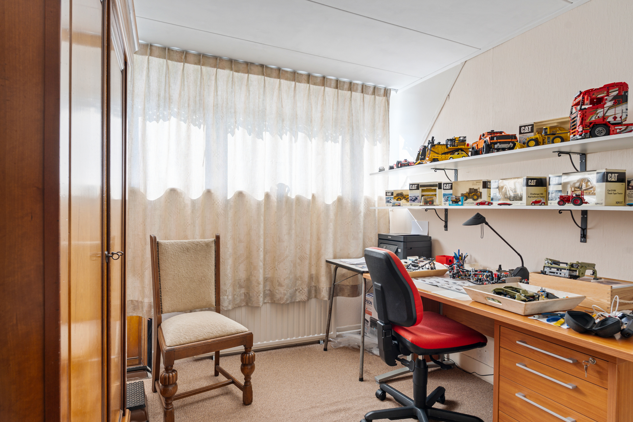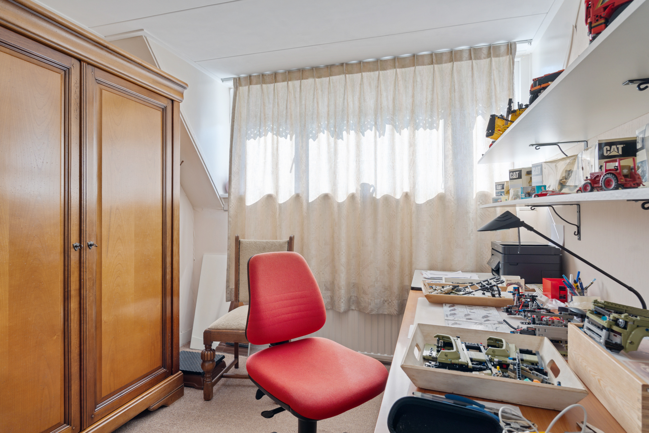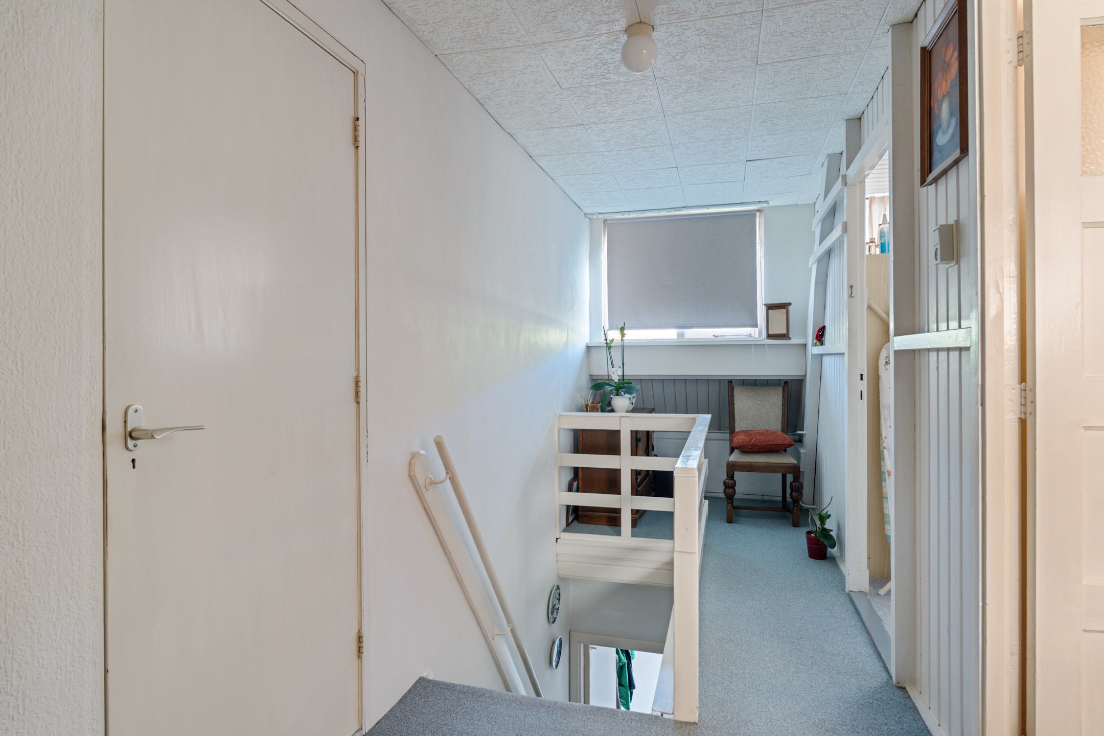 Op de eerste verdieping zijn twee slaapkamers aanwezig, één aan de voorzijde en één aan de achterzijde, beide met vaste kasten. De overloop biedt toegang tot de vliering, handig voor extra opslagruimte.