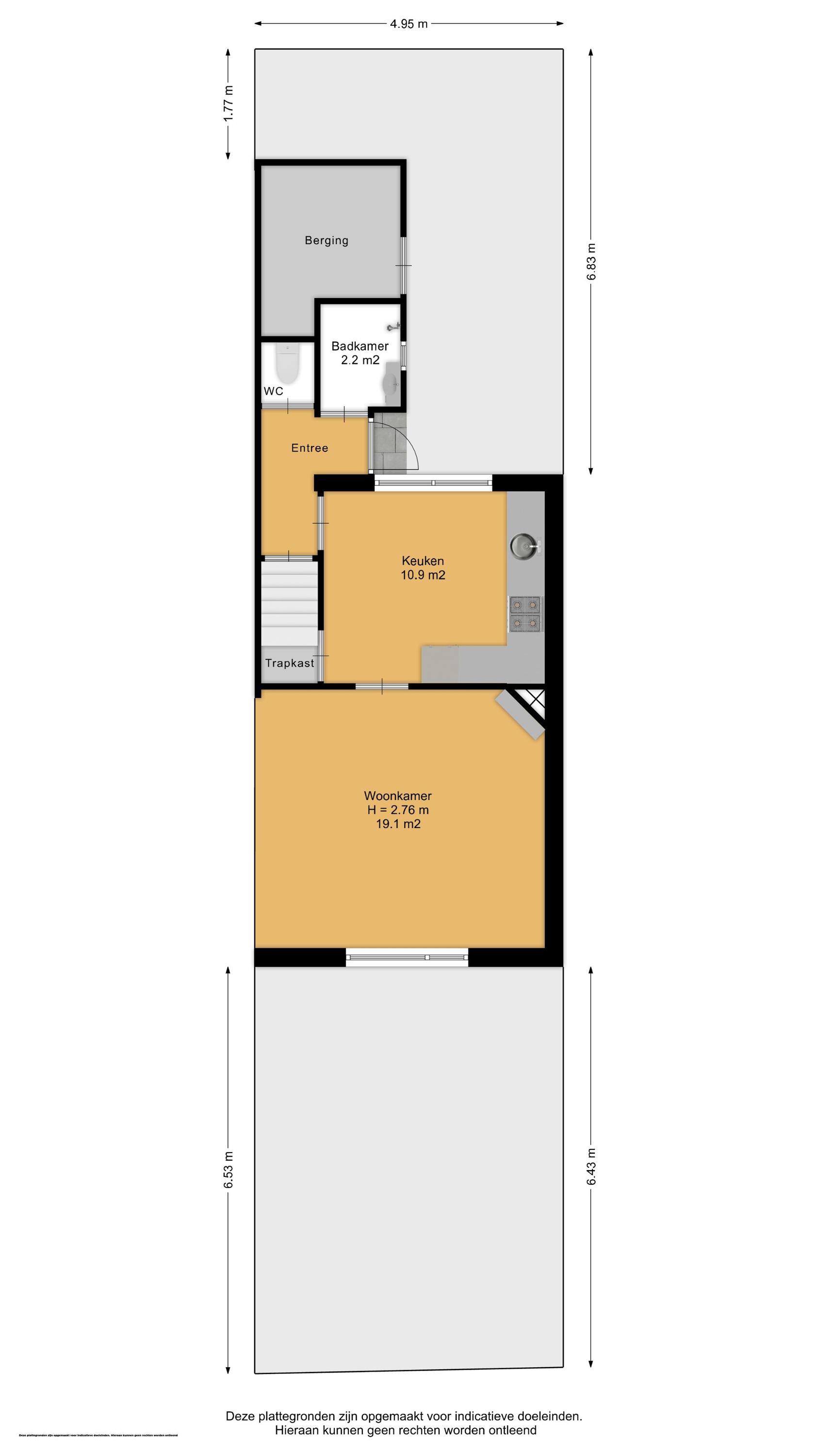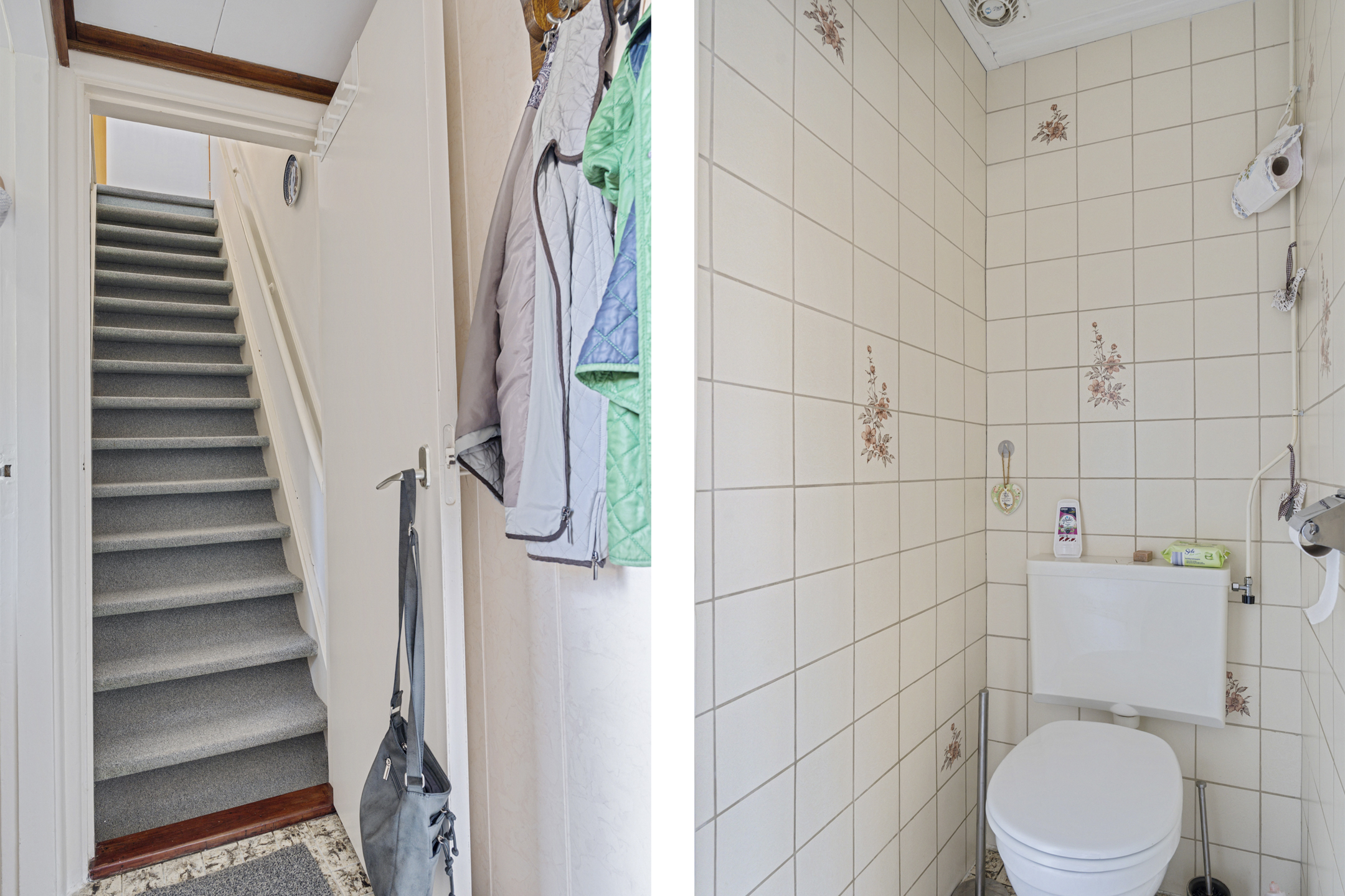 De entree bevindt zich aan de achterzijde van de woning. Via de compacte buitenruimte kom je binnen in de hal, waar je direct het separate toilet vindt. De keuken ligt eveneens aan de achterzijde en beschikt over een aansluiting voor de wasmachine en droger. De woonkamer aan de voorzijde kijkt uit over de Zegwaartseweg