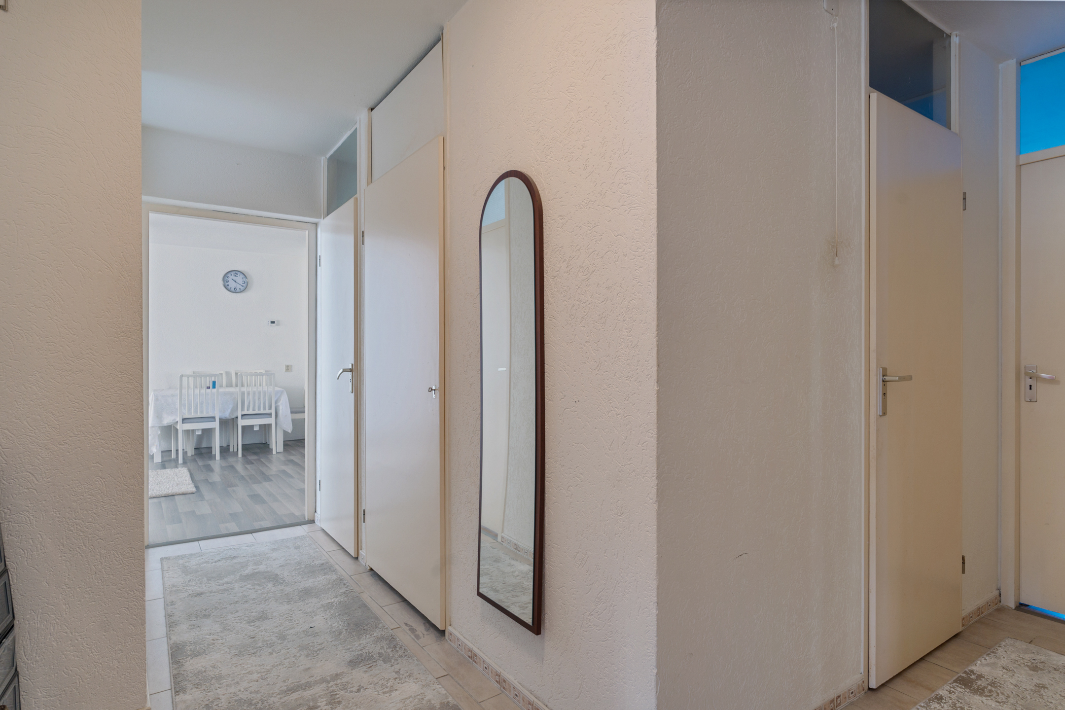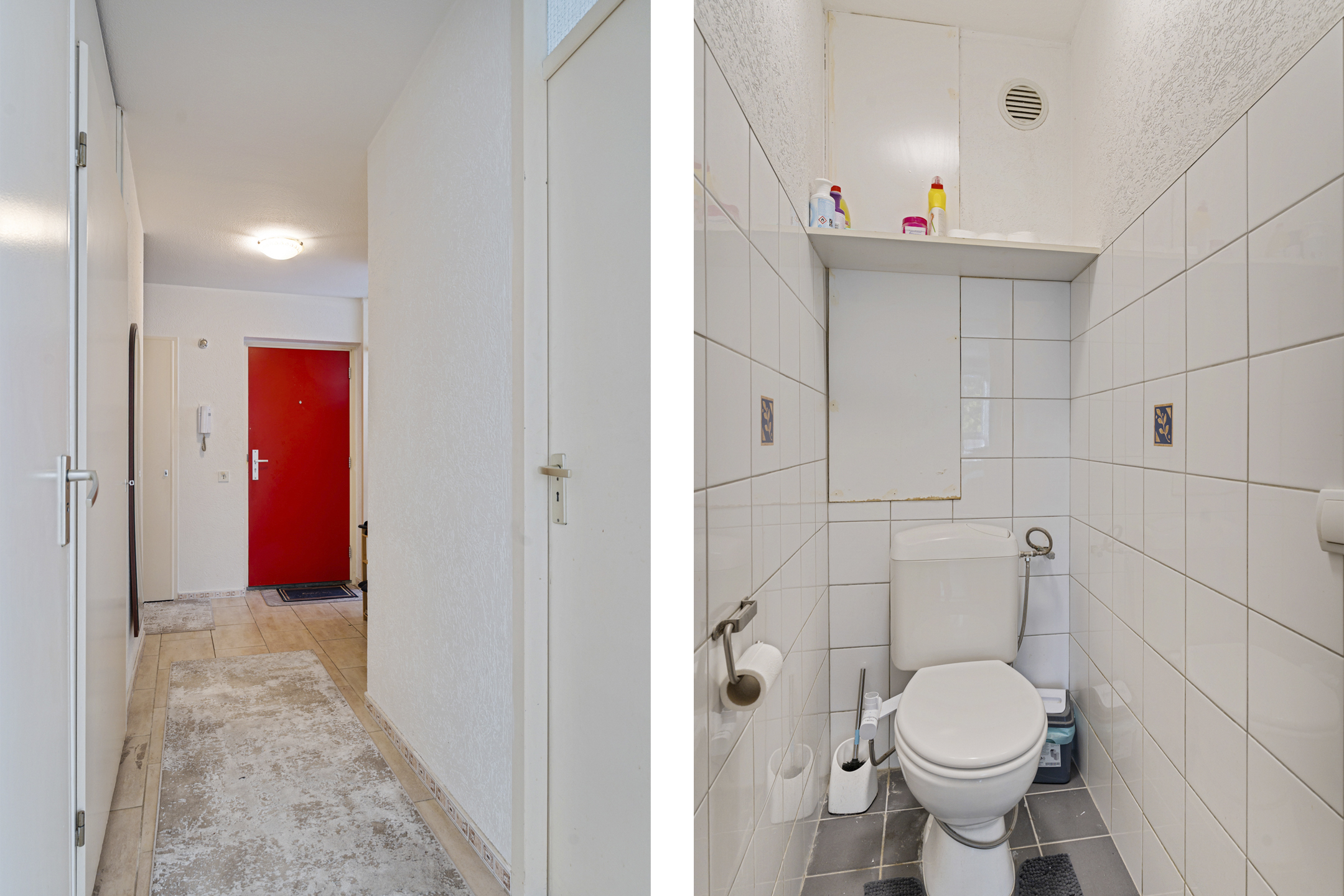 Via de entree kom je in een ruime hal met een vaste kast en een separaat toilet met fontein. Vanuit de hal zijn alle vertrekken te bereiken.
