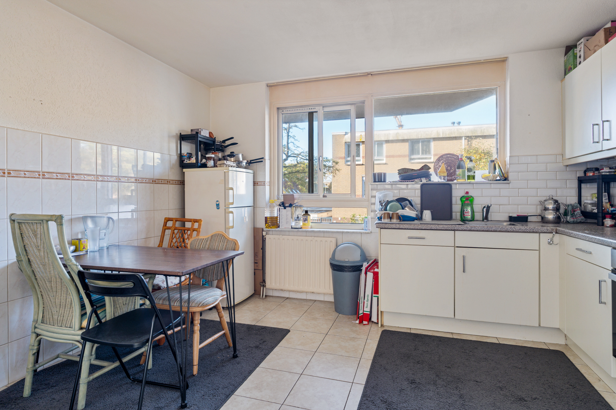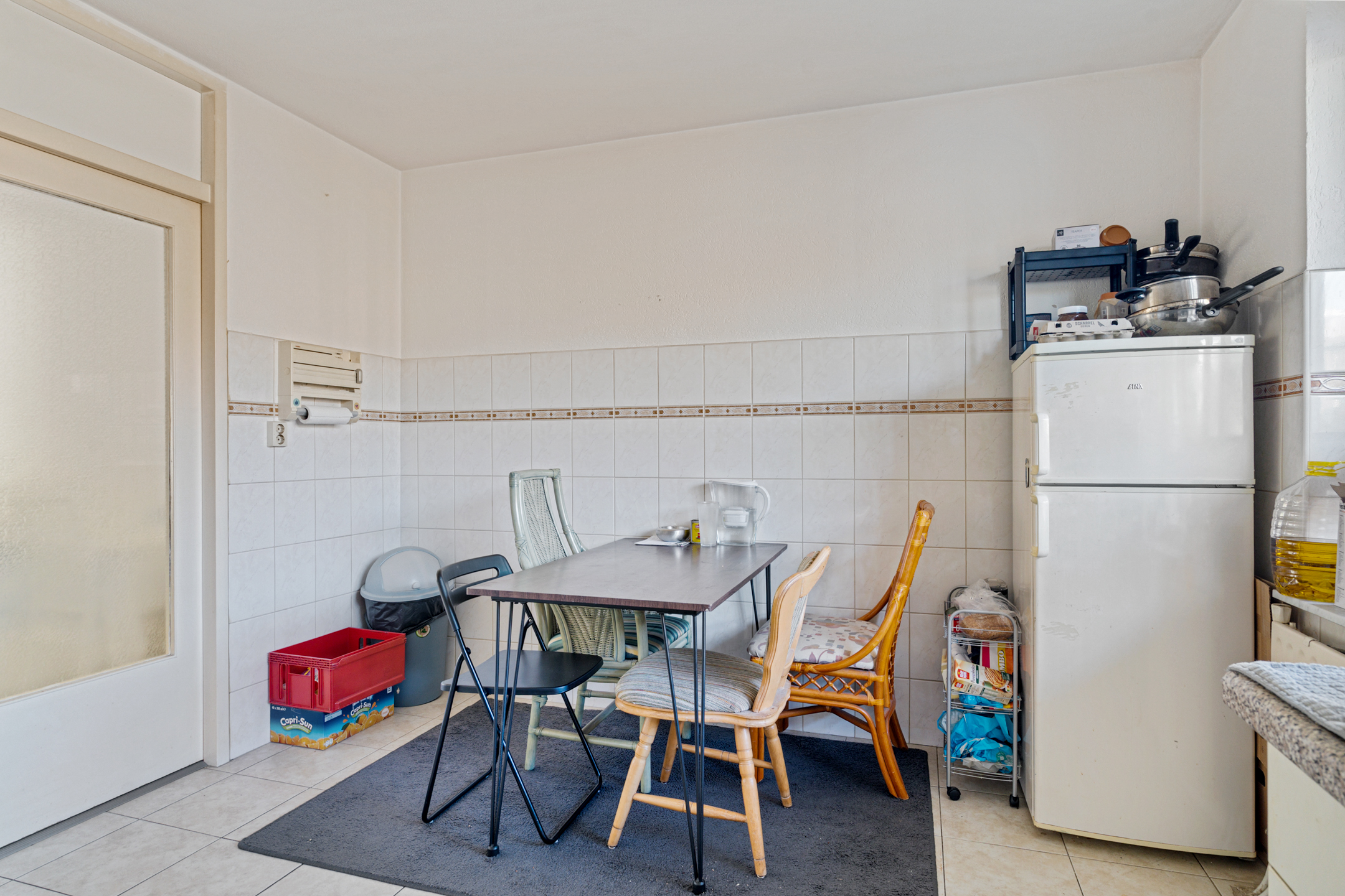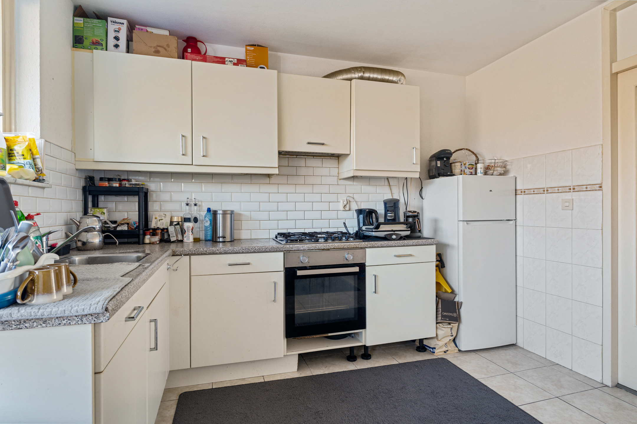 De keuken biedt volop ruimte voor een eettafel en is uitgerust met een gasfornuis en oven.