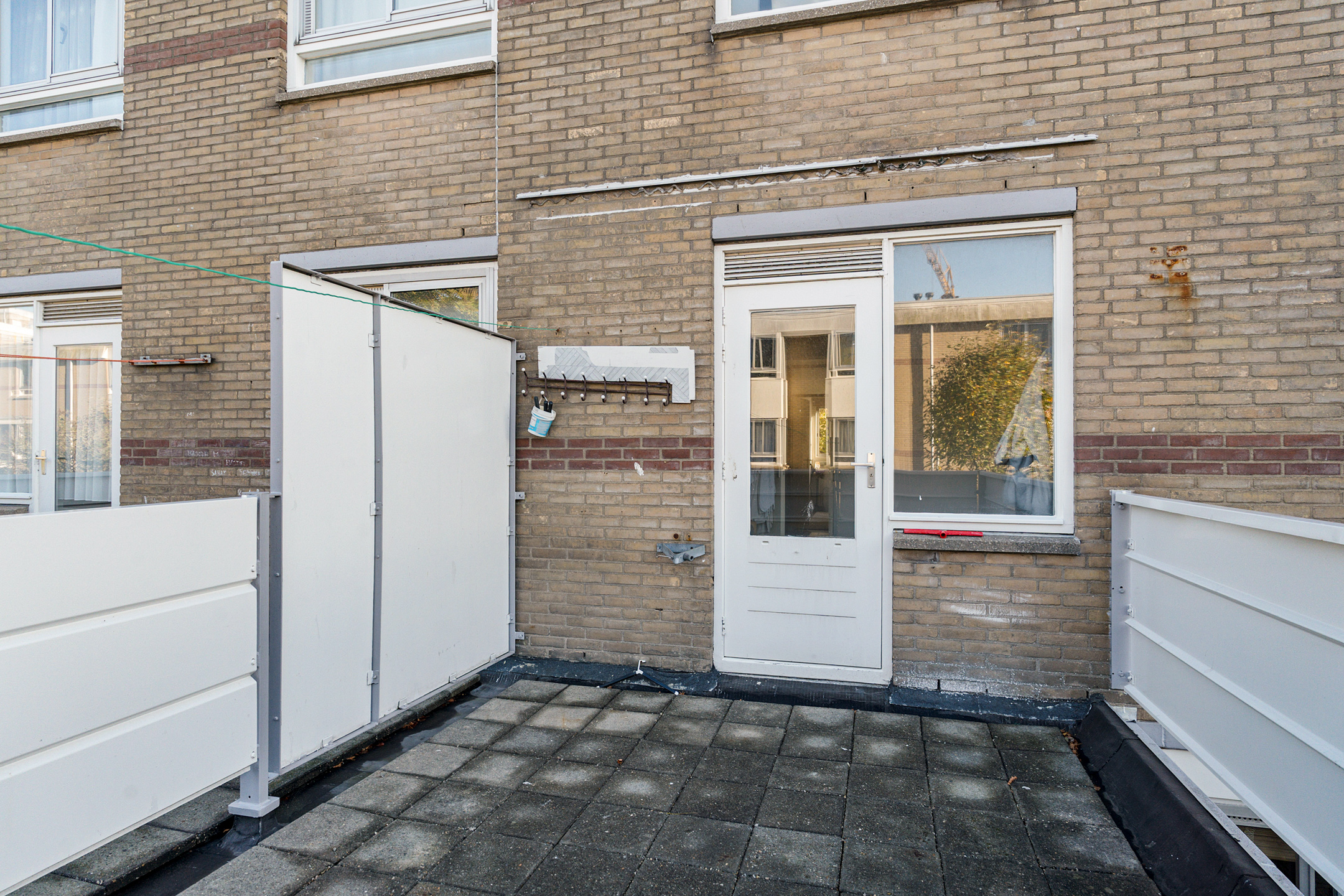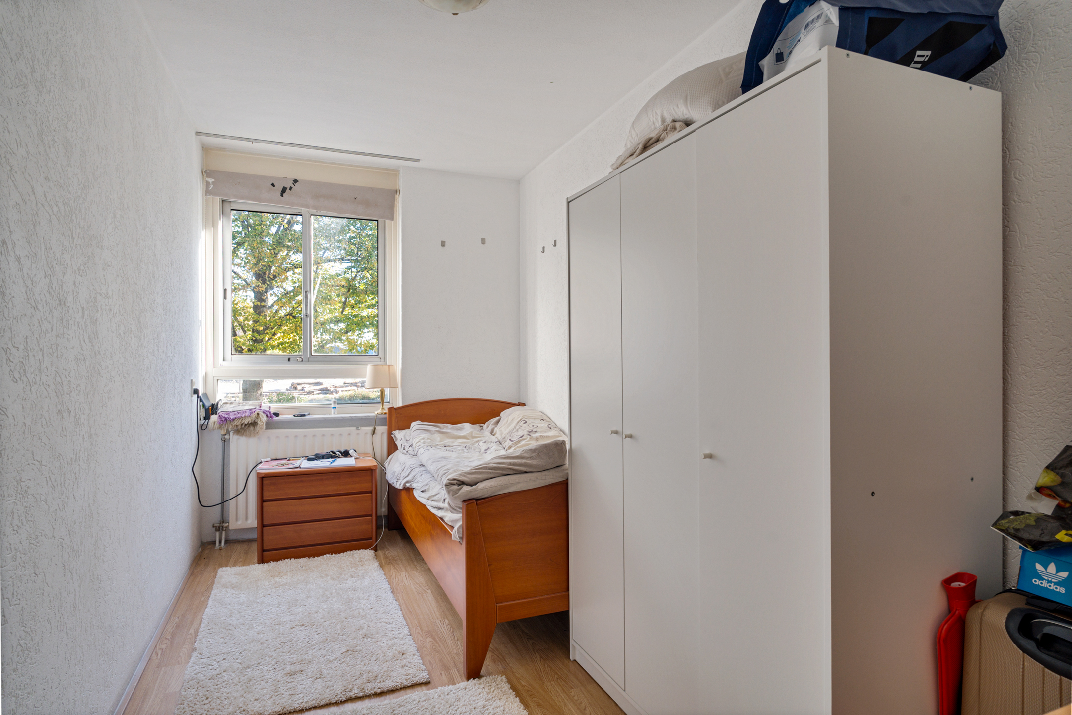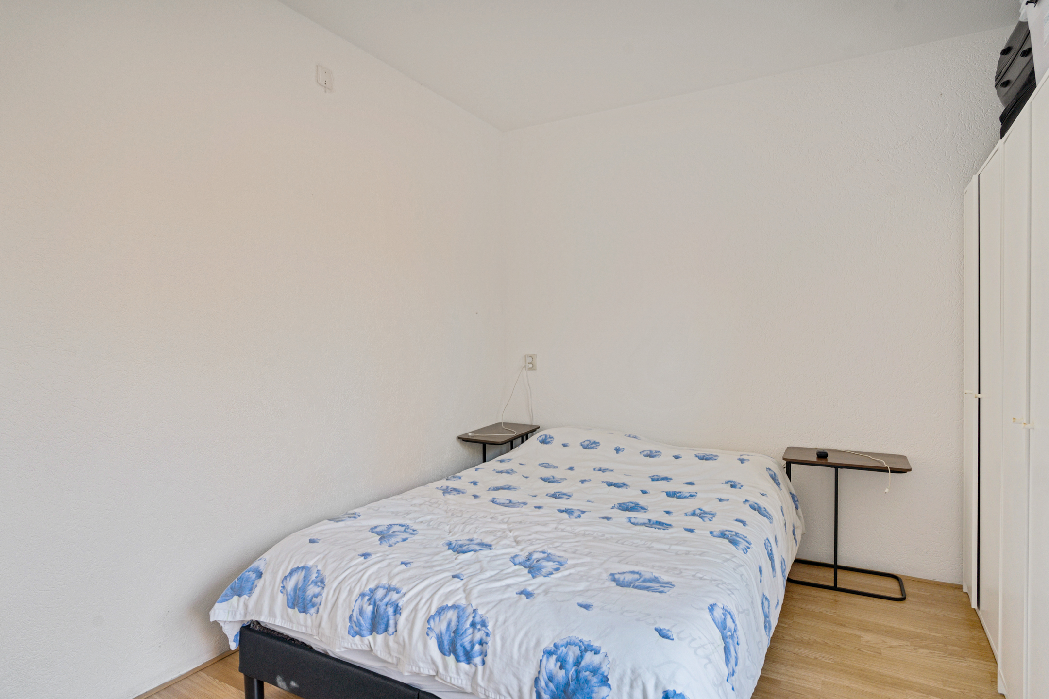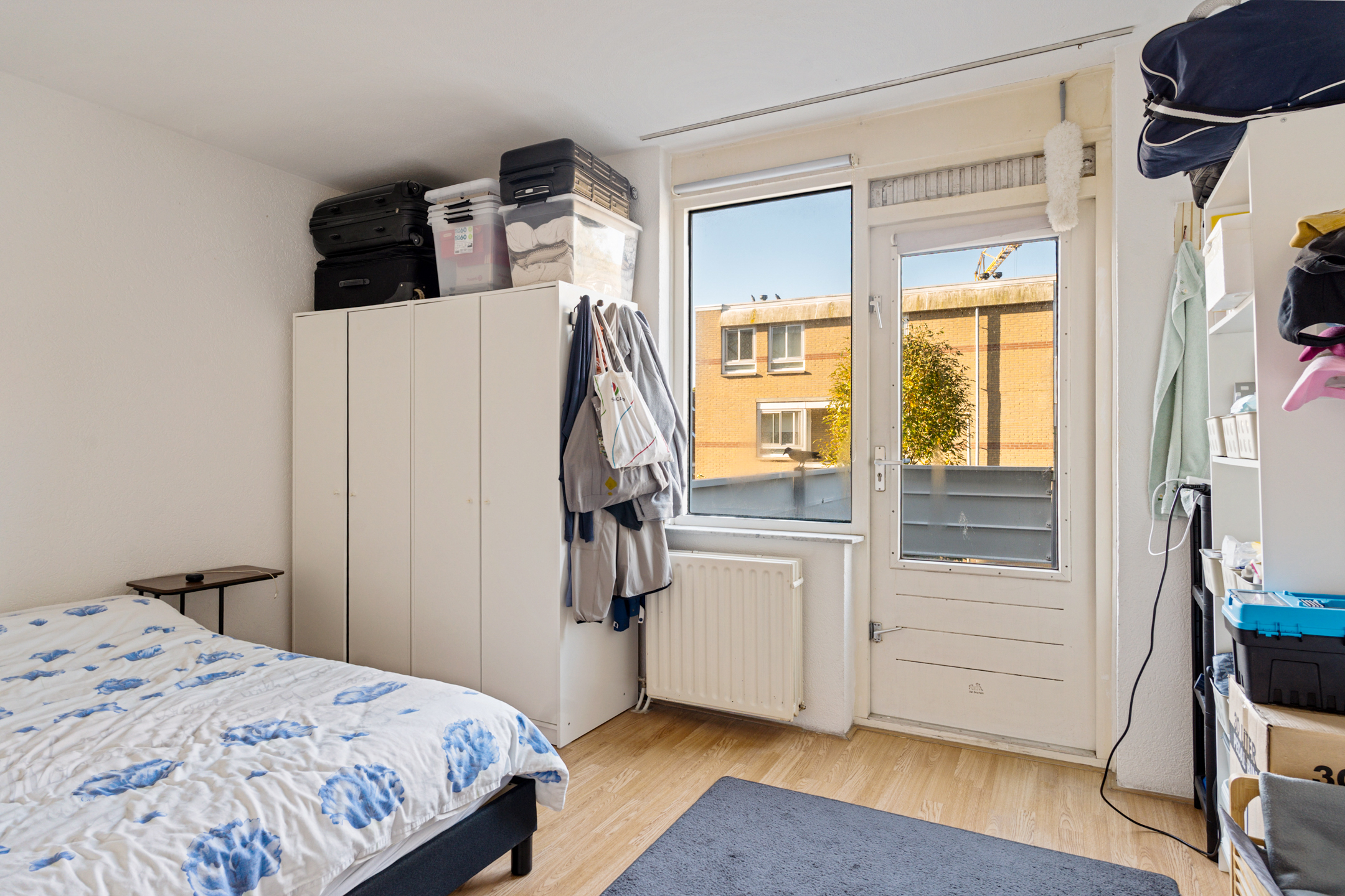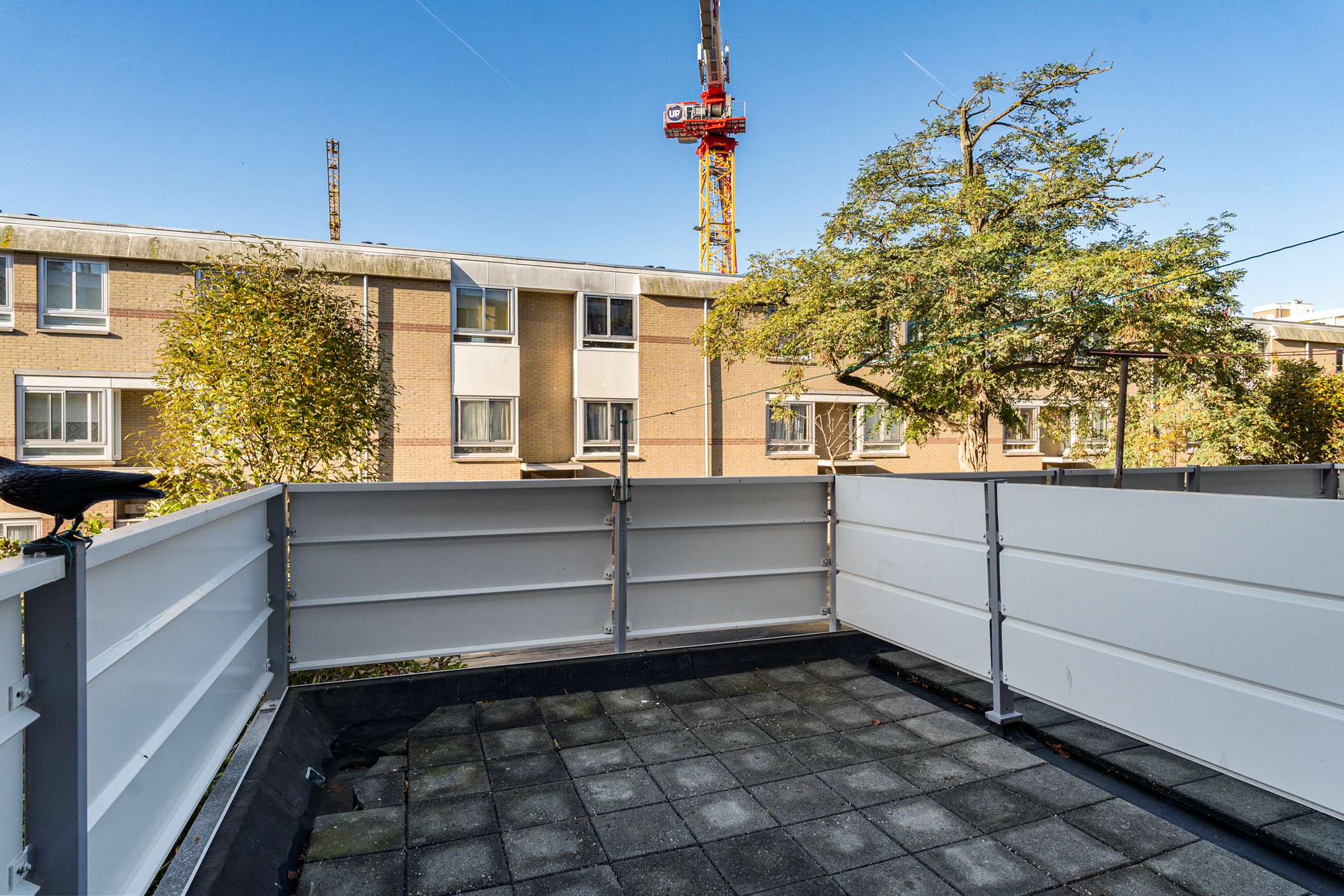 Aan de achterzijde bevindt zich een ruime slaapkamer van circa 11,6 m² met directe toegang tot het dakterras van circa 14,5 m². Dit is een heerlijke plek om te ontspannen en te genieten van de middag- en avondzon. De badkamer (circa 3,3 m²) is netjes afgewerkt en voorzien van een douche, wastafel en wasmachineaansluiting.