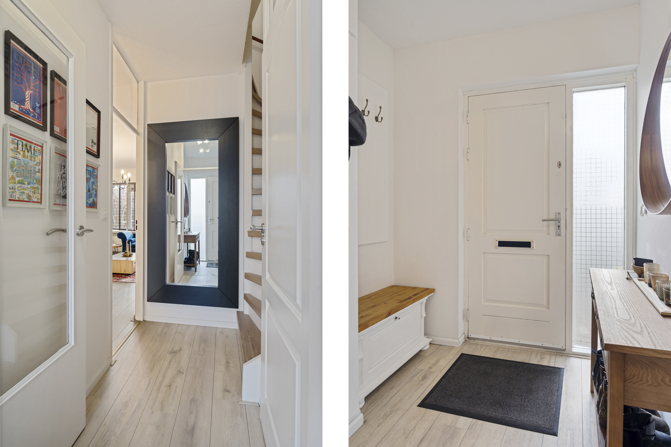 Via de verzorgde voortuin bereik je de entree van de woning. In de hal bevinden zich de meterkast, de toiletruimte met fonteintje en de trapopgang naar de verdiepingen. Vanuit de hal heb je tevens toegang tot de ruime berging aan de voorzijde, ideaal voor fietsen en extra opslagruimte.