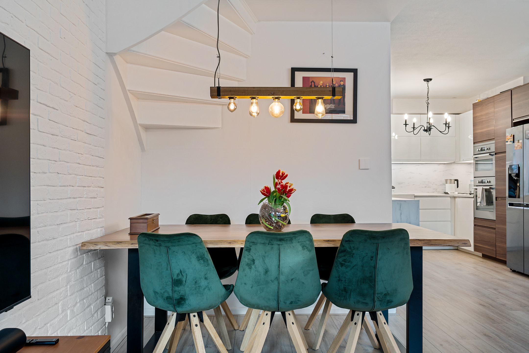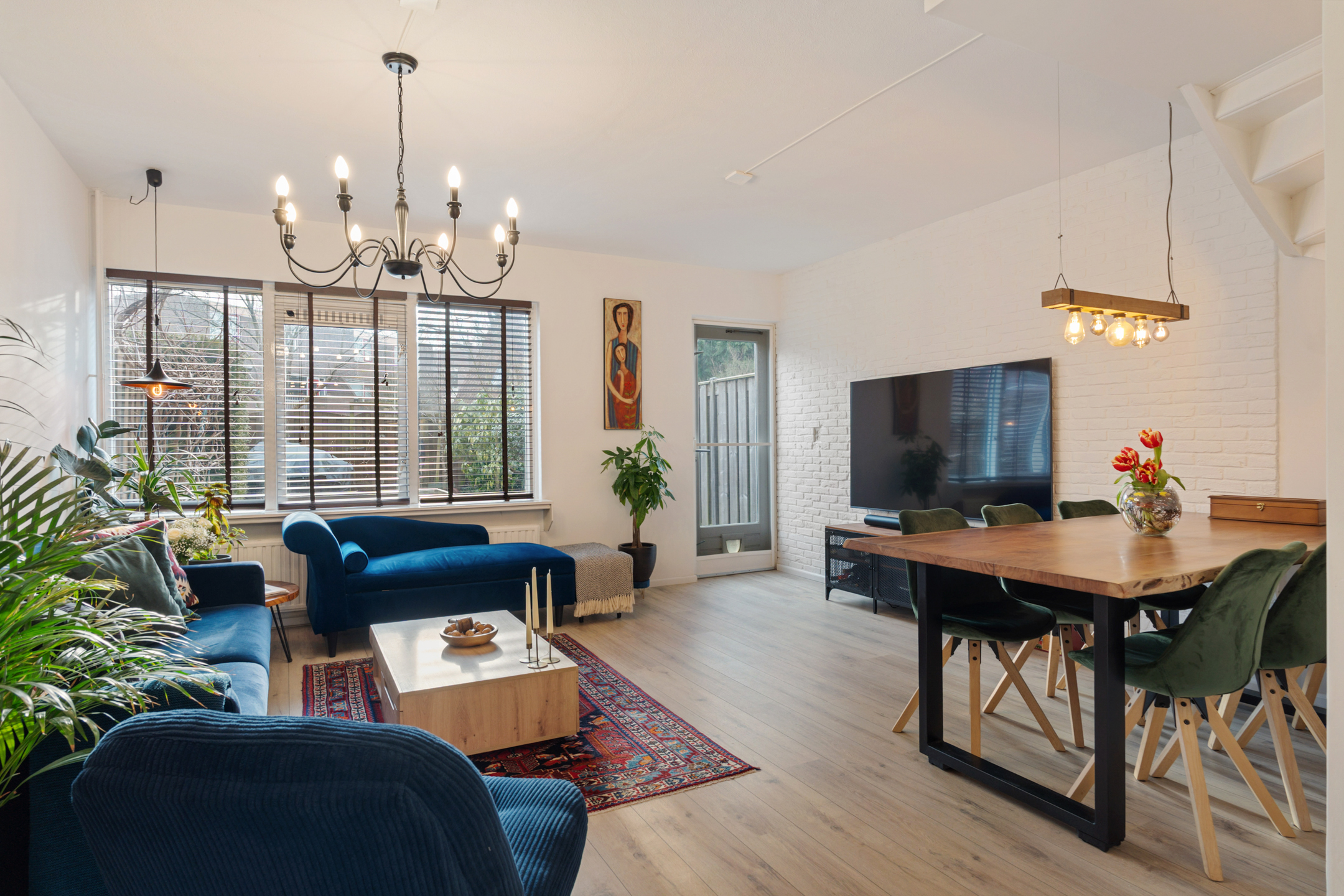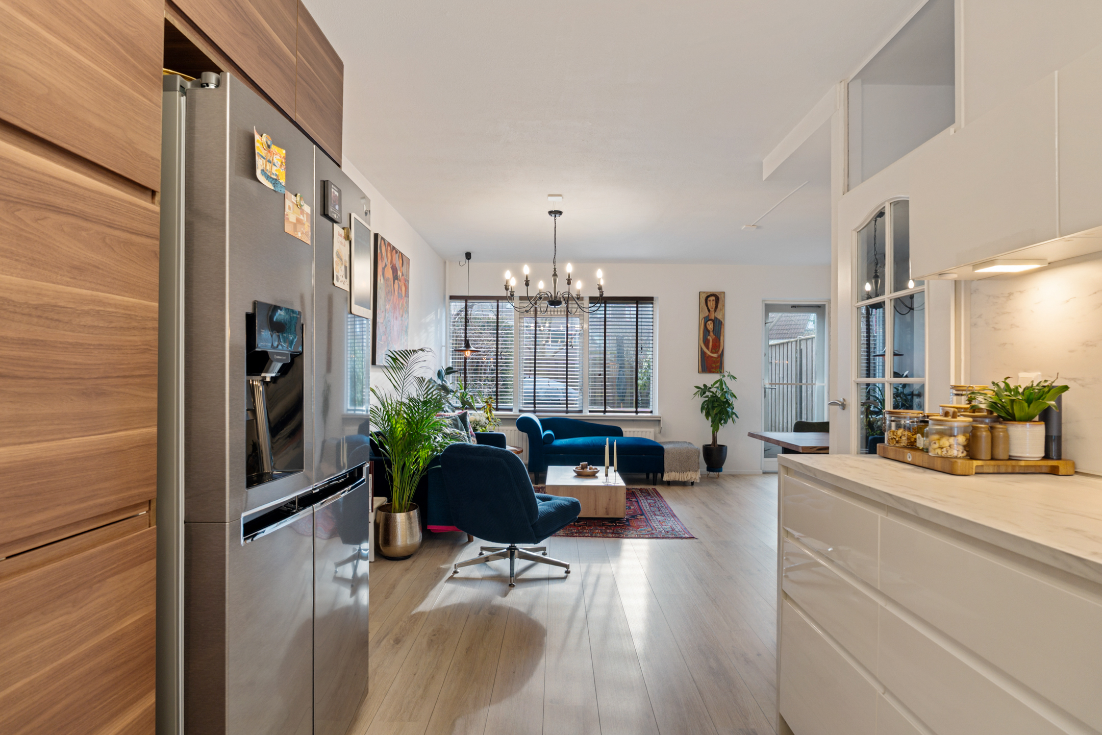 De lichte woonkamer ligt aan de tuinzijde en beschikt over een prettige lichtinval. Vanuit hier heb je directe toegang tot de half open keuken. Zowel de woonkamer als de hal zijn uitgevoerd met een moderne parketvloer, wat zorgt voor een warme en stijlvolle uitstraling.
