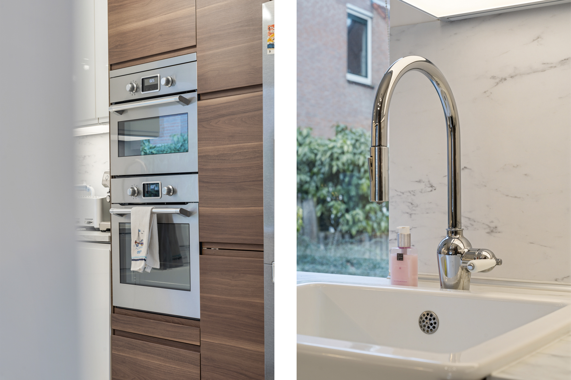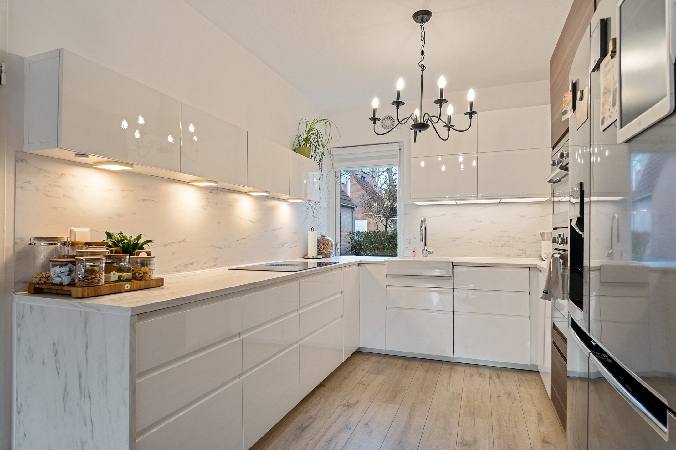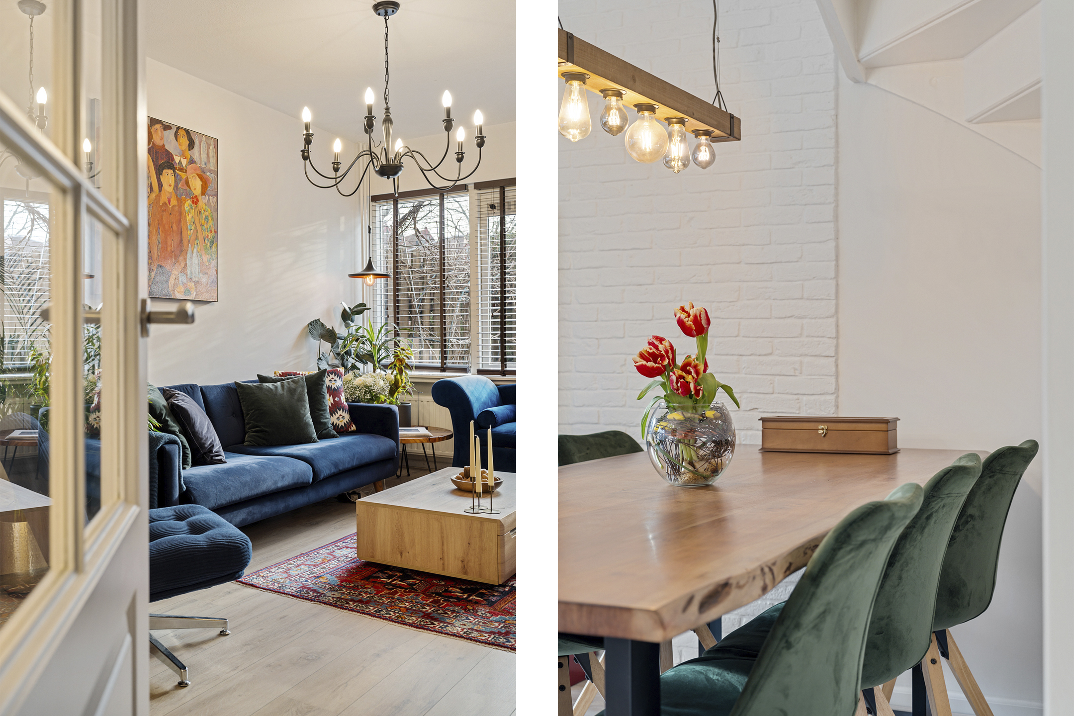 De lichte woonkamer ligt aan de tuinzijde en beschikt over een prettige lichtinval. Vanuit hier heb je directe toegang tot de half open keuken. Zowel de woonkamer als de hal zijn uitgevoerd met een moderne parketvloer, wat zorgt voor een warme en stijlvolle uitstraling.