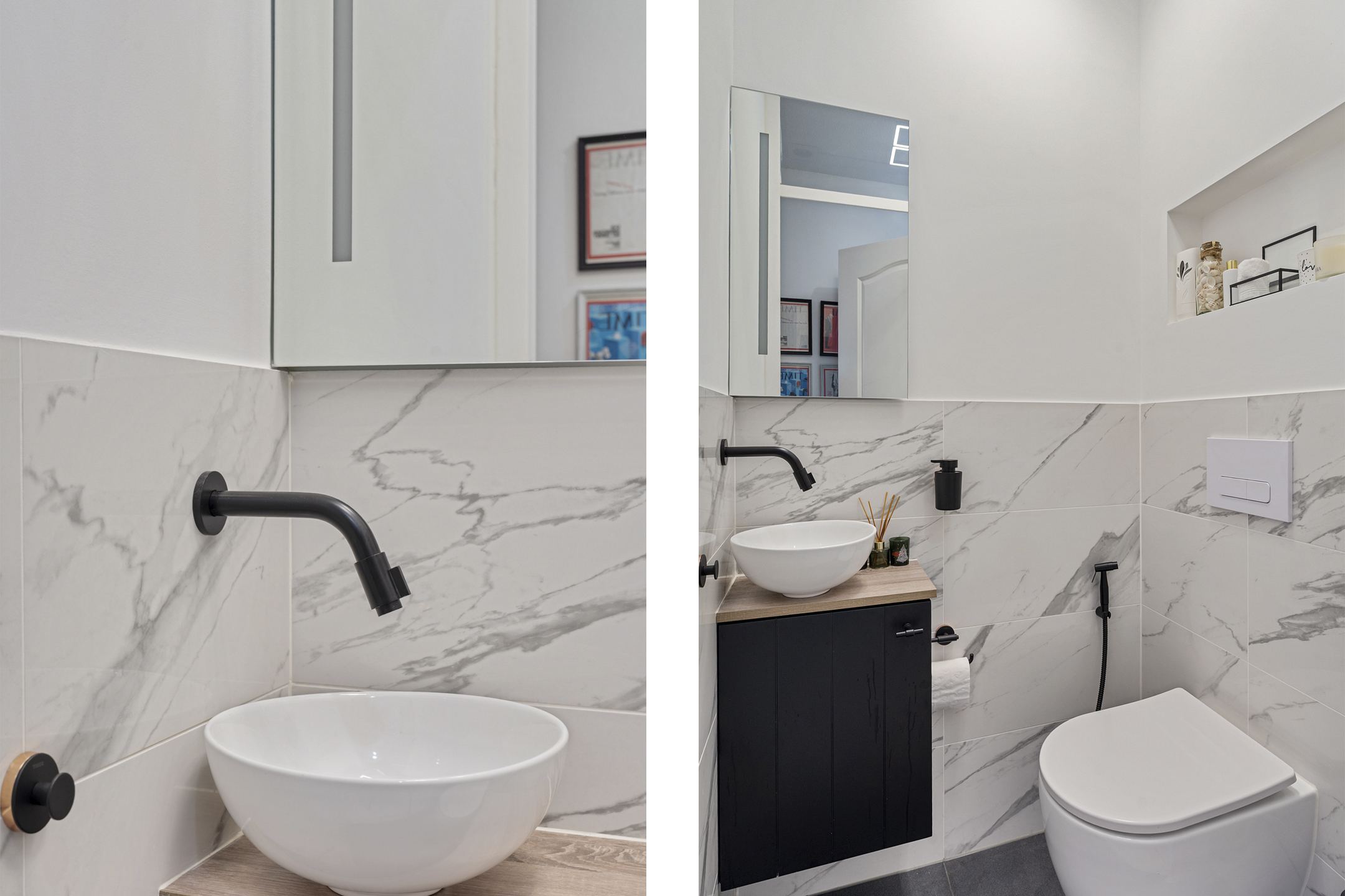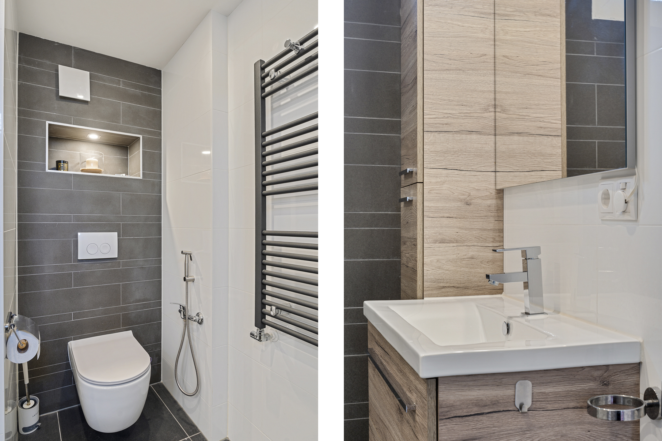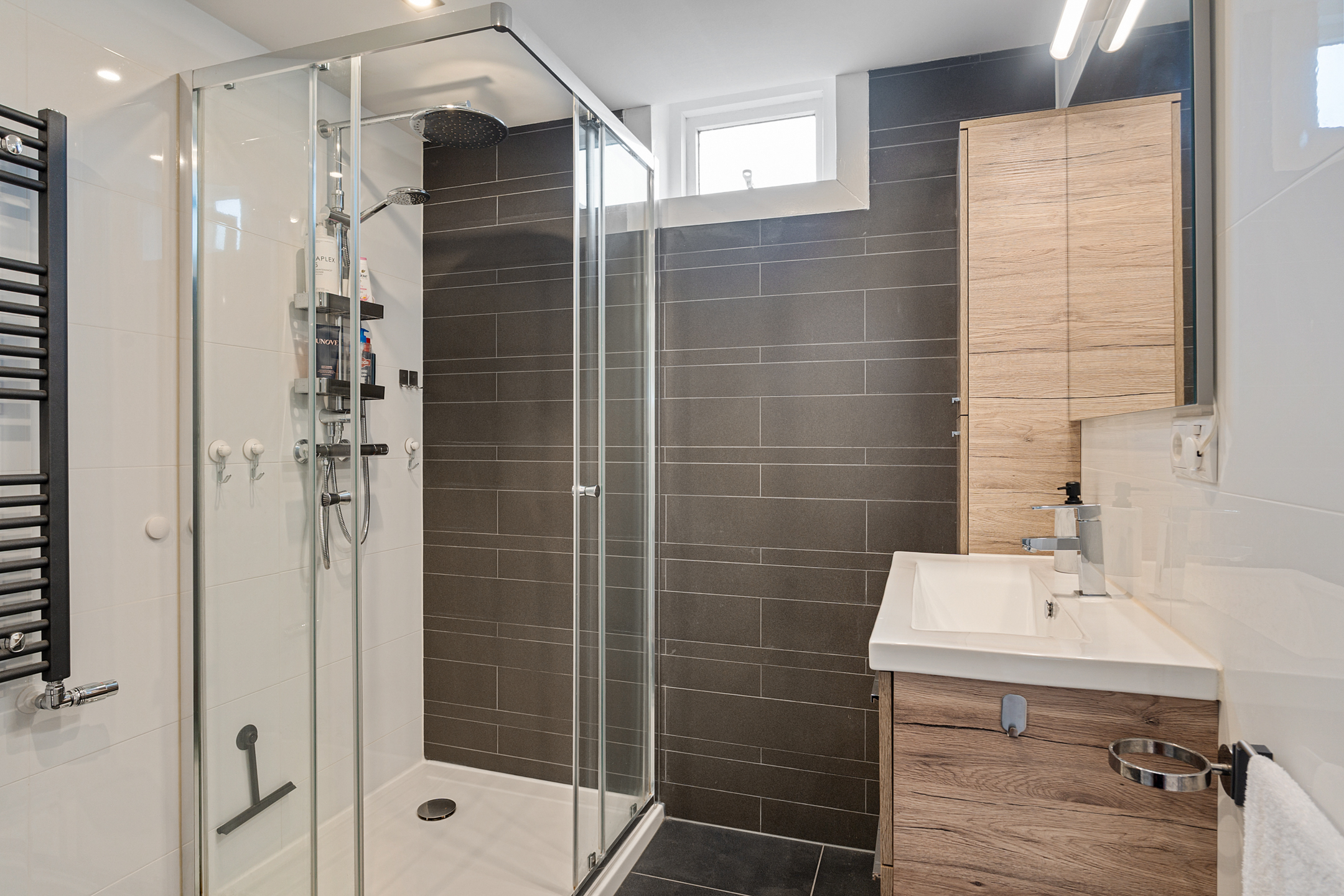 De moderne badkamer is strak en eigentijds afgewerkt met een fraaie combinatie van lichte en donkere tegels. Je beschikt hier over een ruime inloopdouche met glazen wand, een hangtoilet, een stijlvol wastafelmeubel met bergruimte en een designradiator. Het aanwezige raam zorgt voor natuurlijke ventilatie en aangenaam daglicht.