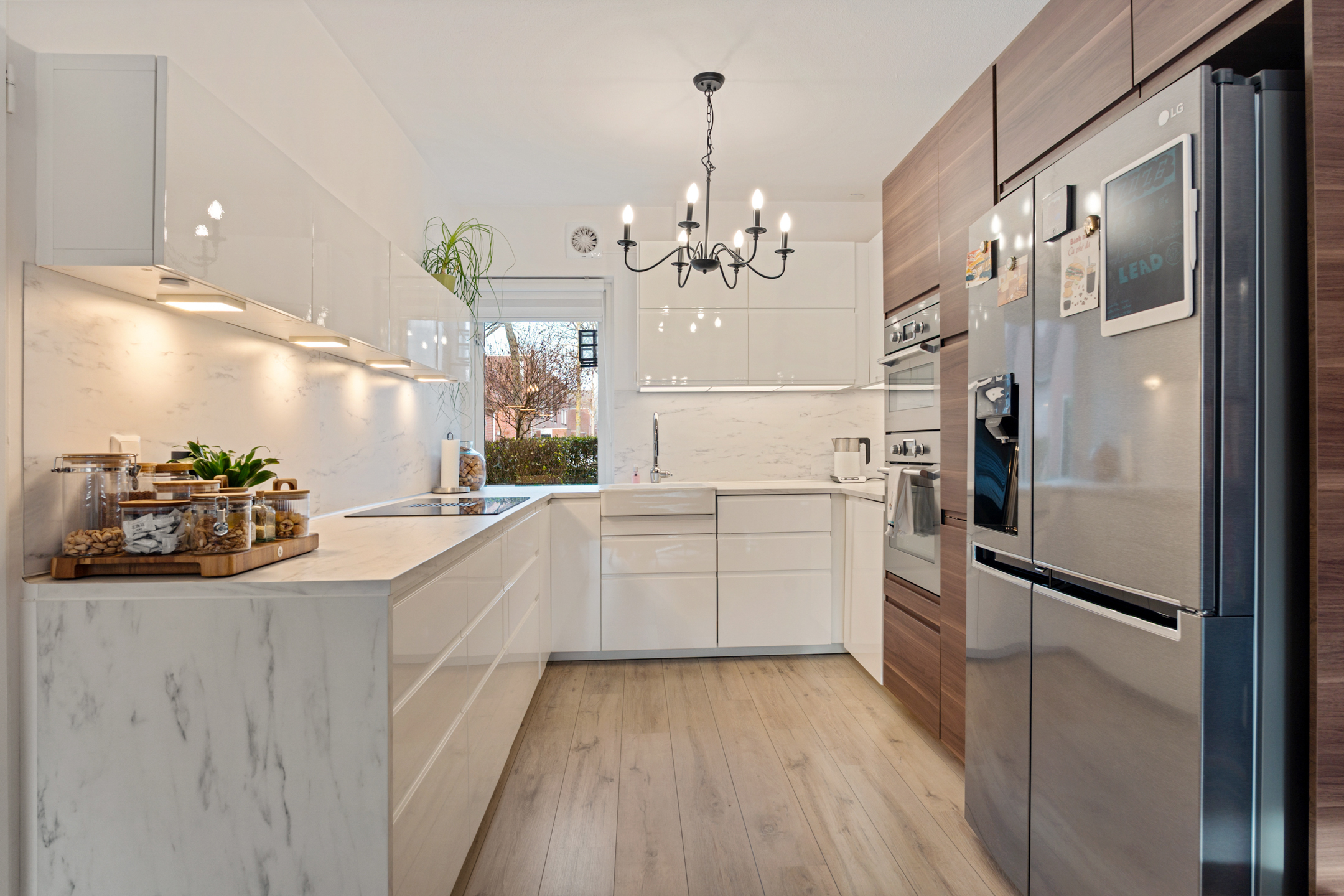 De half open keuken is praktisch ingericht en voorzien van diverse inbouwapparatuur, waaronder een gaskookplaat, vaatwasser, oven, afzuigkap, spoelbak en een koel-/vriescombinatie.