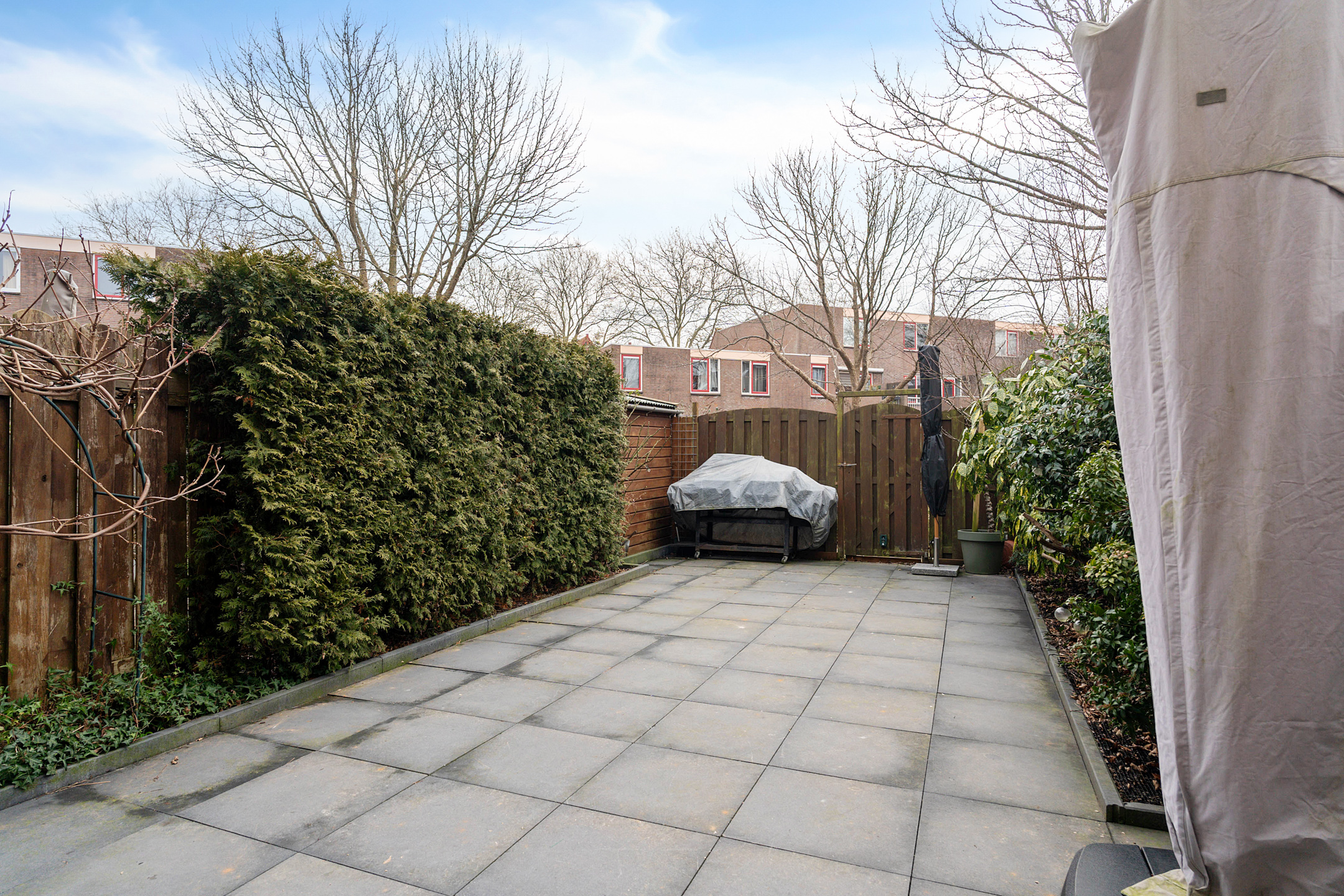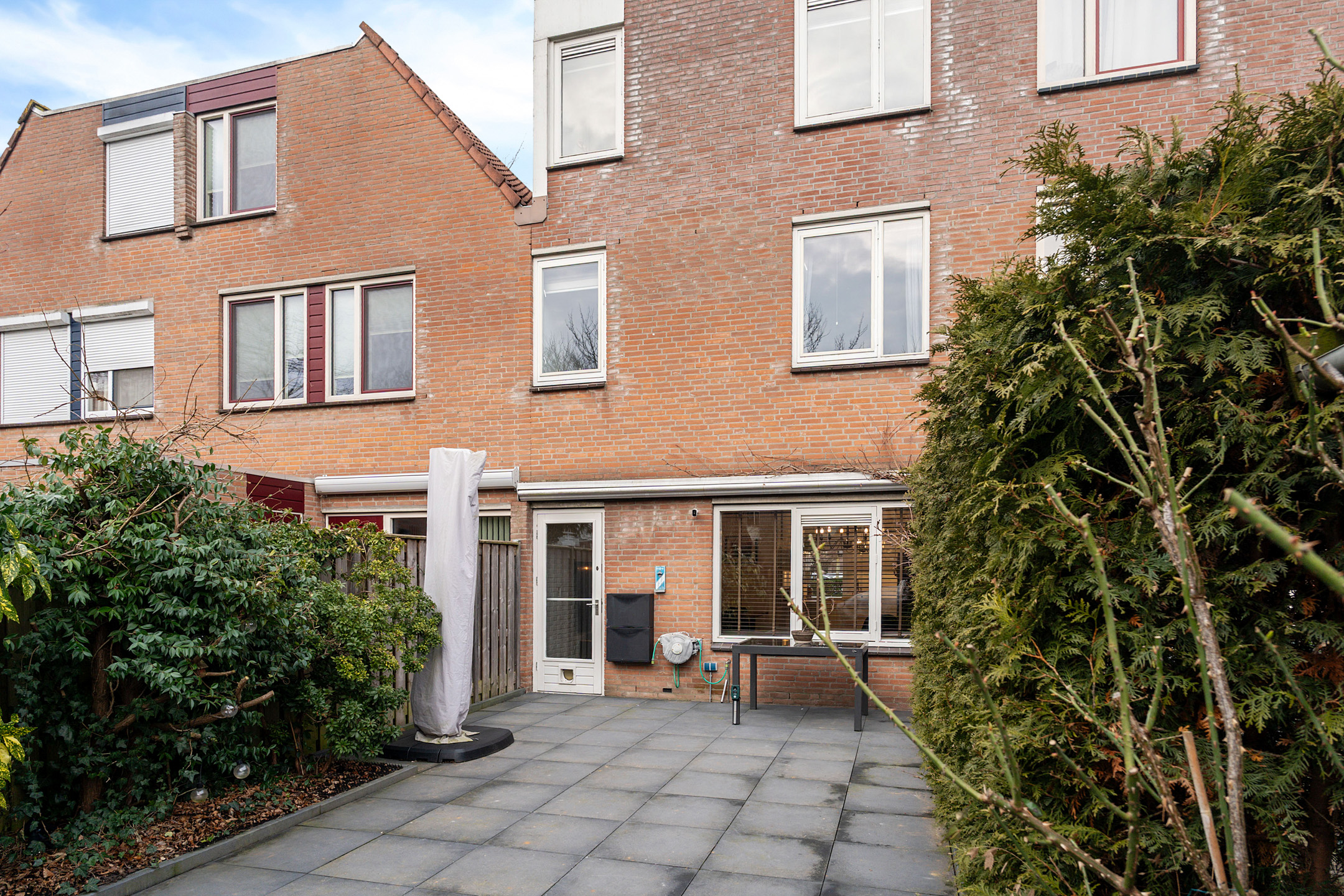 Doordat de tuin direct grenst aan een groen plantsoen ervaar je een vrij en ruimtelijk gevoel met extra privacy. Er is voldoende ruimte voor een comfortabele loungehoek, een grote eettafel of een speelplek voor kinderen. Een fijne buitenruimte waar je in alle rust kunt ontspannen.
