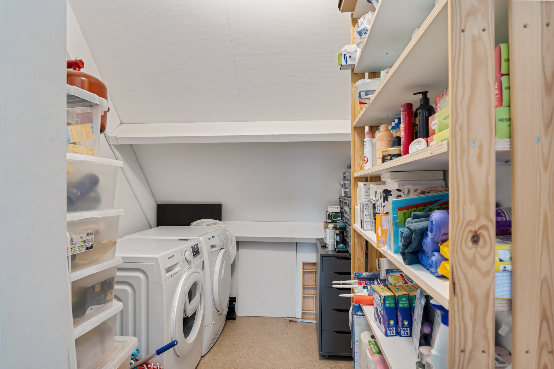 Daarnaast is er op deze verdieping een aparte kamer waar de cv-combiketel is geplaatst en waar tevens de wasmachine en droger kunnen worden opgesteld. Deze praktische ruimte zorgt voor extra comfort en functionaliteit.