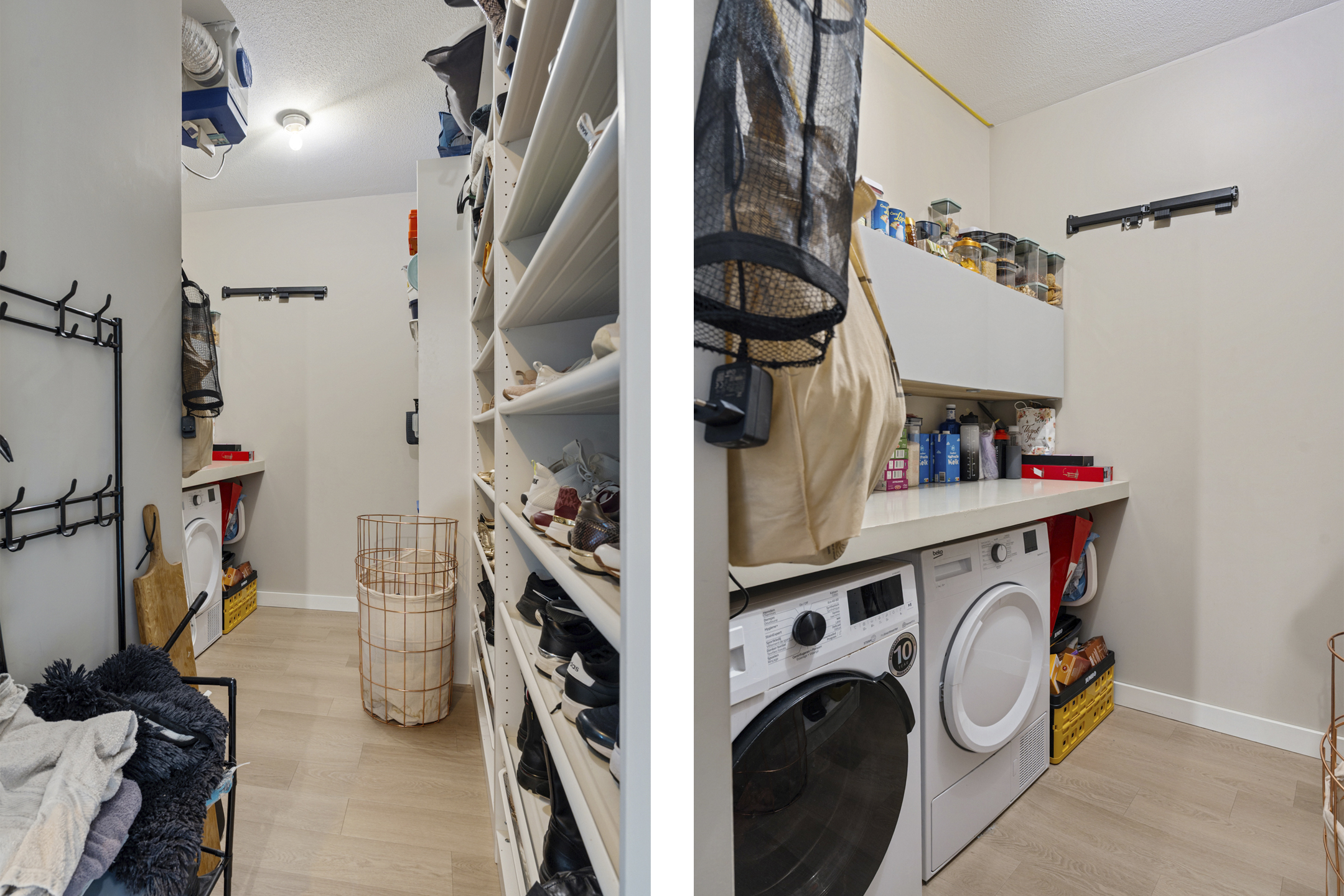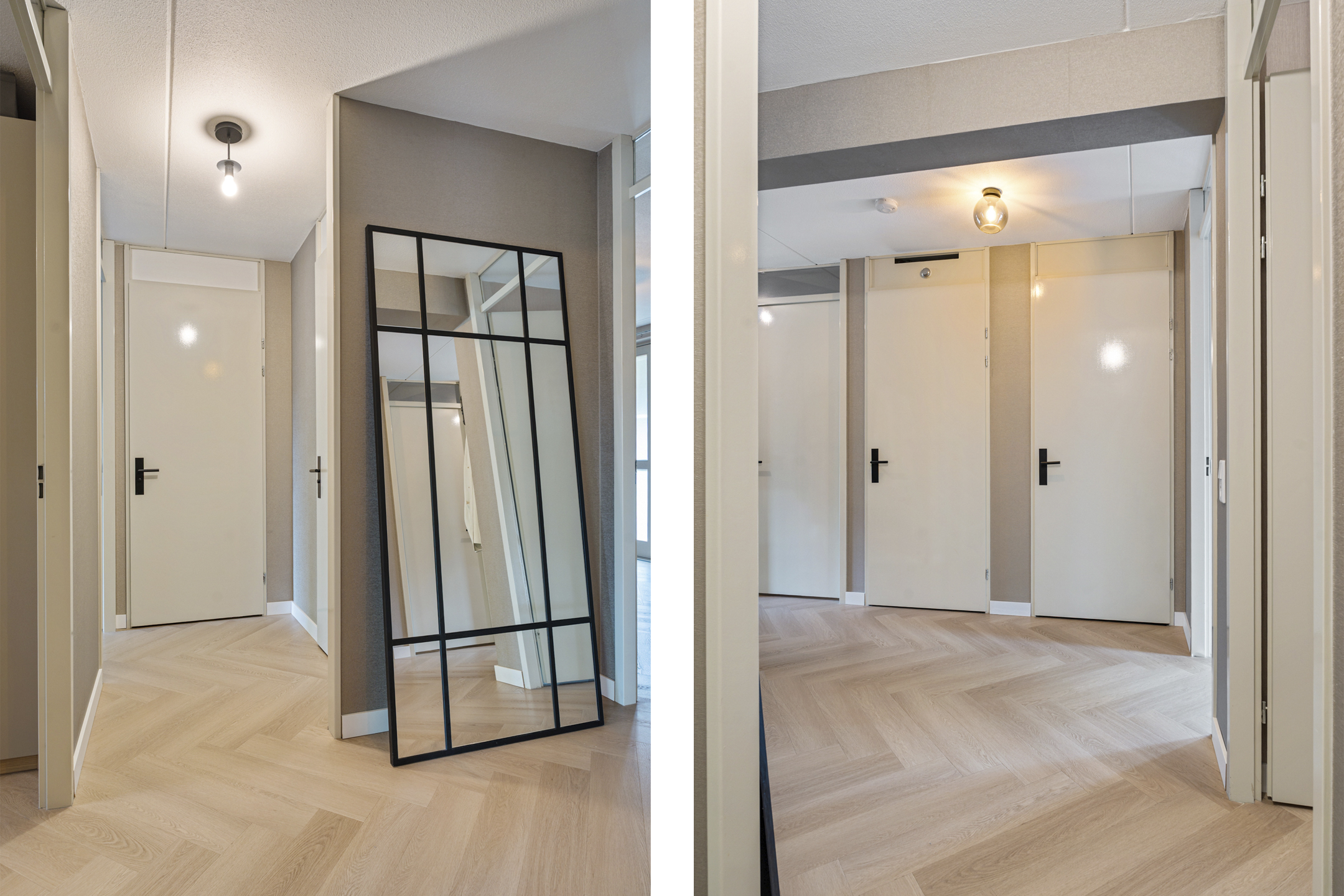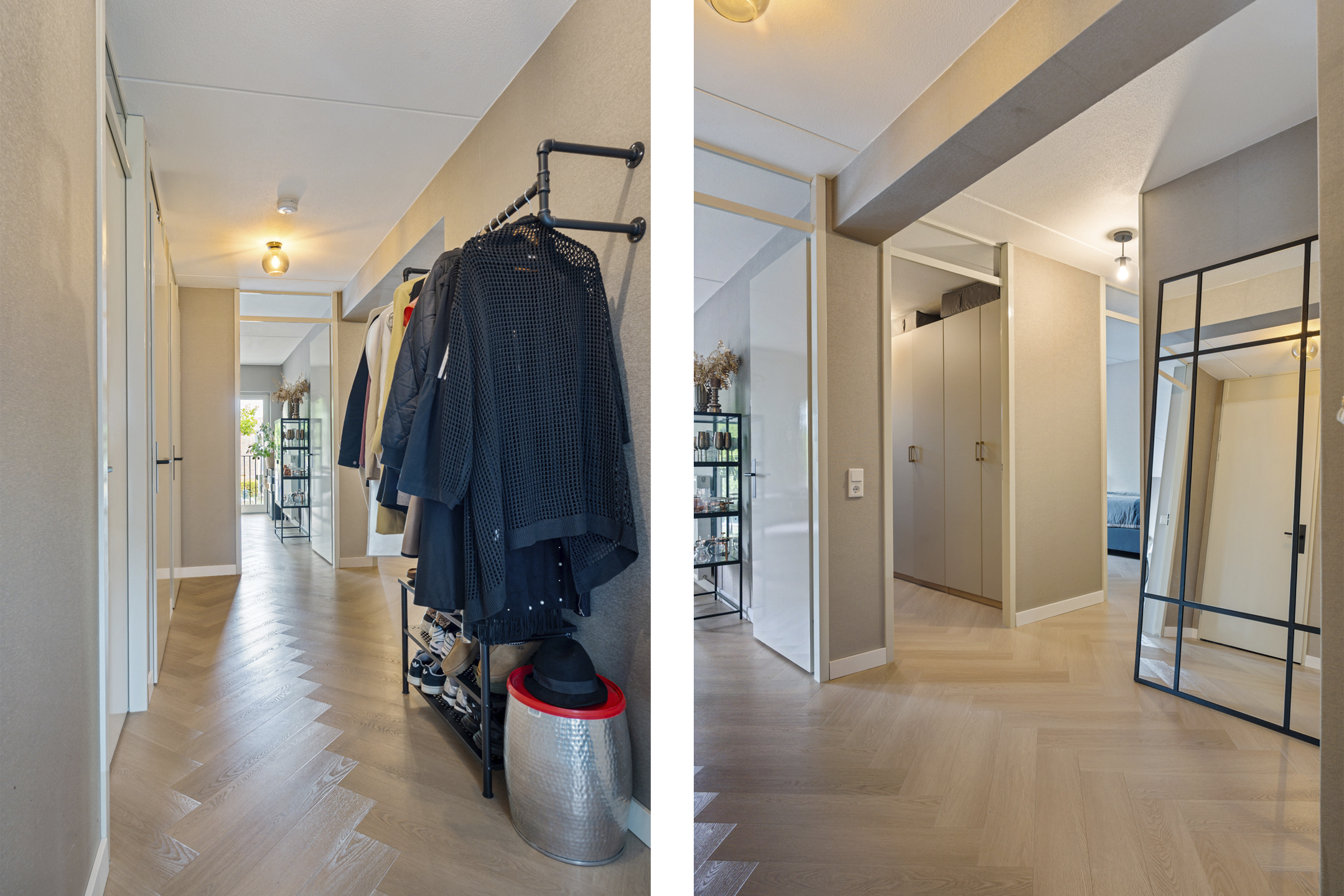 De ruime hal geeft toegang tot alle vertrekken en is voorzien van een stijlvolle pvc-visgraat vloer die overal is doorgelegd. Aan de hal liggen een modern separaat toilet in zwarttinten, een ruime berging met aansluitingen voor wasmachine en droger en de toegang tot de woonkamer.