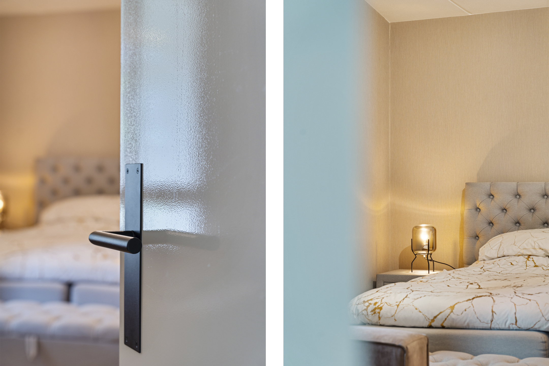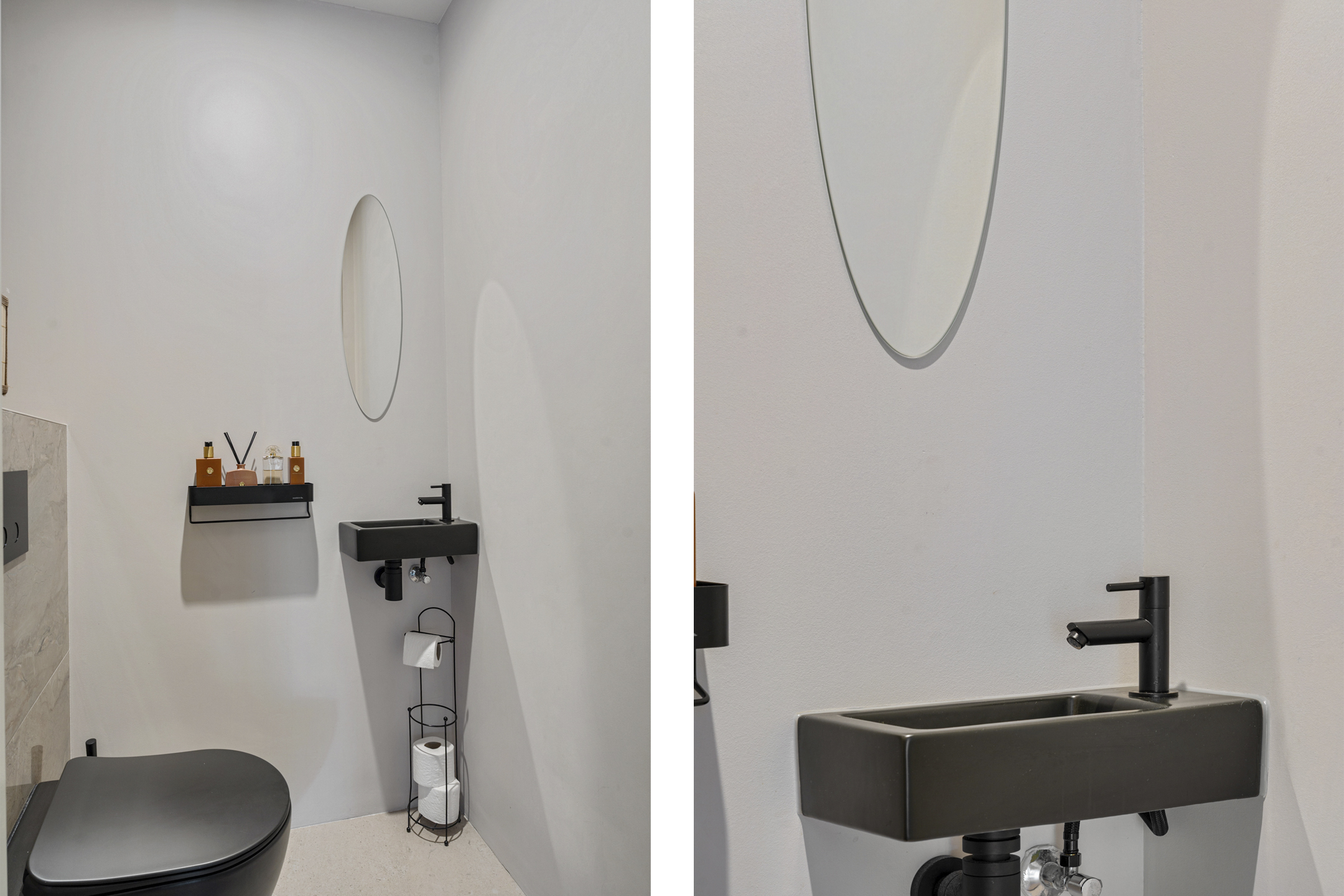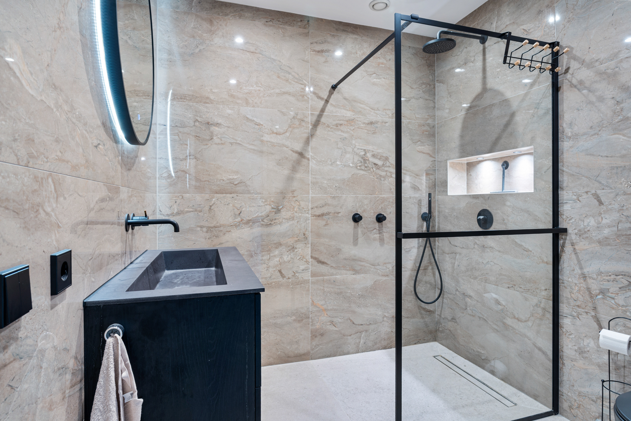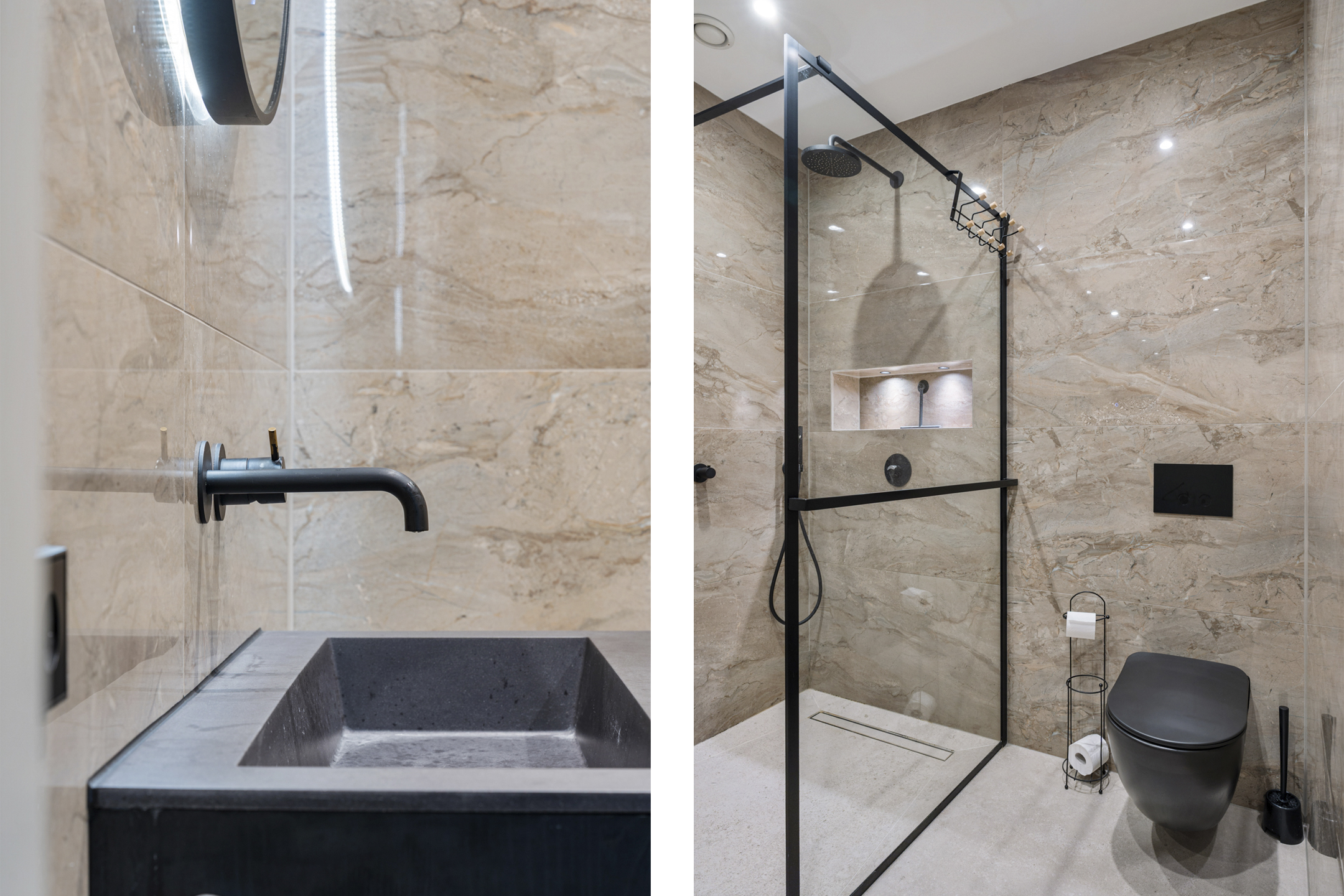 De badkamer straalt pure luxe uit. Grote licht marmeren tegels, zwarte accenten en een strakke afwerking geven de ruimte een elegante uitstraling. De inloopdouche is ruim en er is een tweede toilet en een modern wastafelmeubel. Alles klopt tot in de details.