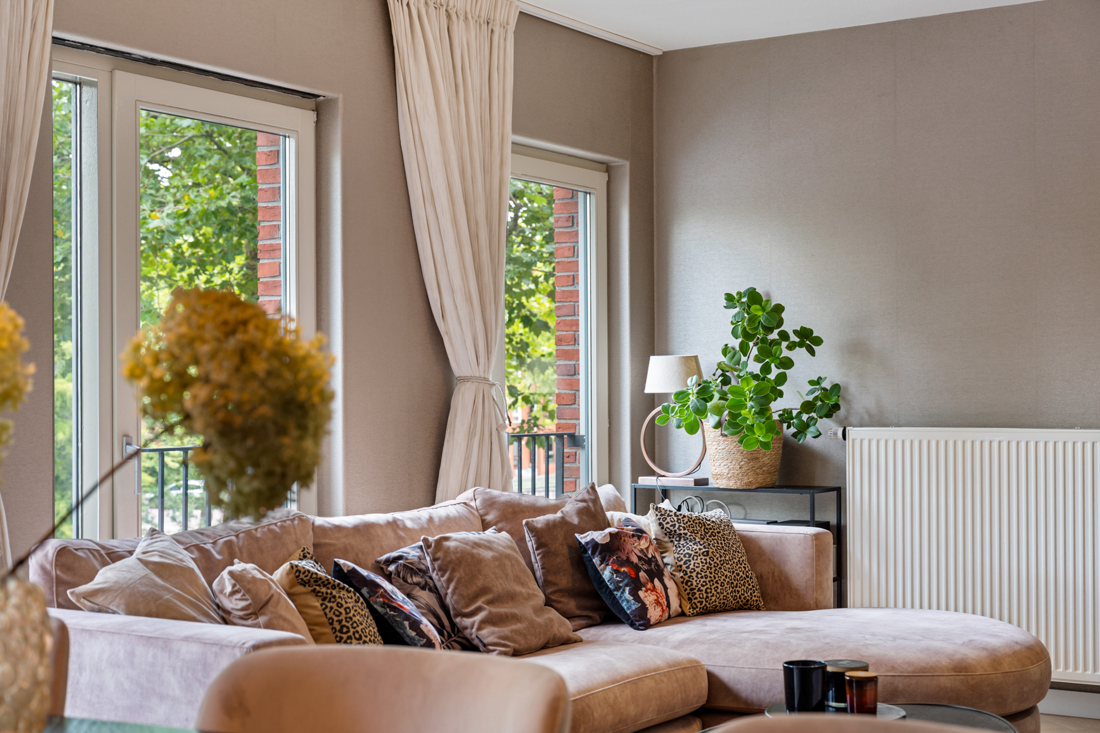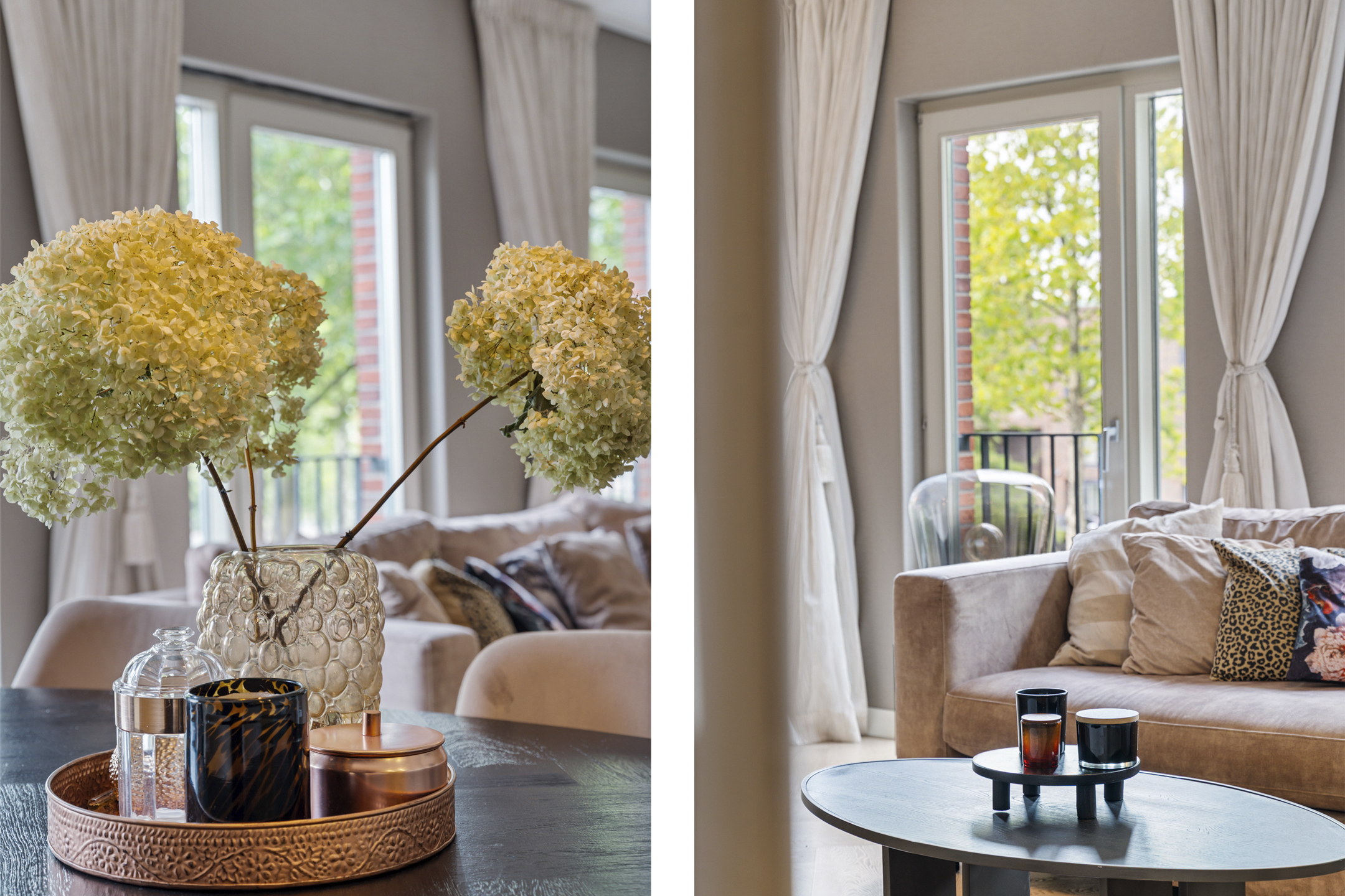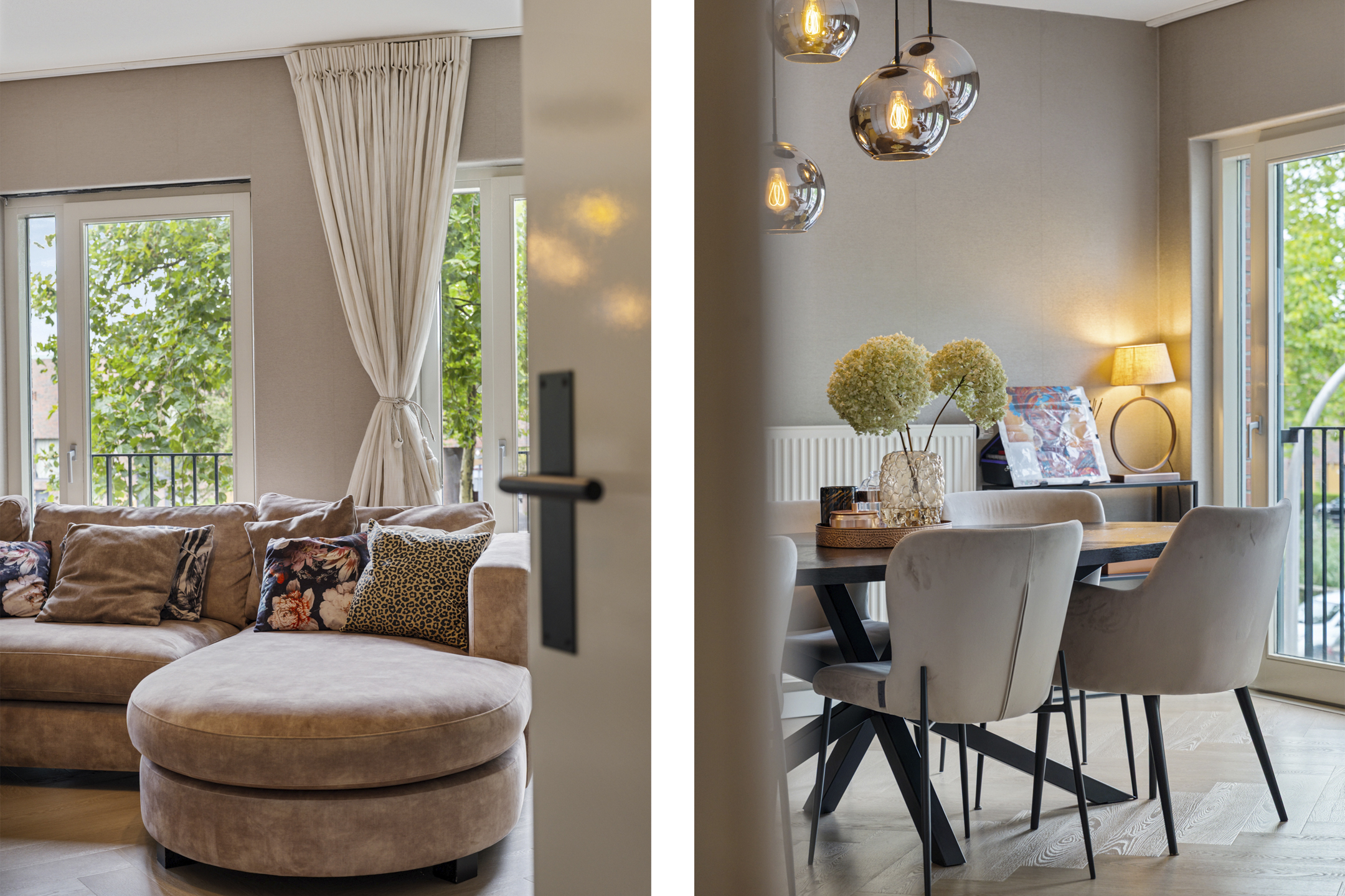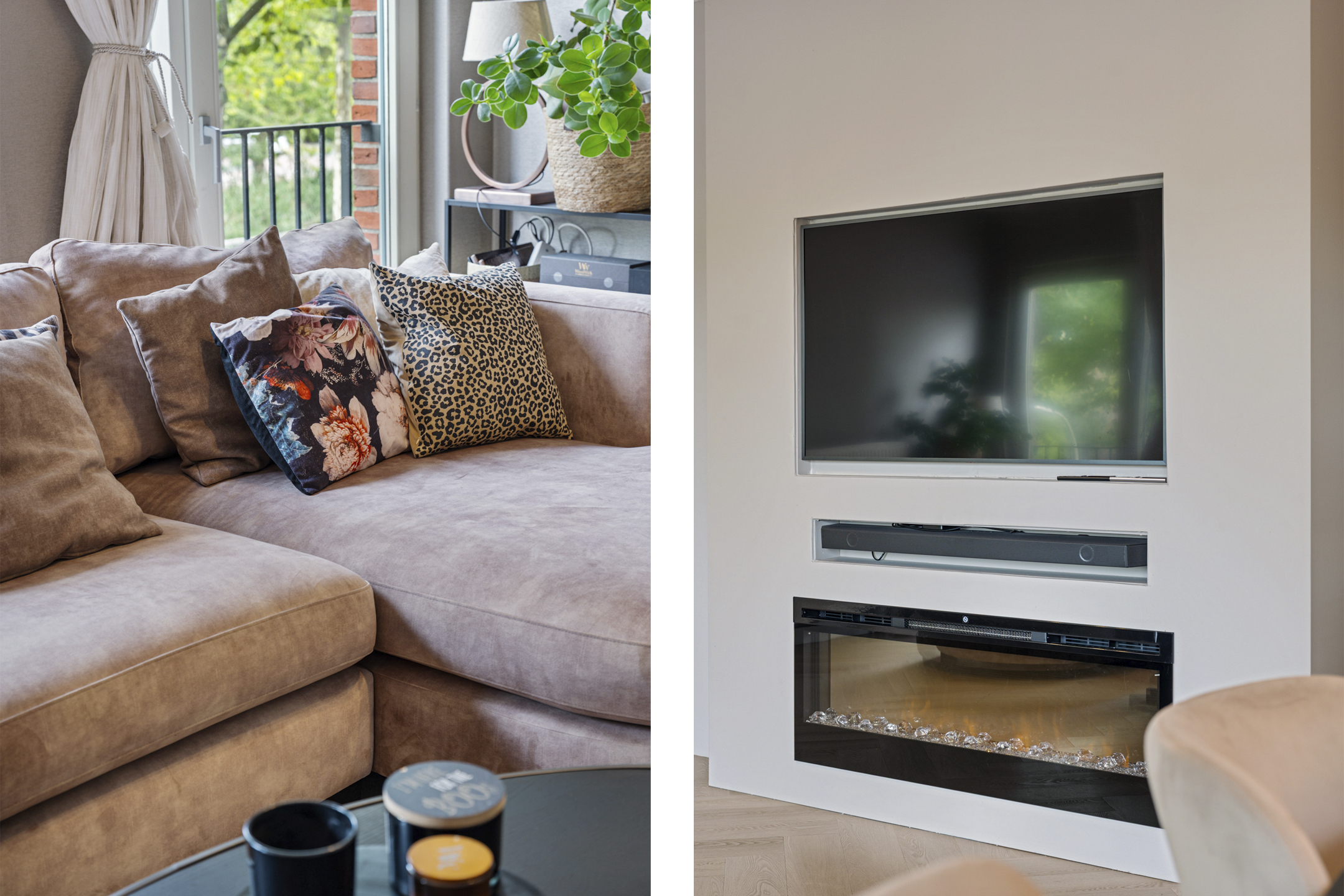 De woonkamer is heerlijk licht dankzij de grote raampartijen en meerdere Franse balkons. De cine Wall met ingebouwde sfeerhaard vormt een sfeervol middelpunt van de ruimte.