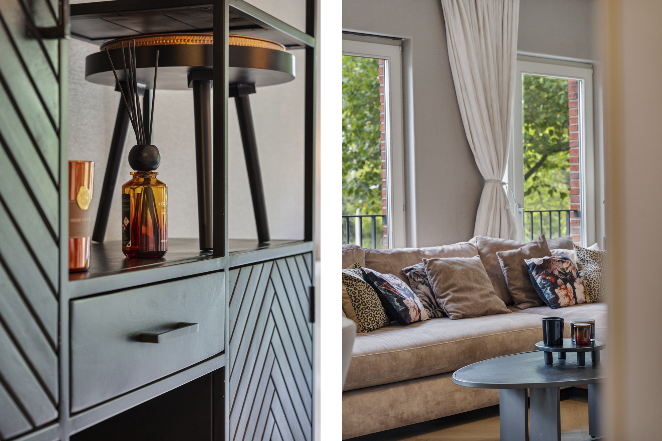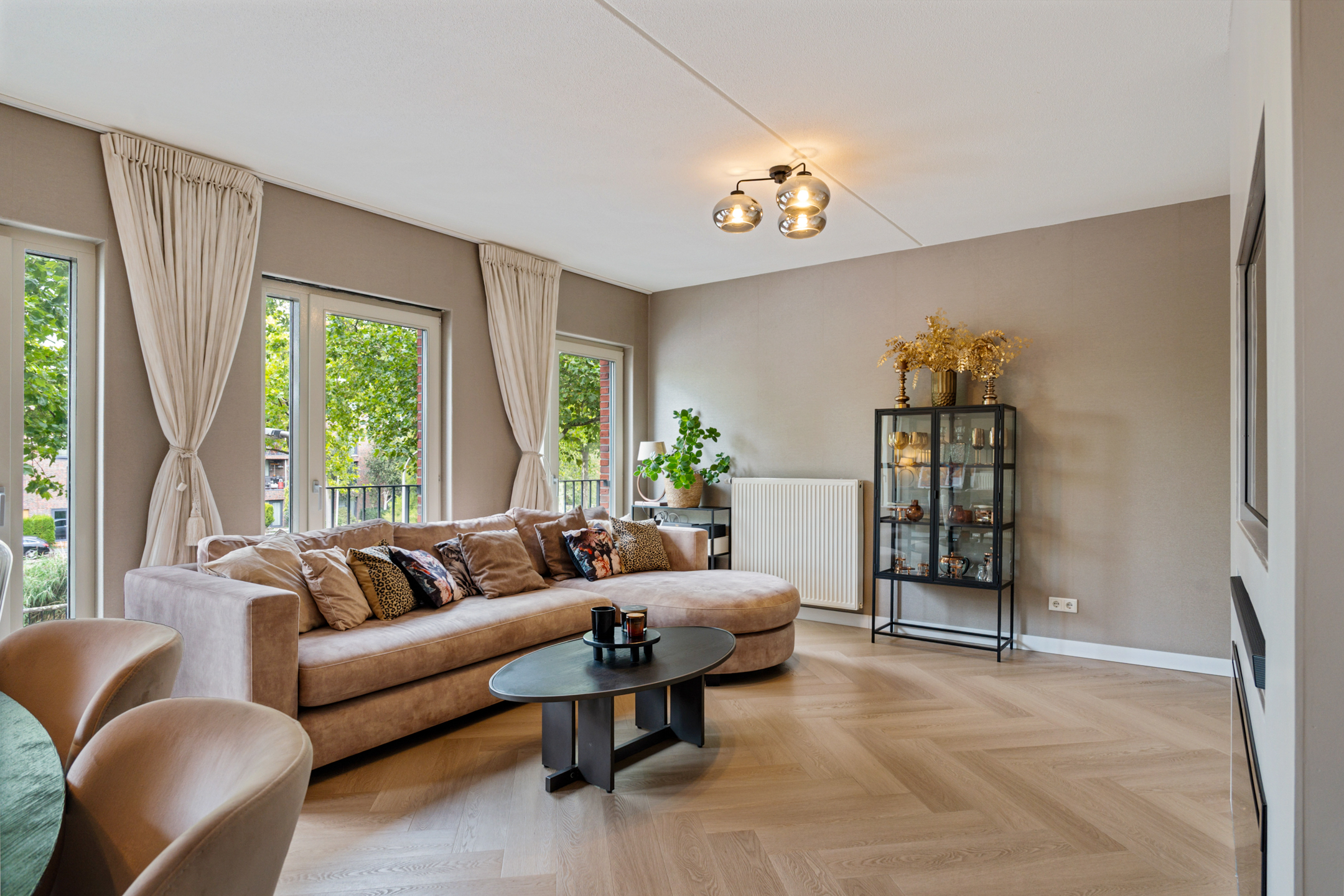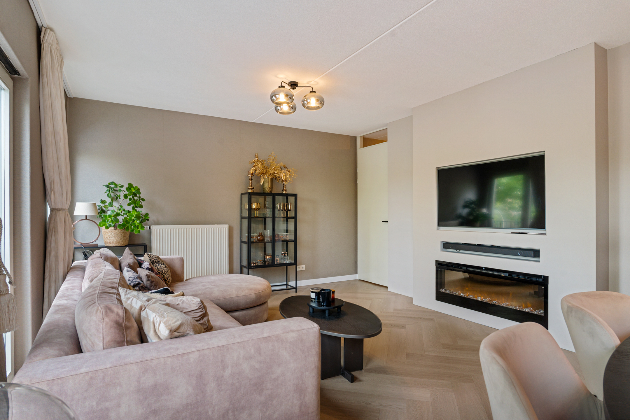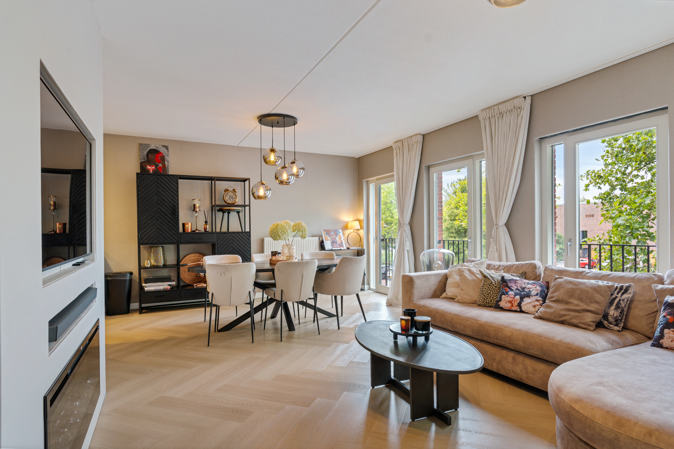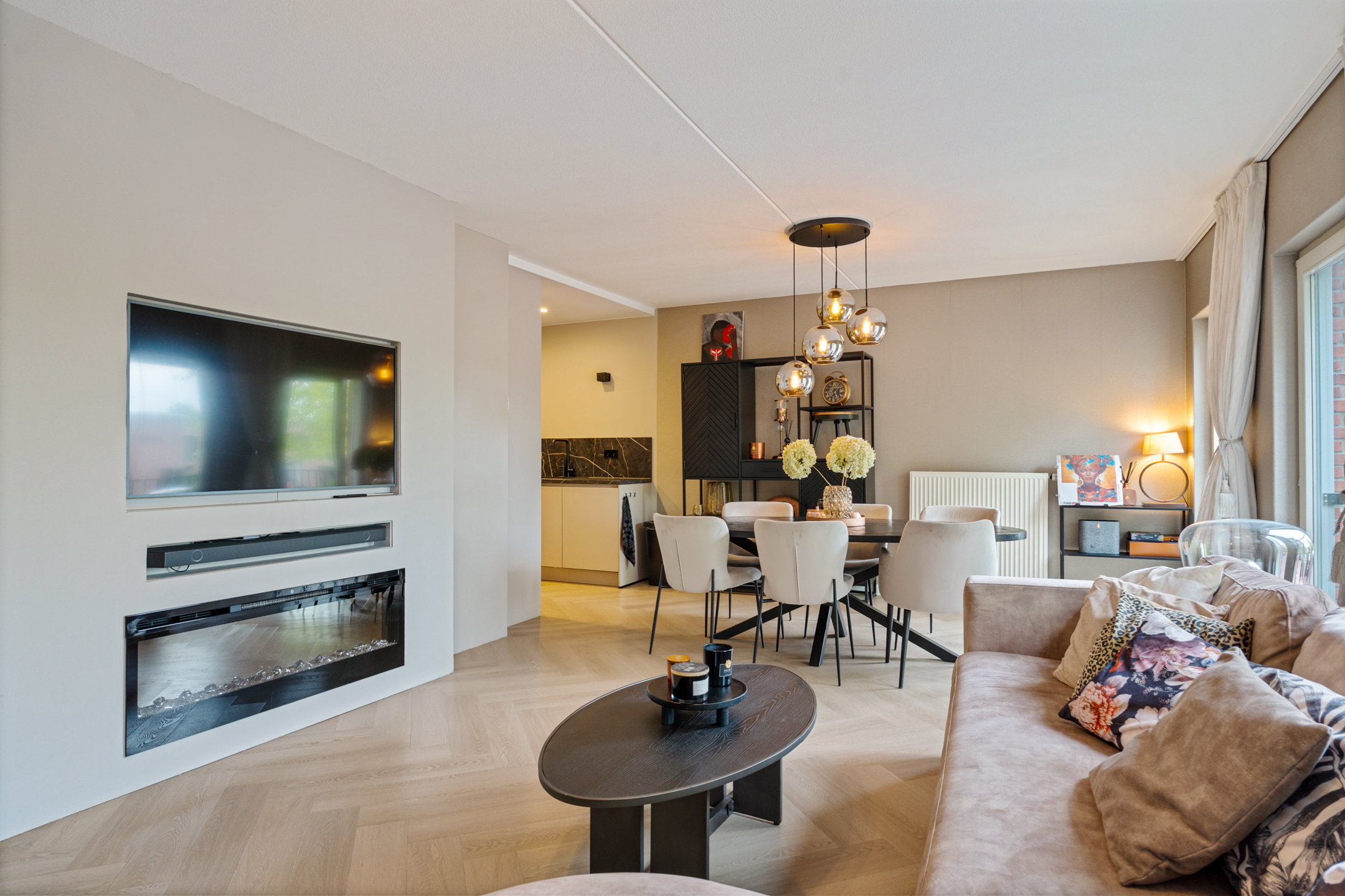 De woonkamer is heerlijk licht dankzij de grote raampartijen en meerdere Franse balkons. De cine Wall met ingebouwde sfeerhaard vormt een sfeervol middelpunt van de ruimte.