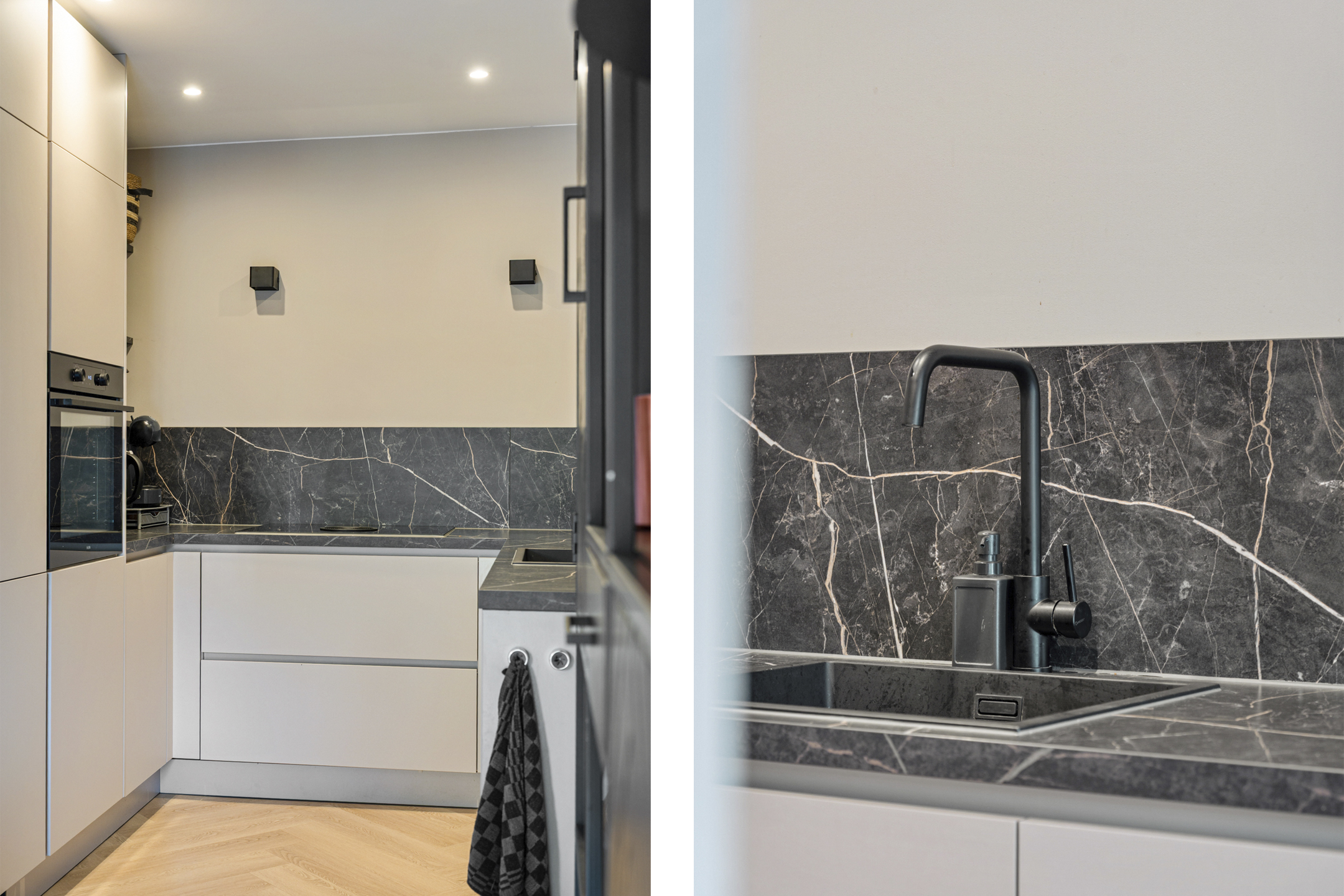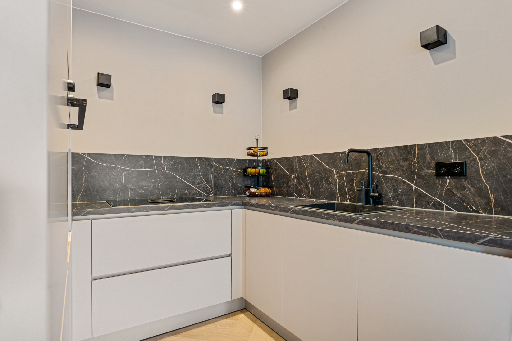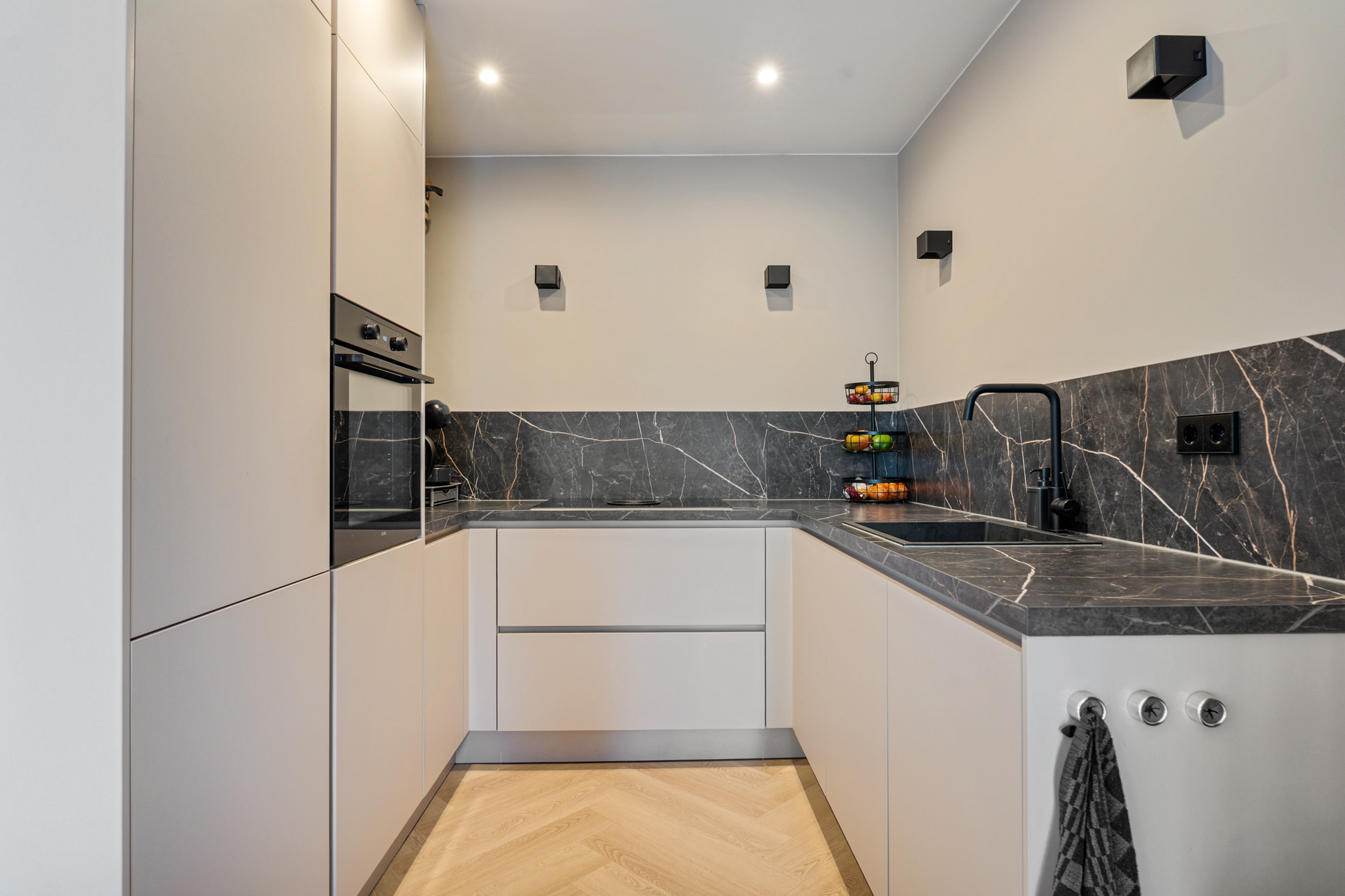 De open keuken is een echte blikvanger. Uitgevoerd in matgrijs met een zwart marmeren werkblad, biedt deze U-opstelling niet alleen veel werkruimte maar ook een moderne, luxe uitstraling. De keuken is compleet uitgerust met hoogwaardige inbouwapparatuur, waaronder een koelkast, vriezer, vaatwasser, oven, inductiekookplaat met geïntegreerde afzuiging en veel opbergruimte.