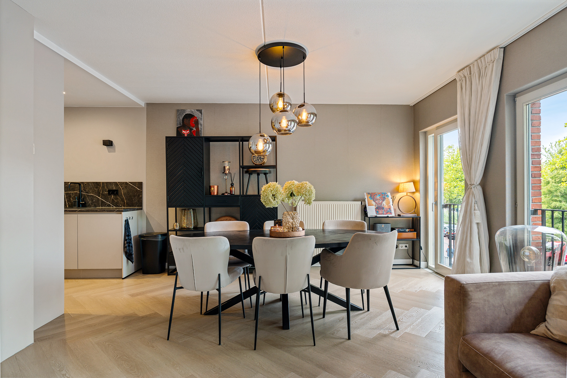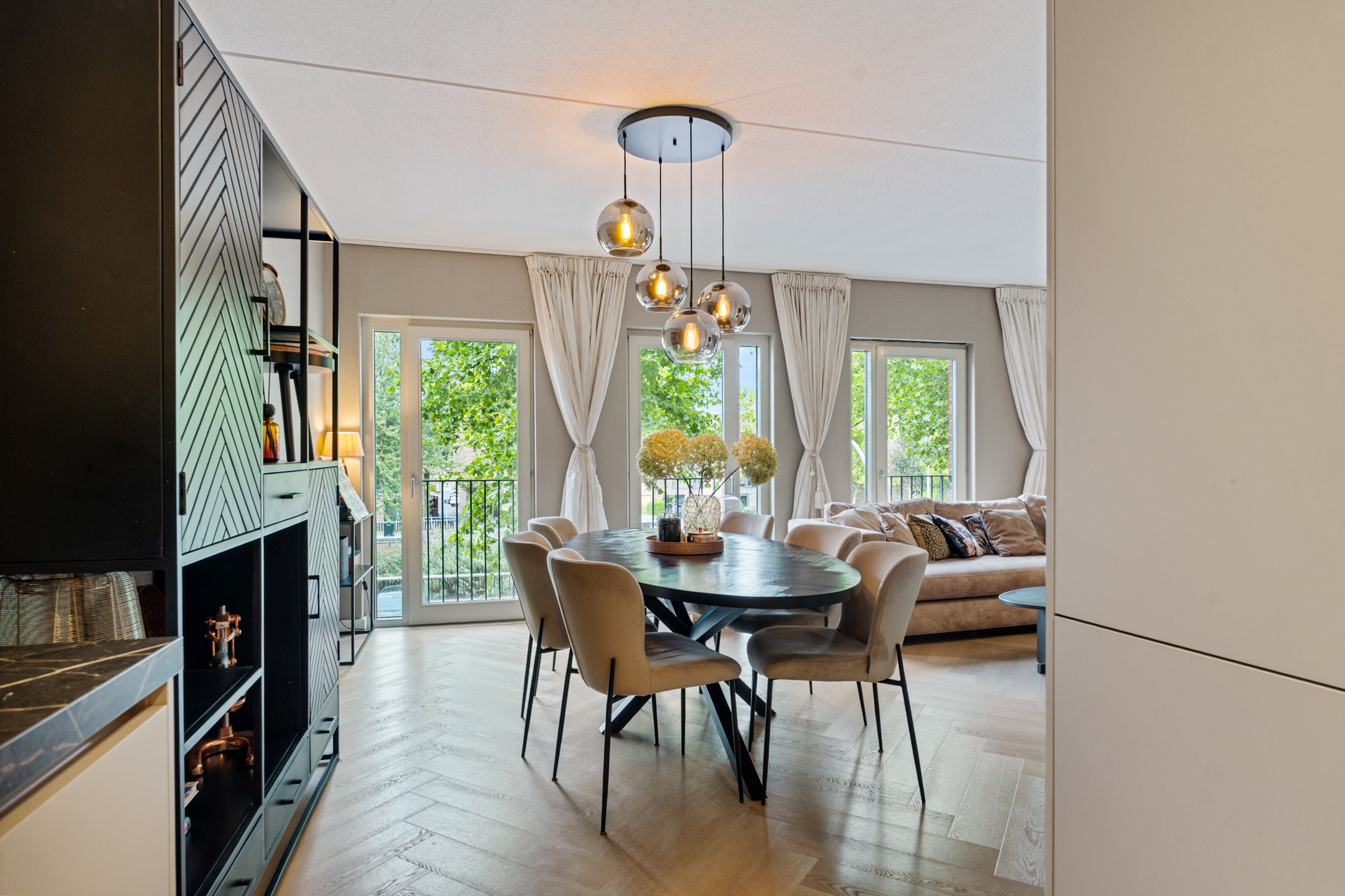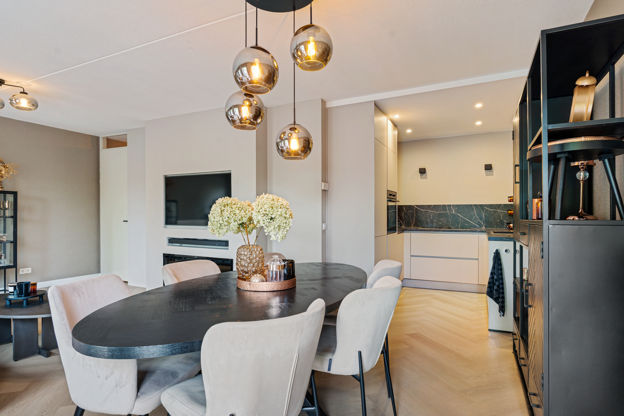 De open keuken is een echte blikvanger. Uitgevoerd in matgrijs met een zwart marmeren werkblad, biedt deze U-opstelling niet alleen veel werkruimte maar ook een moderne, luxe uitstraling. De keuken is compleet uitgerust met hoogwaardige inbouwapparatuur, waaronder een koelkast, vriezer, vaatwasser, oven, inductiekookplaat met geïntegreerde afzuiging en veel opbergruimte.