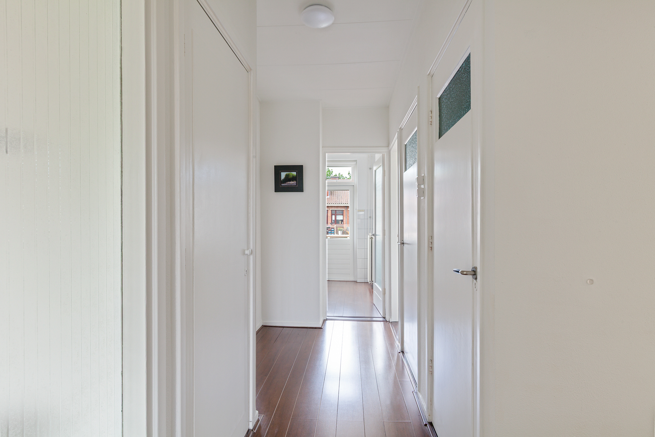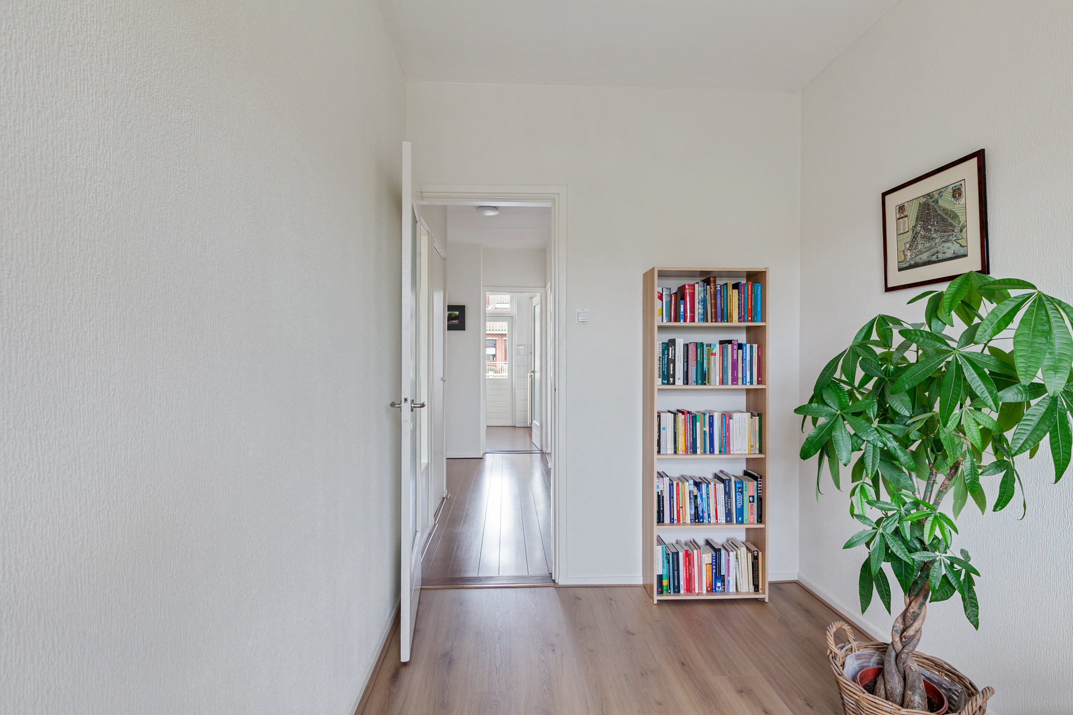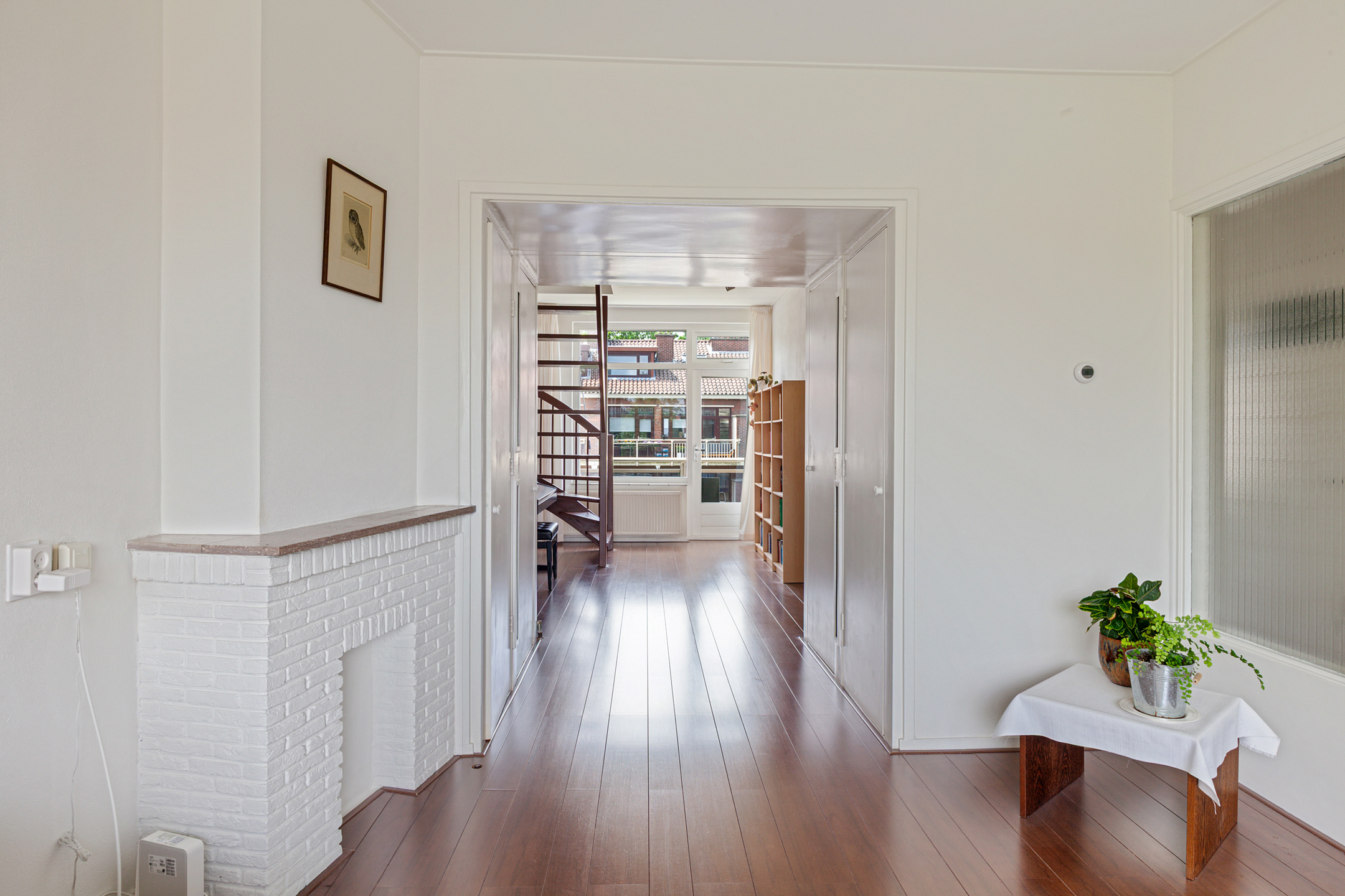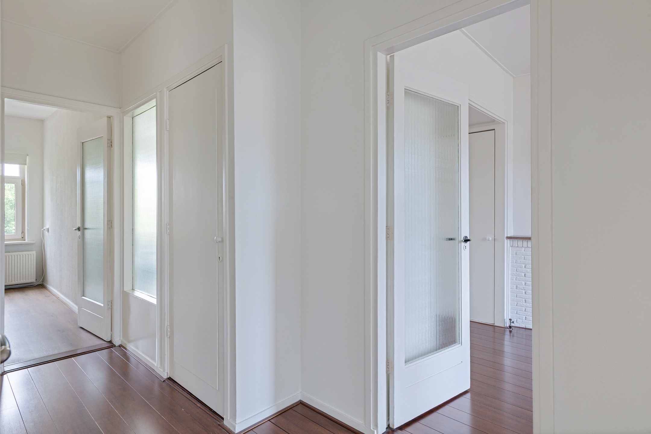 Je komt binnen in een ruime hal die toegang geeft tot alle vertrekken, waaronder een separaat toilet, de badkamer en een praktische bergkast.