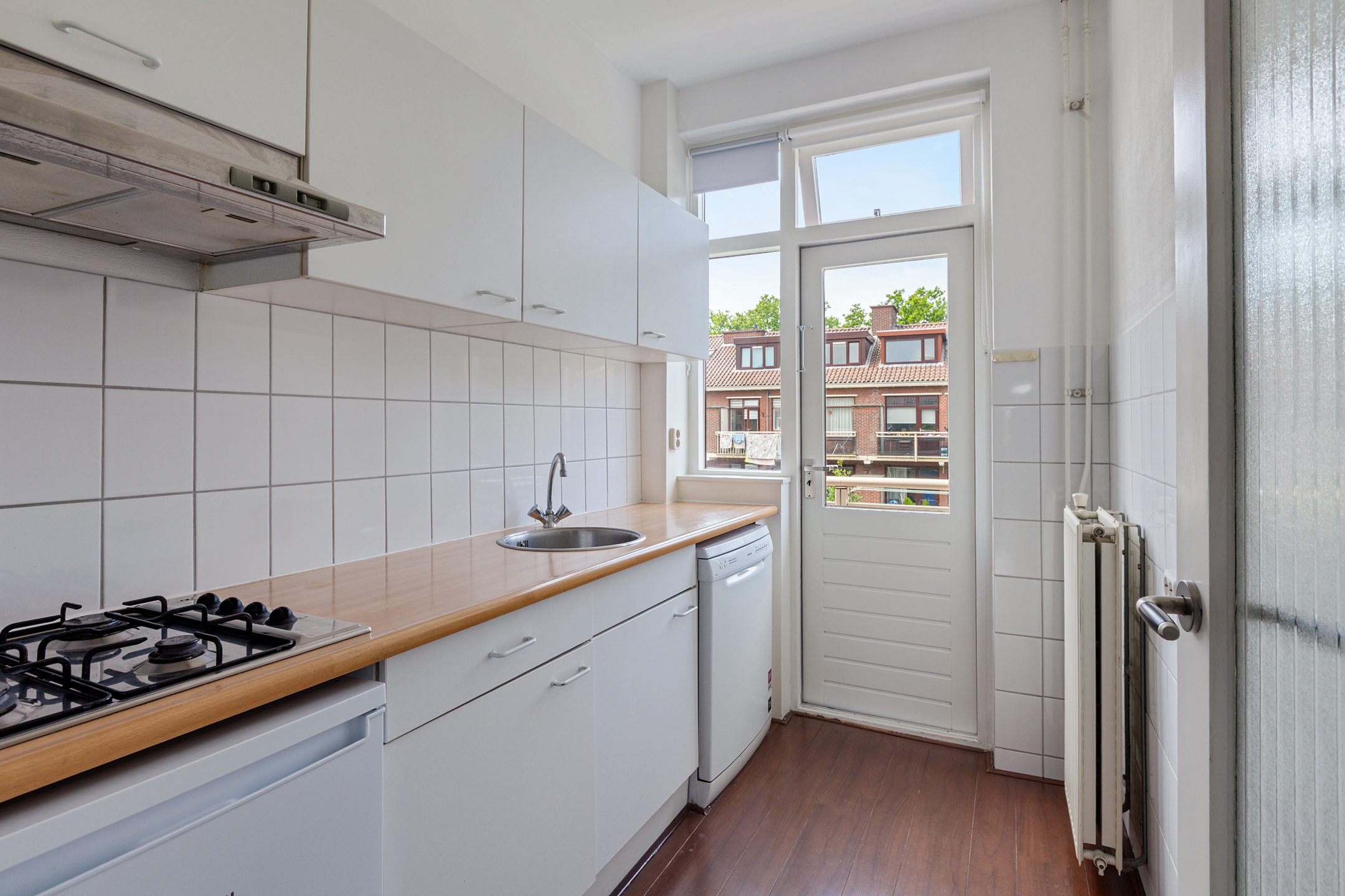 Grenzend aan de woonkamer bevindt zich de gesloten, nette keuken met kunststof werkblad, gaskookplaat, afzuigkap, koelkast en vaatwasser, die eveneens toegang biedt tot het balkon. Verder zijn er op deze verdieping twee slaapkamers: één aan de voorzijde en één aan de achterzijde. Ook via de achterste slaapkamer bereik je het balkon.