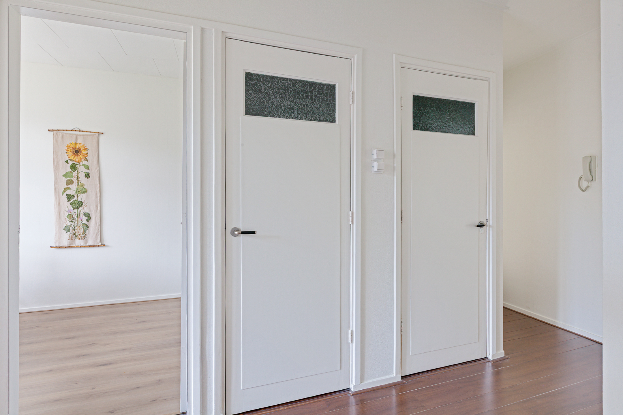 You enter into a generous hallway that provides access to all rooms, including a separate toilet, the bathroom, and a practical storage closet.