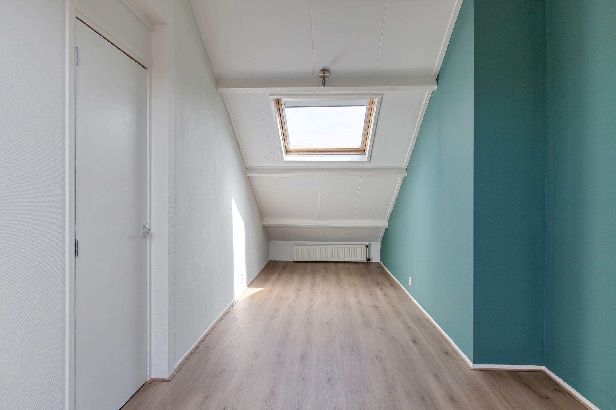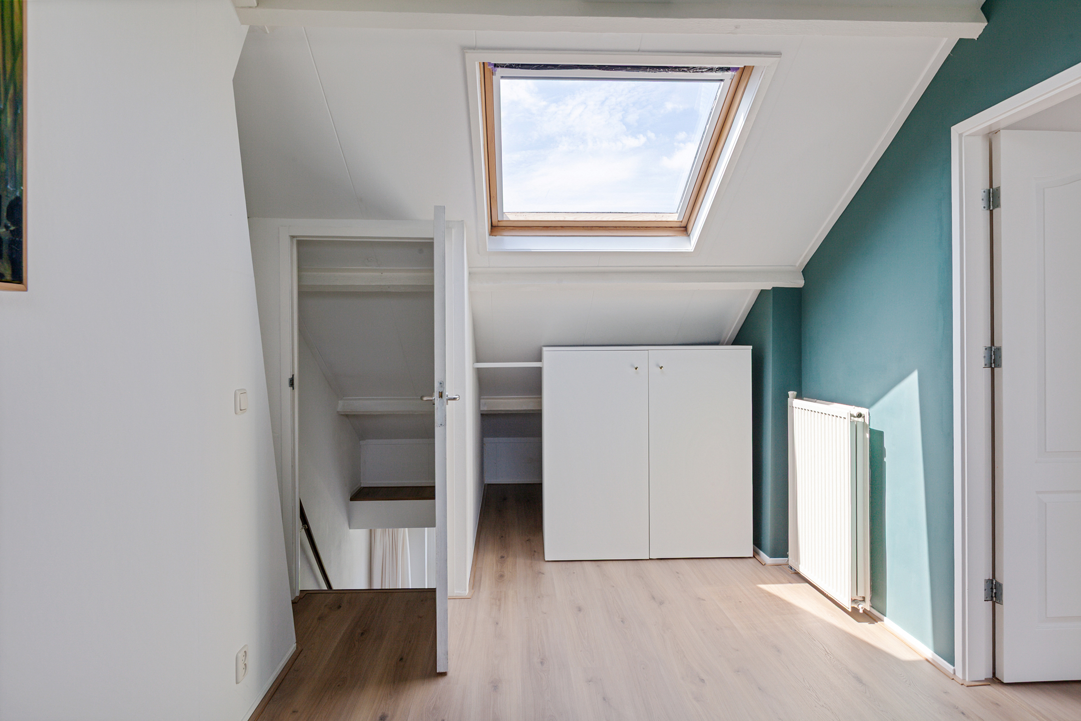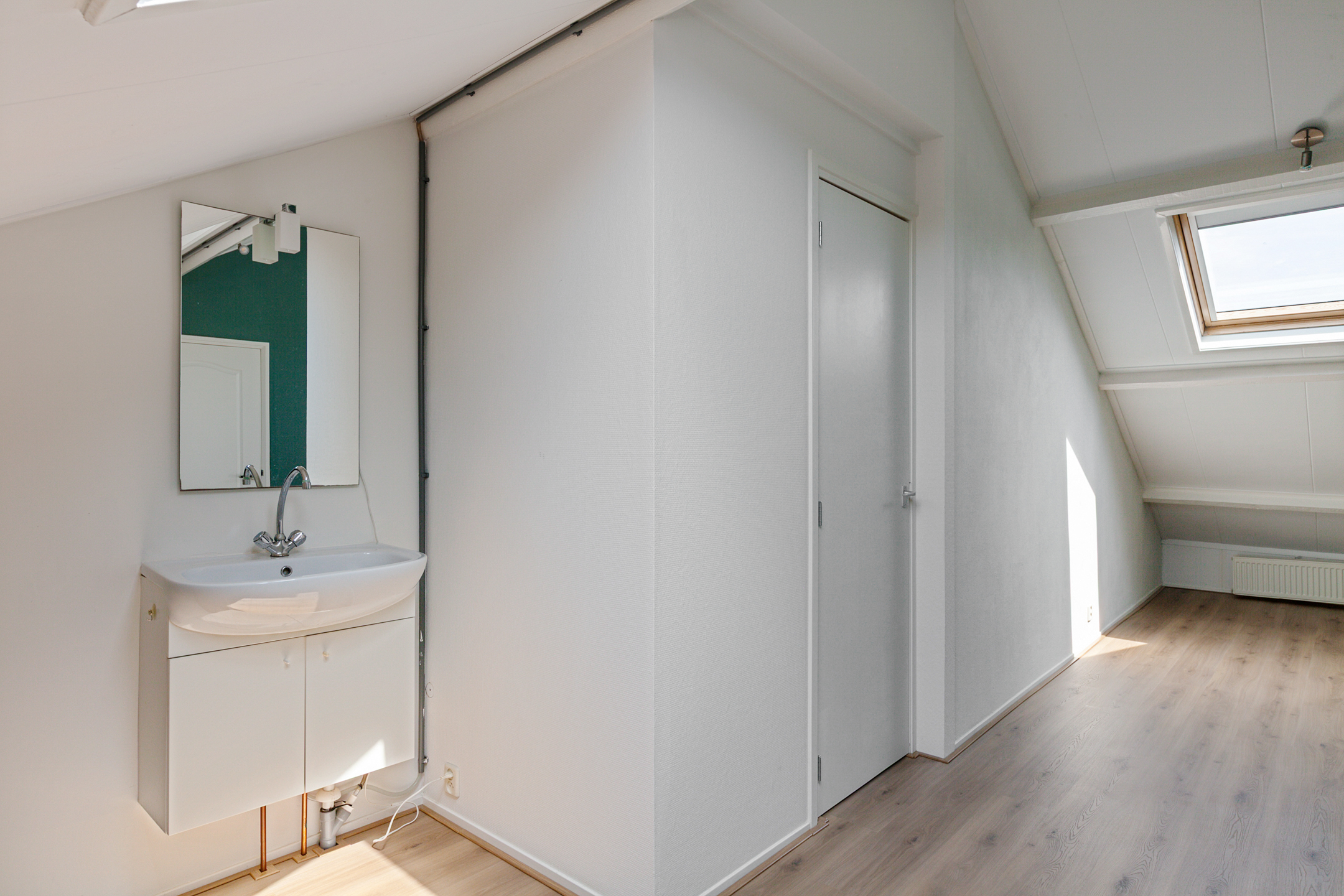 De trap in de woonkamer brengt je naar de bovenverdieping, waar je direct binnenkomt in de derde slaapkamer. Deze is voorzien van twee dakramen en biedt voldoende ruimte voor een bed en kastruimte. Aan de achterzijde ligt de vierde slaapkamer, eveneens met twee dakramen, een wastafel en een afgesloten berging met wasmachineaansluiting. Deze verdieping is volledig voorzien van een nieuwe laminaat vloer.